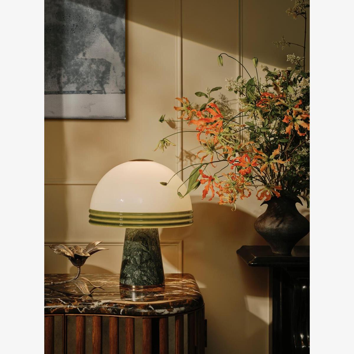 This table lamp combines a delicate glass shade with a solid, tapered base made from green marble. Made from glass finished with rippled detailing around the rim, the domed shade of the Cassie table lamp gives a soft, ambient glow. The base is made from solid Verde Guatemala marble sourced from India.