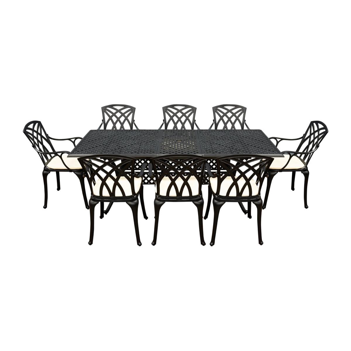 Enjoy your spring and summer in style with the Signature Homes & Gardens Cast Aluminium Dining Set, designed to offer both elegance and durability for your garden or conservatory. The powder-coated finish not only provides a sleek and modern look but also offers enhanced protection against rust, ensuring your dining set stays beautiful for years to come. This set includes cream seat pad cushions for added comfort, allowing you to enjoy your meals or outdoor gatherings in total relaxation. The table is designed with a parasol hole in the centre, making it easy to add some shade when needed. Whether you're hosting a garden party or having a quiet meal outdoors, the adjustable feet provide added stability, ensuring your table and chairs stay steady on uneven surfaces. The set includes 8 powder-coated cast aluminium chairs, offering a durable and stylish seating option for your guests.