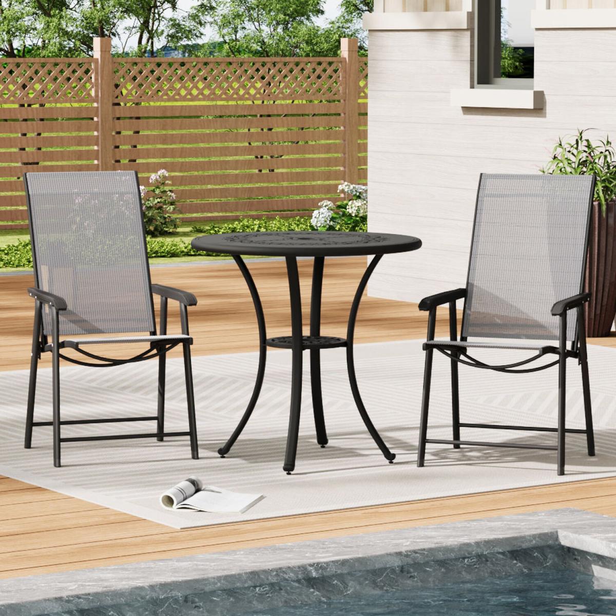 Cast Aluminium Round Patio Dining Table with 2 Folding Chairs Set - Black / 65cm