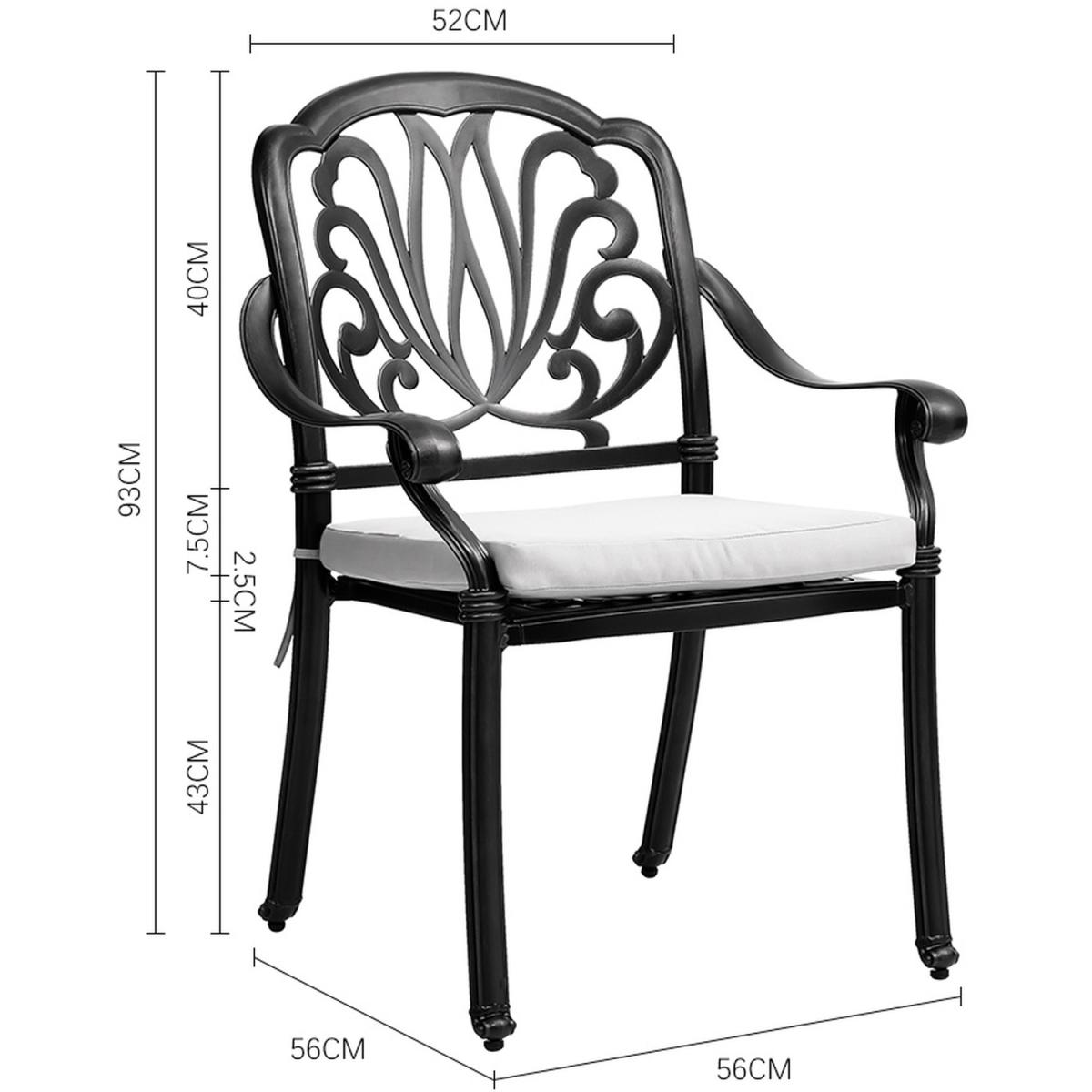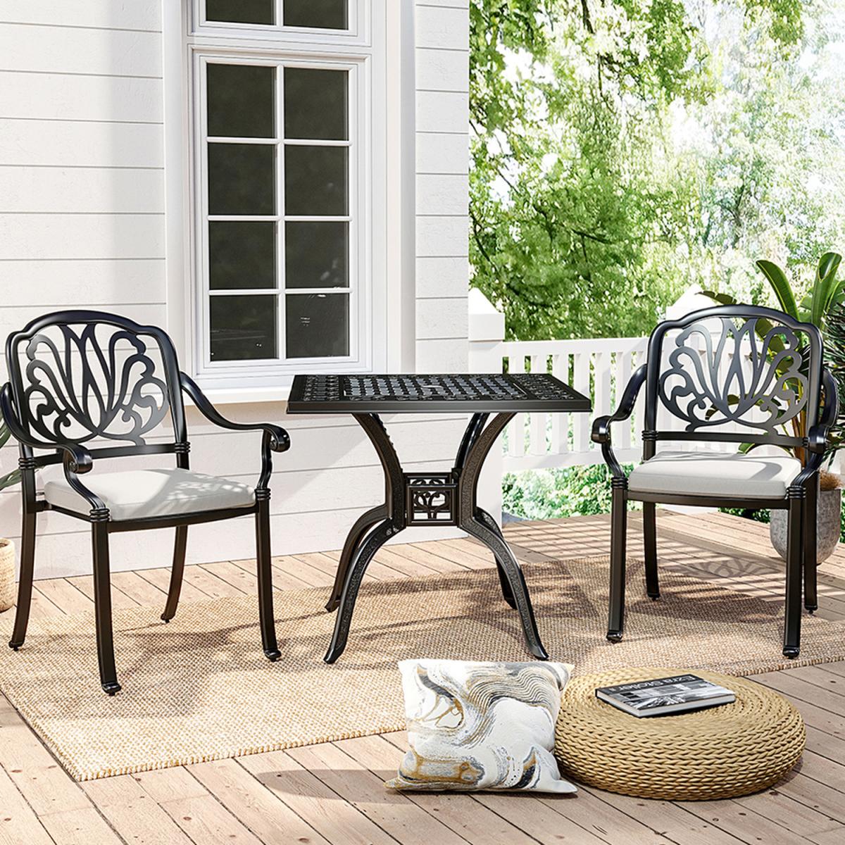 Enjoy outdoor dining and relaxation with the Livingandhome stylish 3-piece garden table and chair set. This set comes with two dining chairs and a square table, all with elegant decorative details that can add visual depth to your outdoor space. And it employs fine cast aluminum material that makes it more durable and adaptable in outdoor spaces. Each chair is paired with a comfortable cushion for a comfortable seating experience.