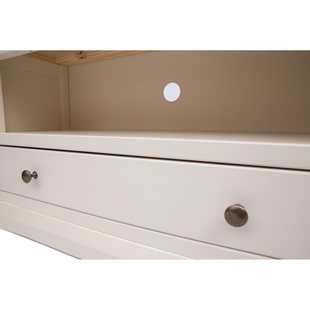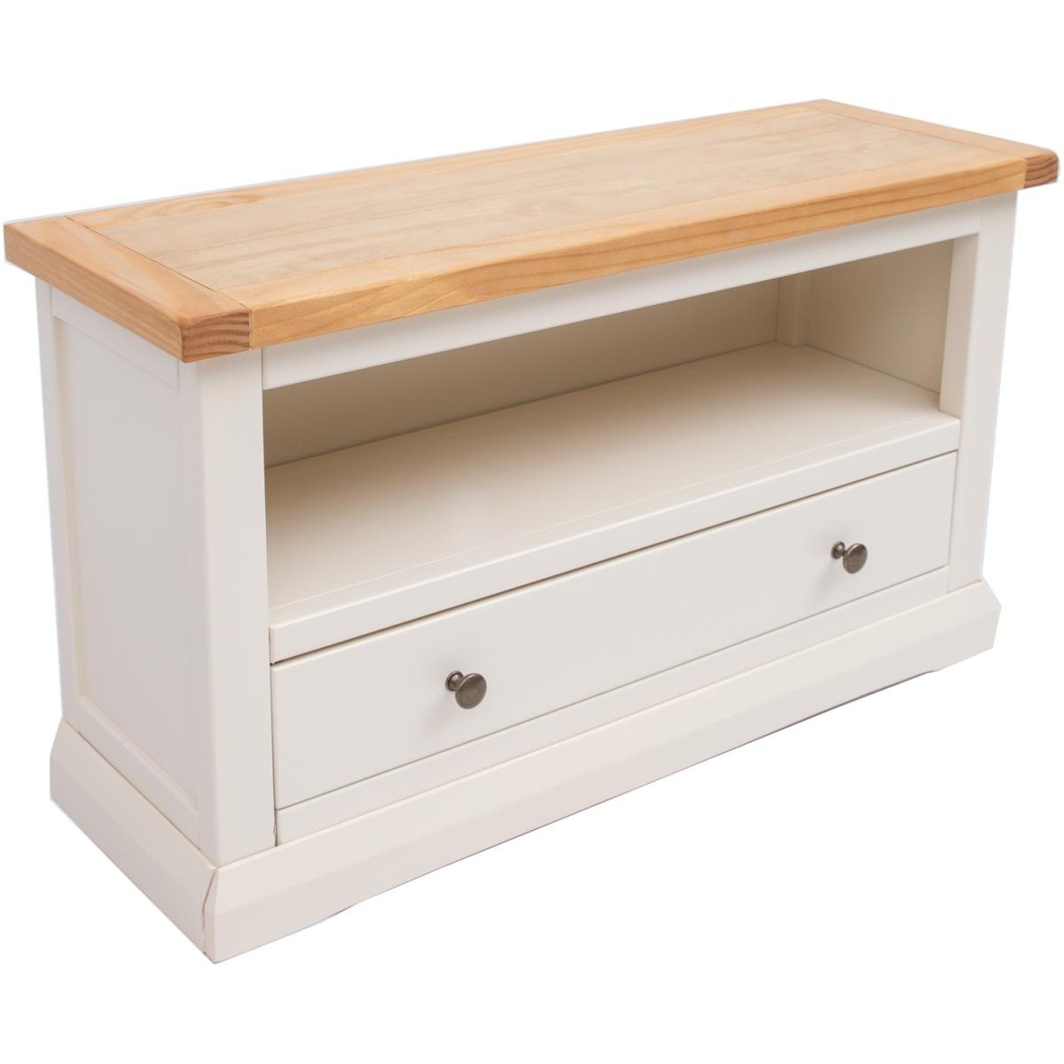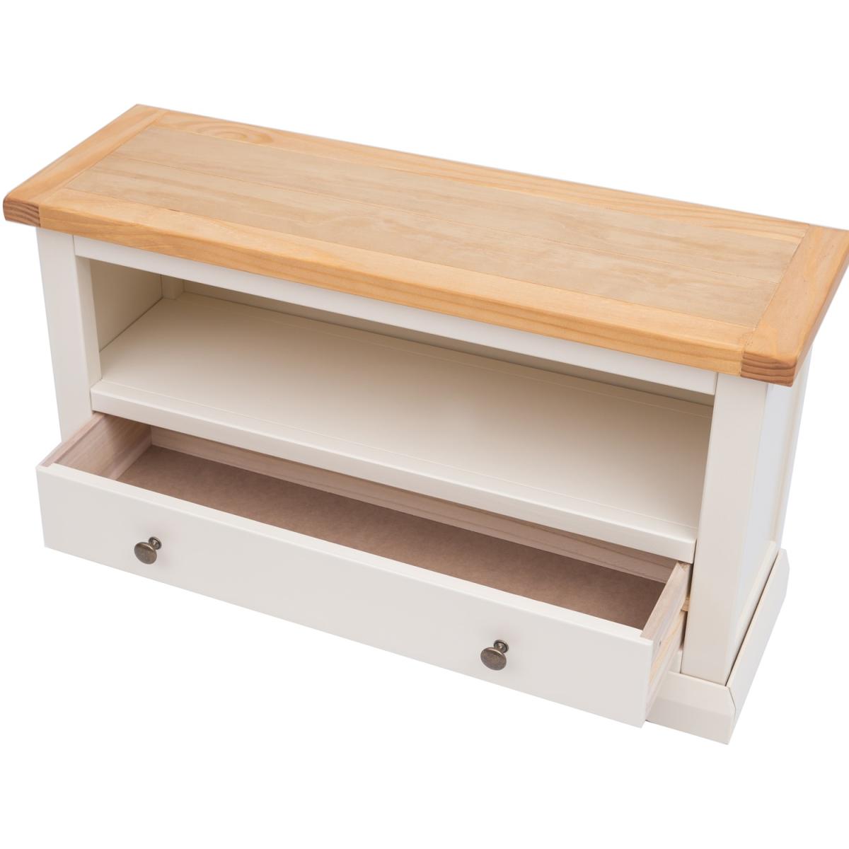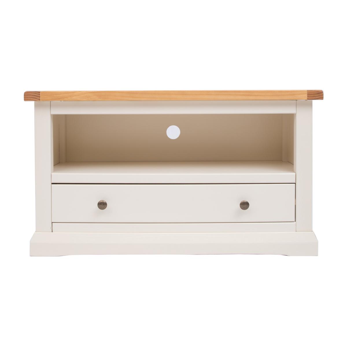 Our Castelli collection has a simple but pleasing design and is produced by our skilled craftsmen to the highest standards using responsibly sourced wood and veneers. All tops are made using a combination of solid pine wood and veneers and are carefully hand waxed giving them a great look. The body is finished with high-quality eco-friendly water base paint in an off-white colour. A compact and stylish TV unit with a full-width drawer at the bottom to store your remote controls and games consoles out of the way. Above the drawer is an open space for digital boxes or players, access for wiring is made easy by the cable holes cut out in the back of the unit.