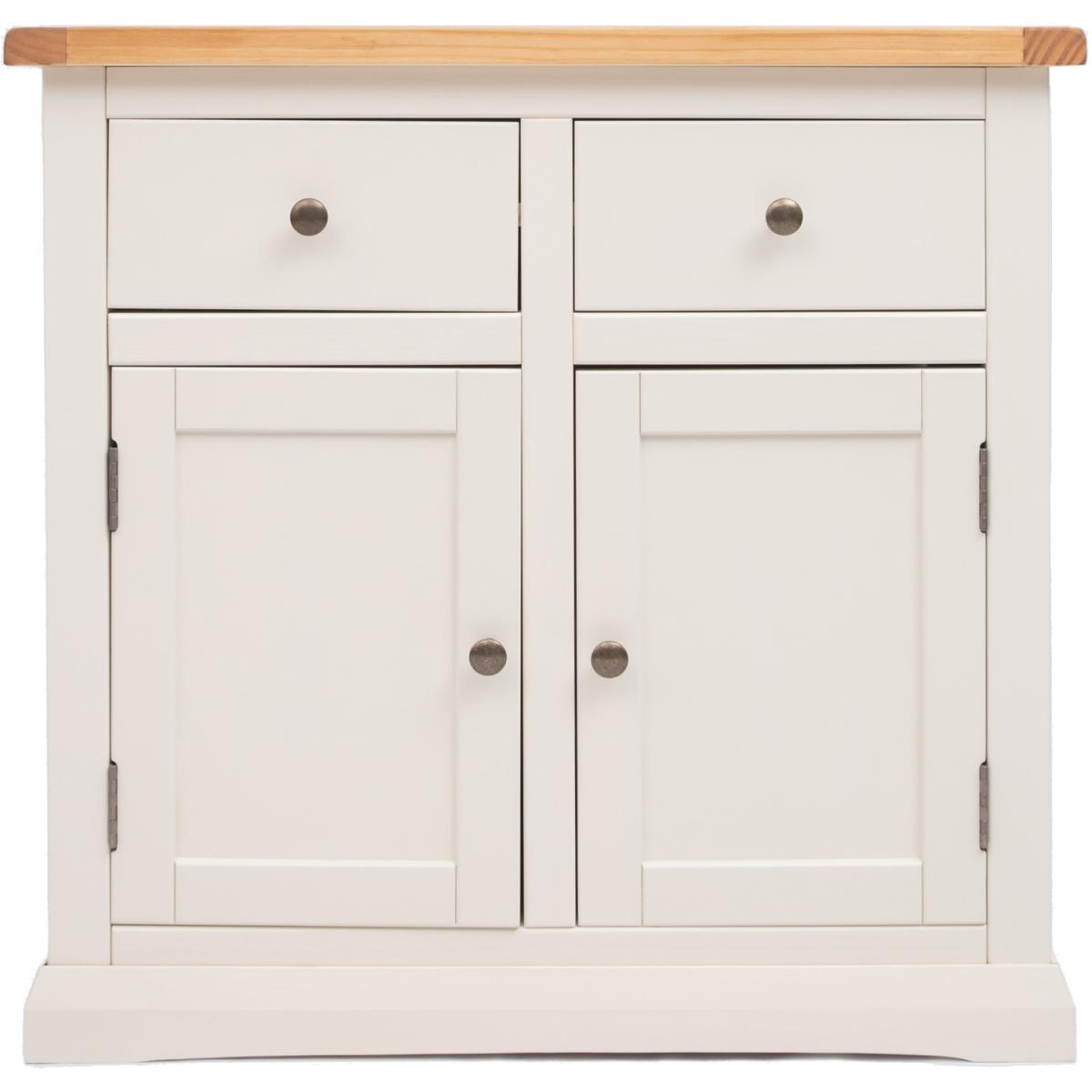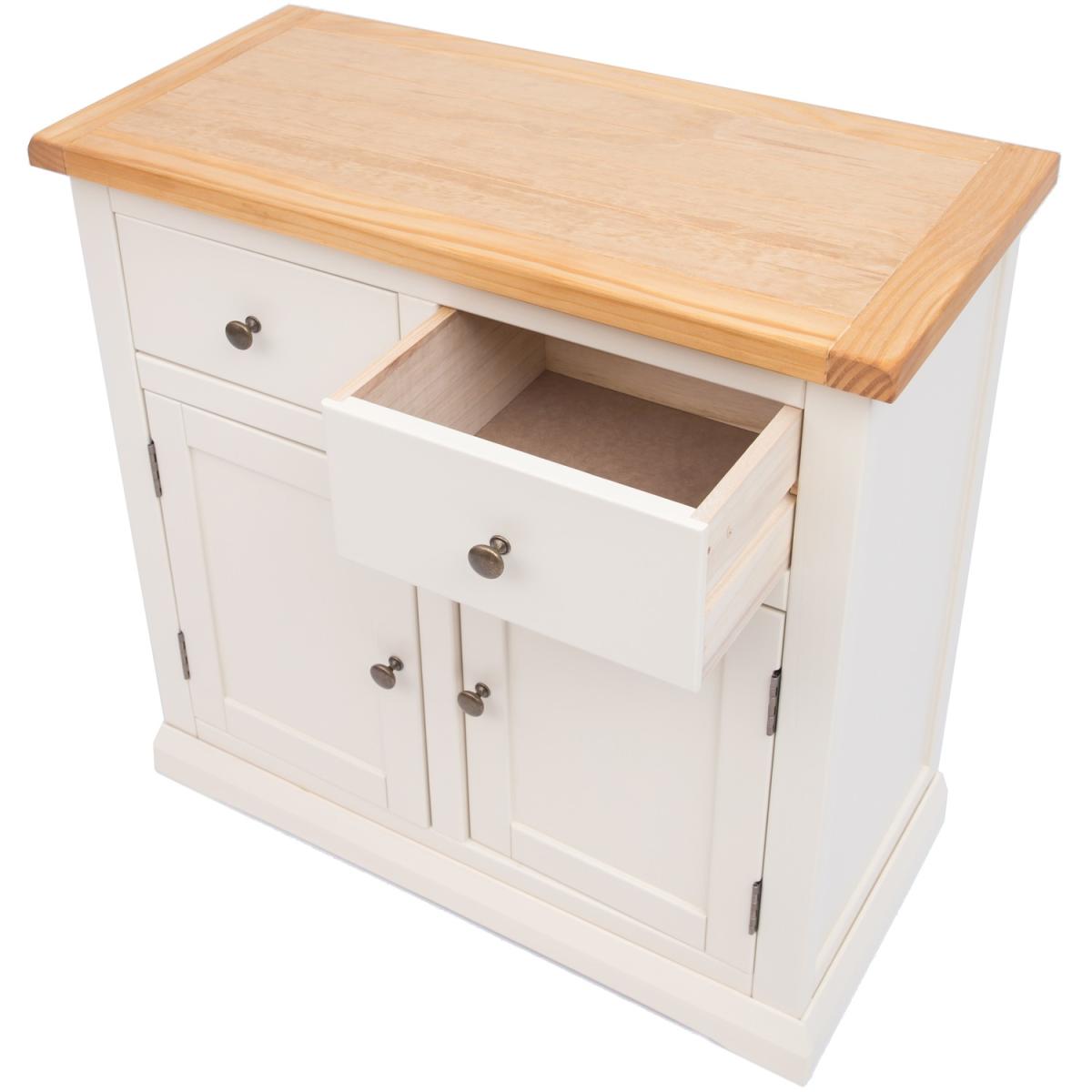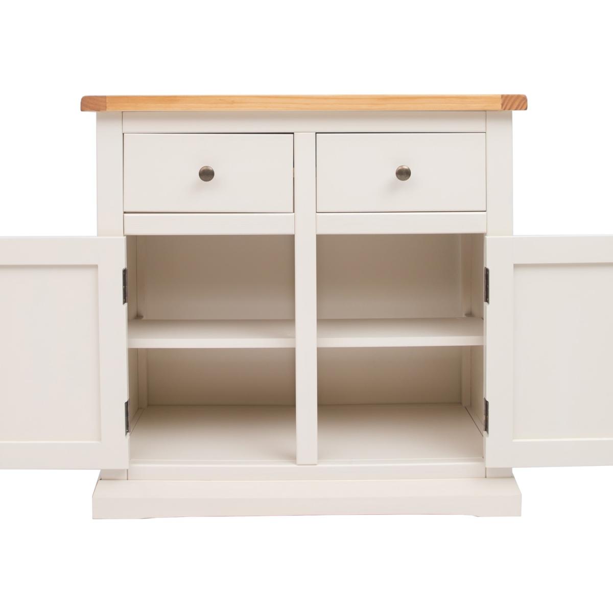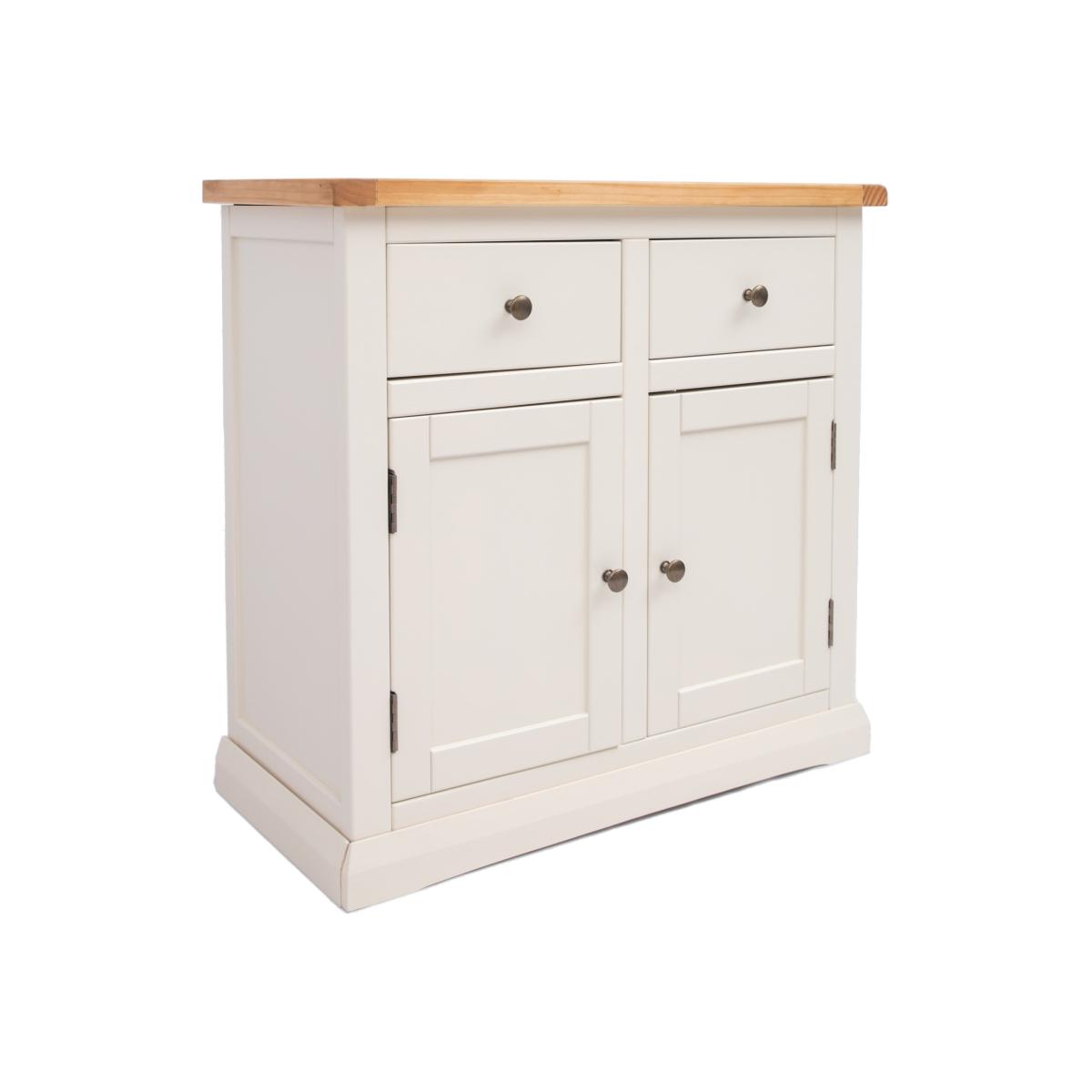 Our Castelli collection has a simple but pleasing design and is produced by our skilled craftsmen to the highest standards using responsibly sourced wood and veneers. All tops are made using a combination of solid pine wood and veneers and carefully hand waxed, giving them a great look. The body is finished with high-quality eco-friendly water base paint in an off-white colour. A compact 2-door 2-drawer sideboard ideal for your kitchen, dining room or lounge. The two doors conceal a large cupboard space for storing crockery, bottles or glassware and there is a shelf to help you organise your contents too. Above this, there are two drawers for cutlery, napkins, placemats or maybe even keeping essential paperwork to hand. These attributes combined with a simple construction for easy assembly make it a great value product to be taken home today.