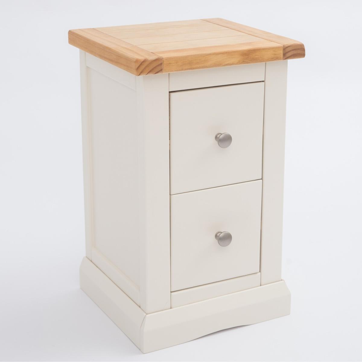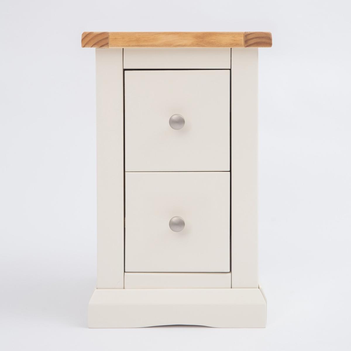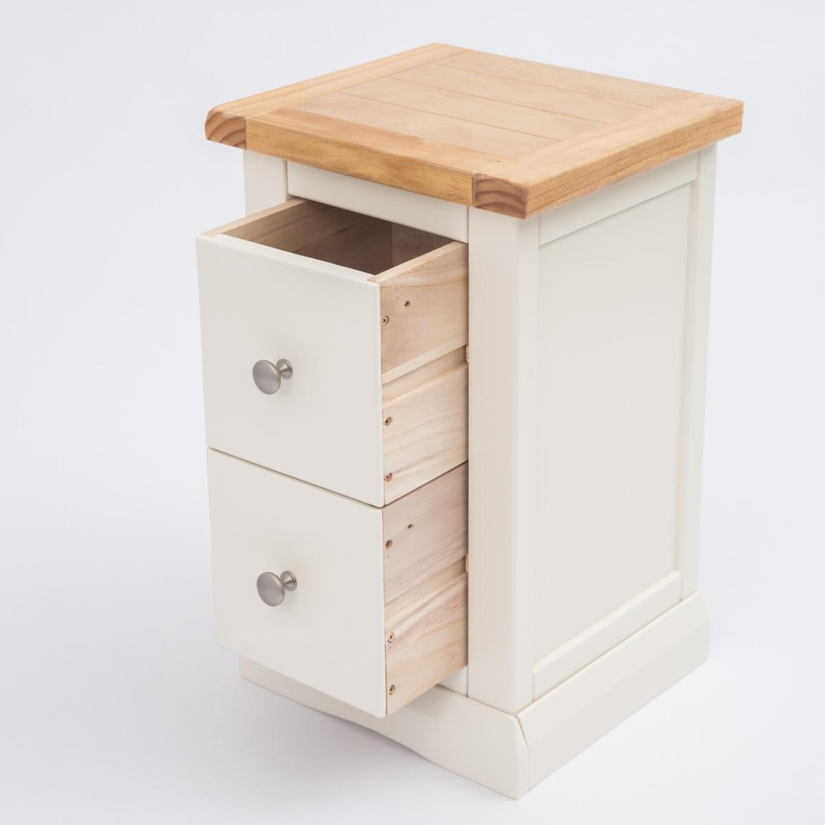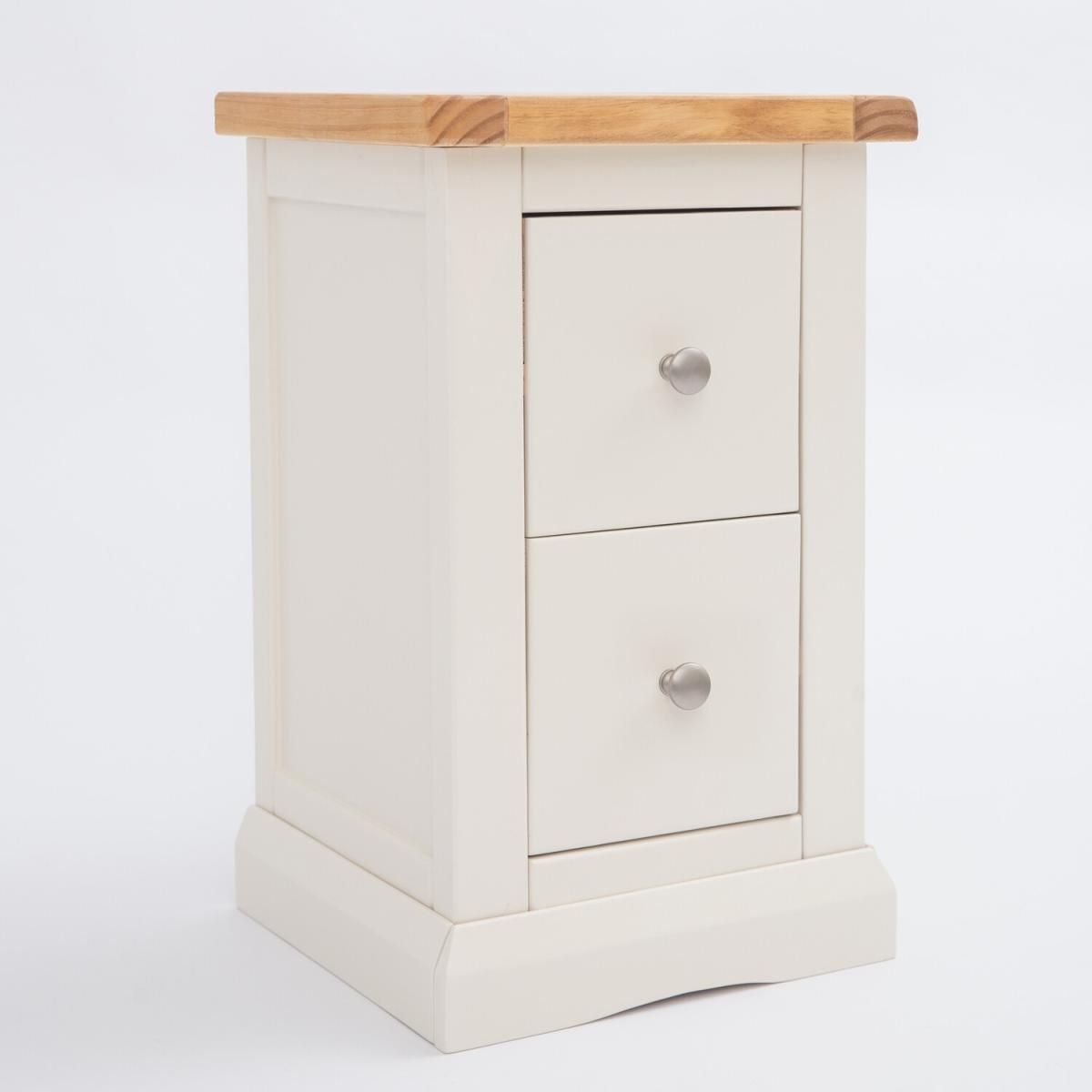 Our Castelli collection has a simple but pleasing design and is produced by our skilled craftsmen to the highest standards using responsibly sourced wood and veneers. All tops are made using a combination of solid pine wood and veneers and are carefully hand-waxed giving them a great look. The body is finished with high-quality eco-friendly water-based paint in an off-white colour. This petite bedside is perfect for any bedroom where space is at a premium. The two drawers have plenty of space to take your nighttime essentials and keep them close to hand, this allows the top to be free for your alarm or mobile phone. These attributes combined with a simple construction for easy assembly make it a great value product to be taken home today.