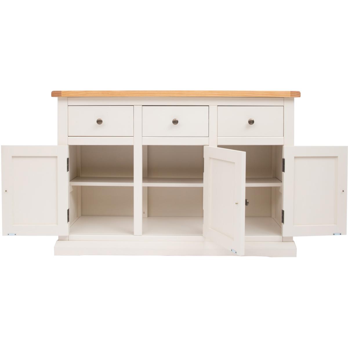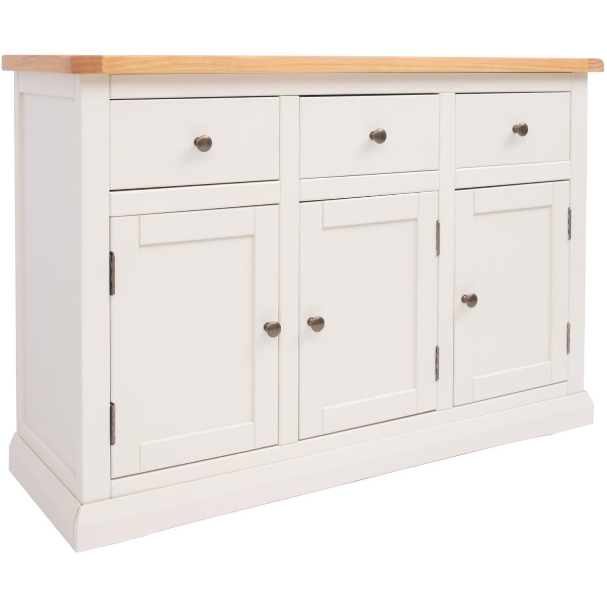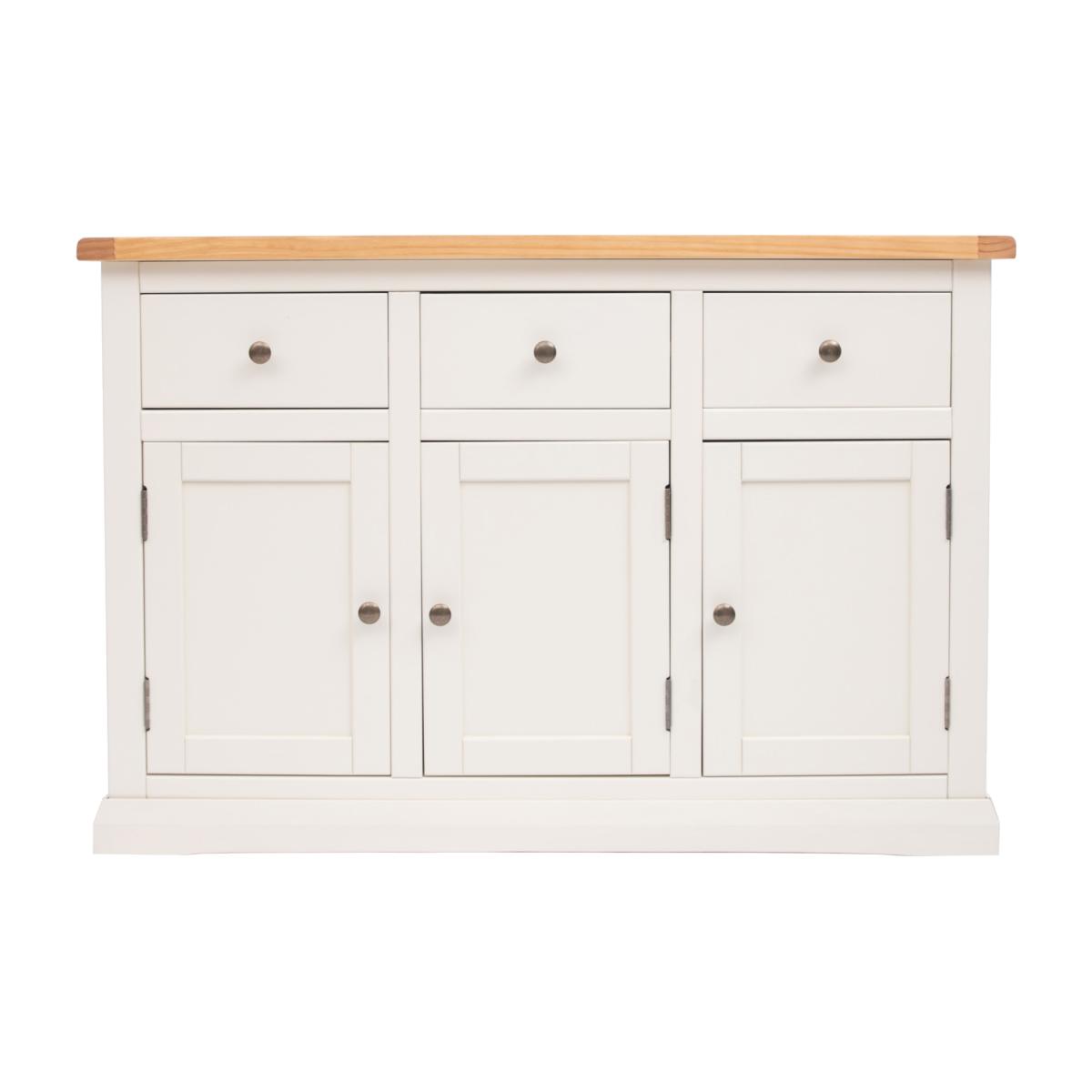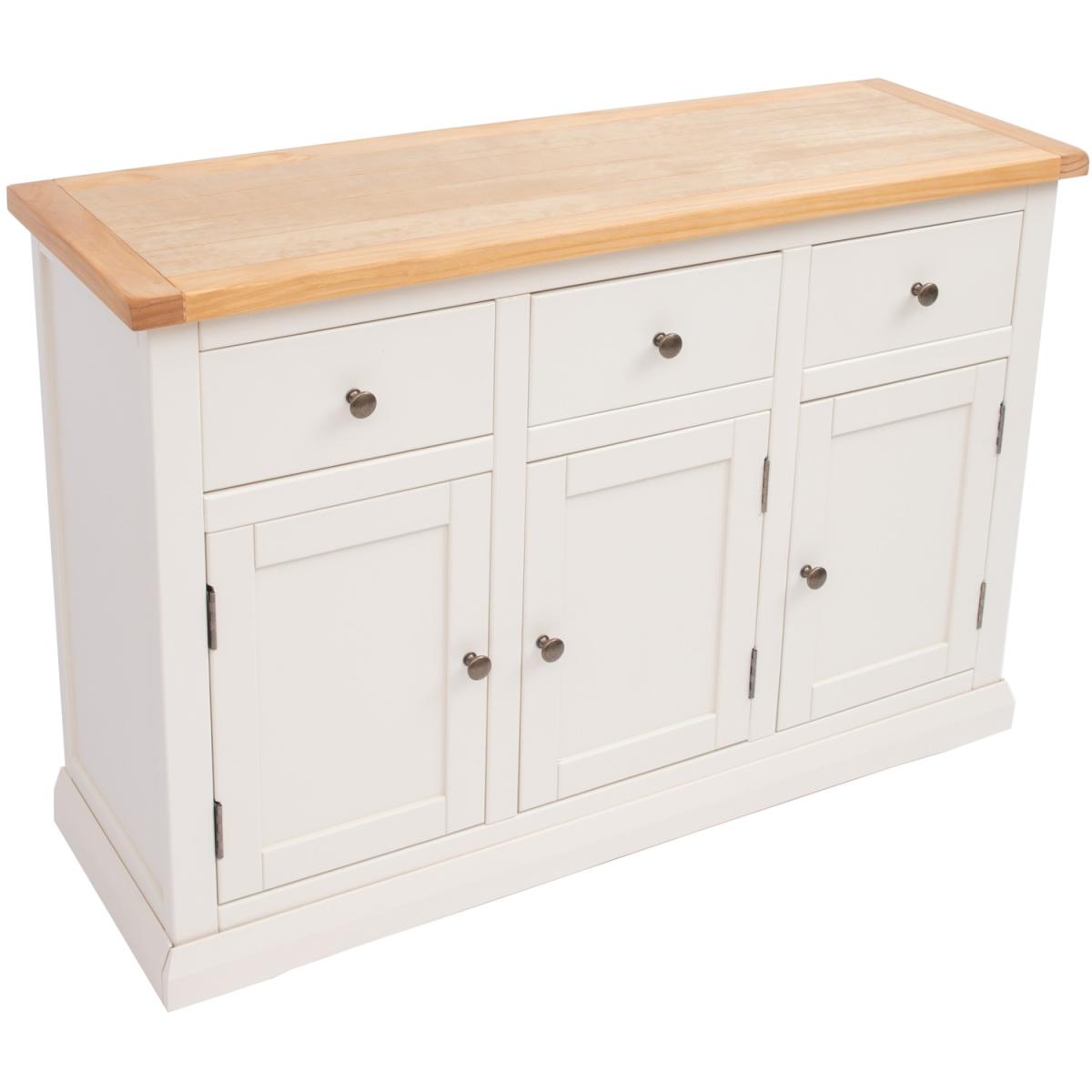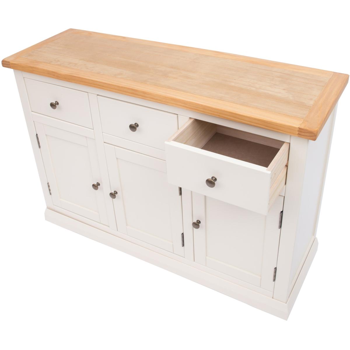 Our Castelli collection has a simple but pleasing design and is produced by our skilled craftsmen to the highest standards using responsibly sourced wood and veneers. All tops are made using a combination of solid pine wood and veneers and are carefully hand waxed giving it a great look. The body is finished with a high quality eco-friendly water base paint on an off-white colour. This large 3 door 3 drawer sideboard will look at home in your dining room or lounge. The three doors conceal a large cupboard space for storing crockery, bottles or glassware and there is also a shelf to further organise your contents. Above this there are three drawers for storing your cutlery, napkins, coasters or even paperwork you need to hand. These attributes combined with a simple construction for easy assembly makes it a great value product to be taken home today.