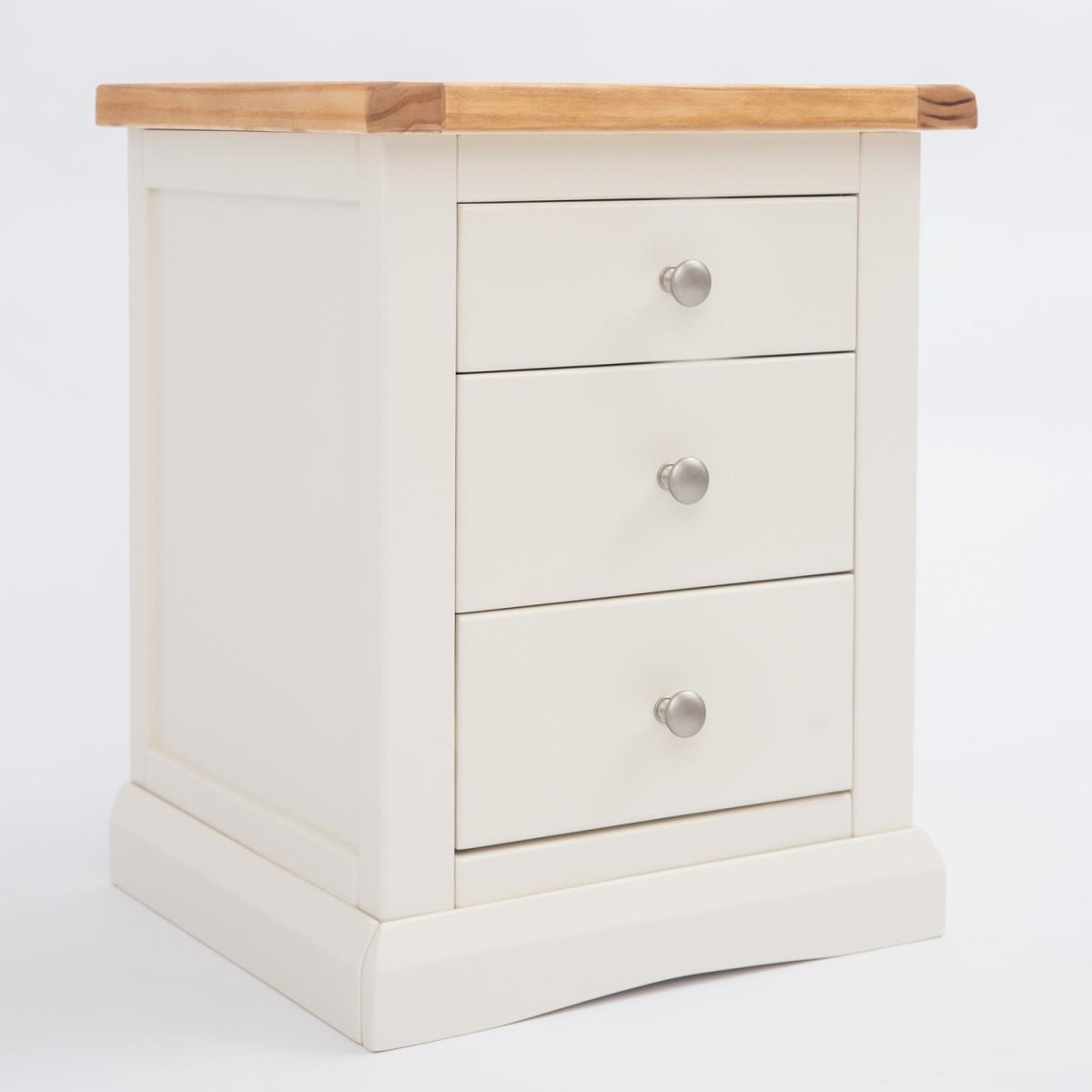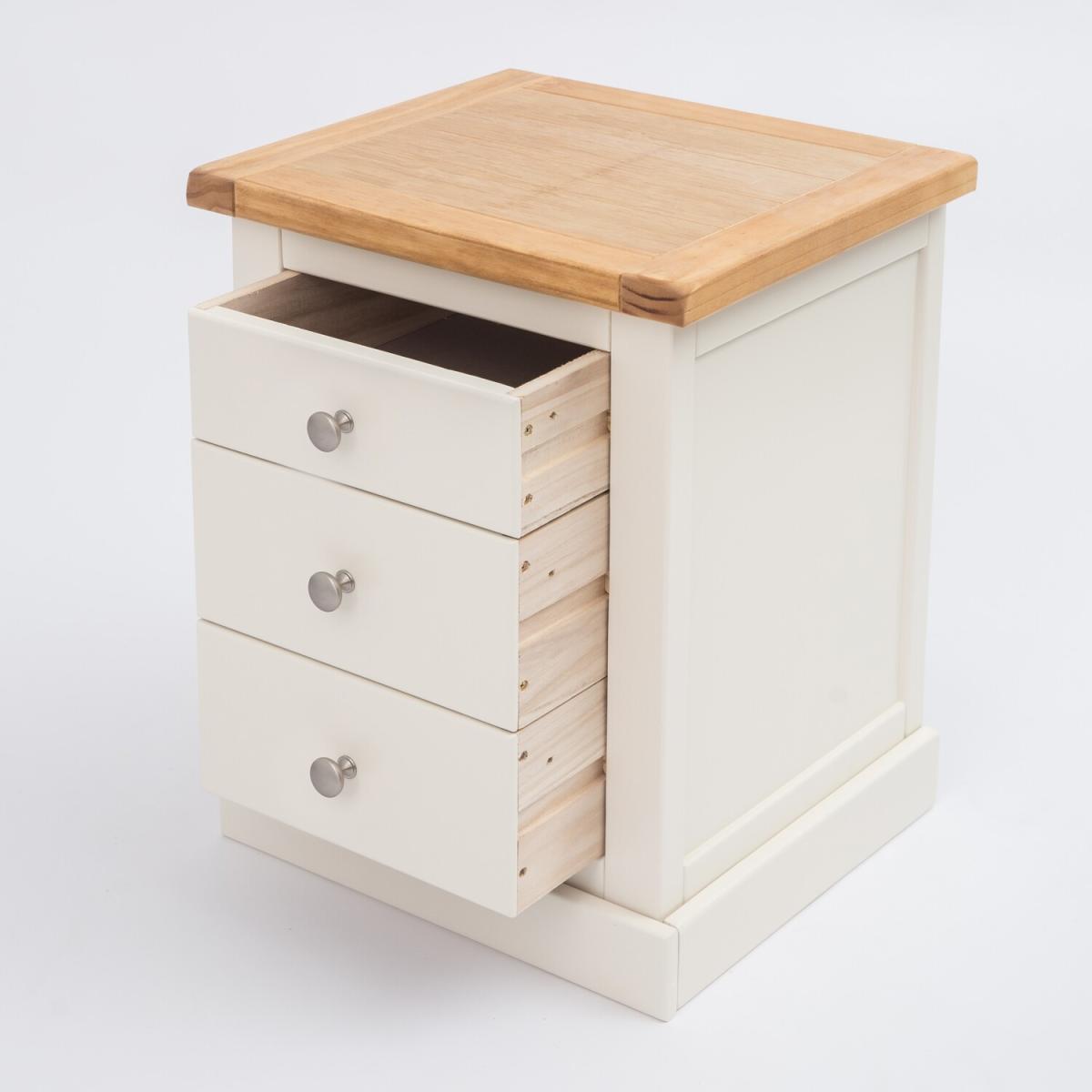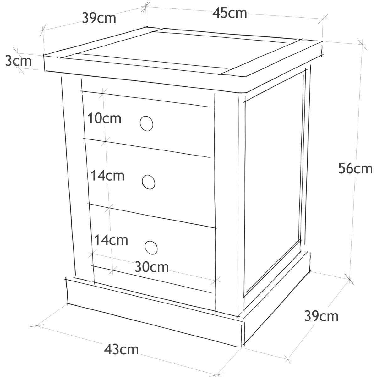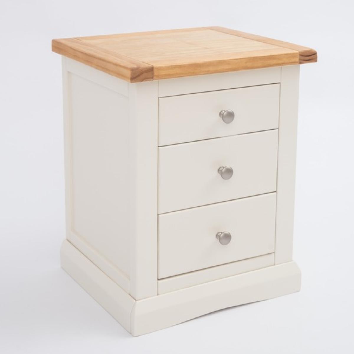 Our Castelli collection has a simple but pleasing design and is produced by our skilled craftsmen to the highest standards using responsibly sourced wood and veneers. All tops are made using a combination of solid pine wood and veneers and are carefully hand-waxed giving them a great look. The body is finished with high-quality eco-friendly water-based paint in an off-white colour. A combination of drawer sizes means this 3-drawer bedside allows for flexible storage. The top drawer is shallow and perfect to house your reading material, medication or jewellery. The two drawers below are deeper and ideal for storing underwear or accessories. These attributes combined with a simple construction for easy assembly make it a great value product to be taken home today.