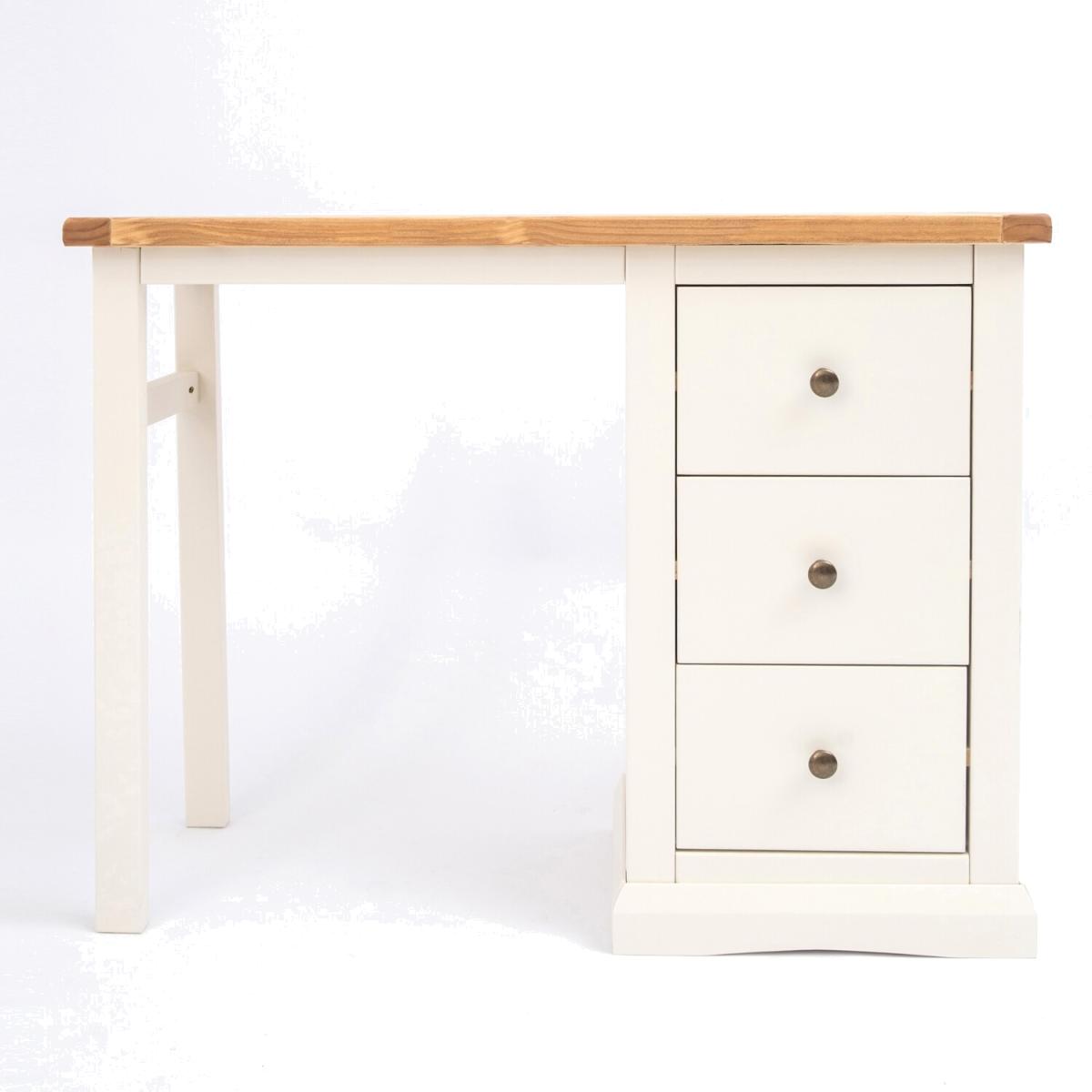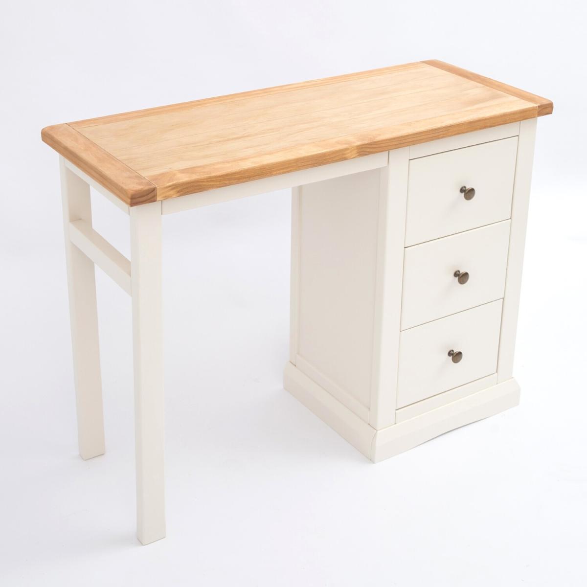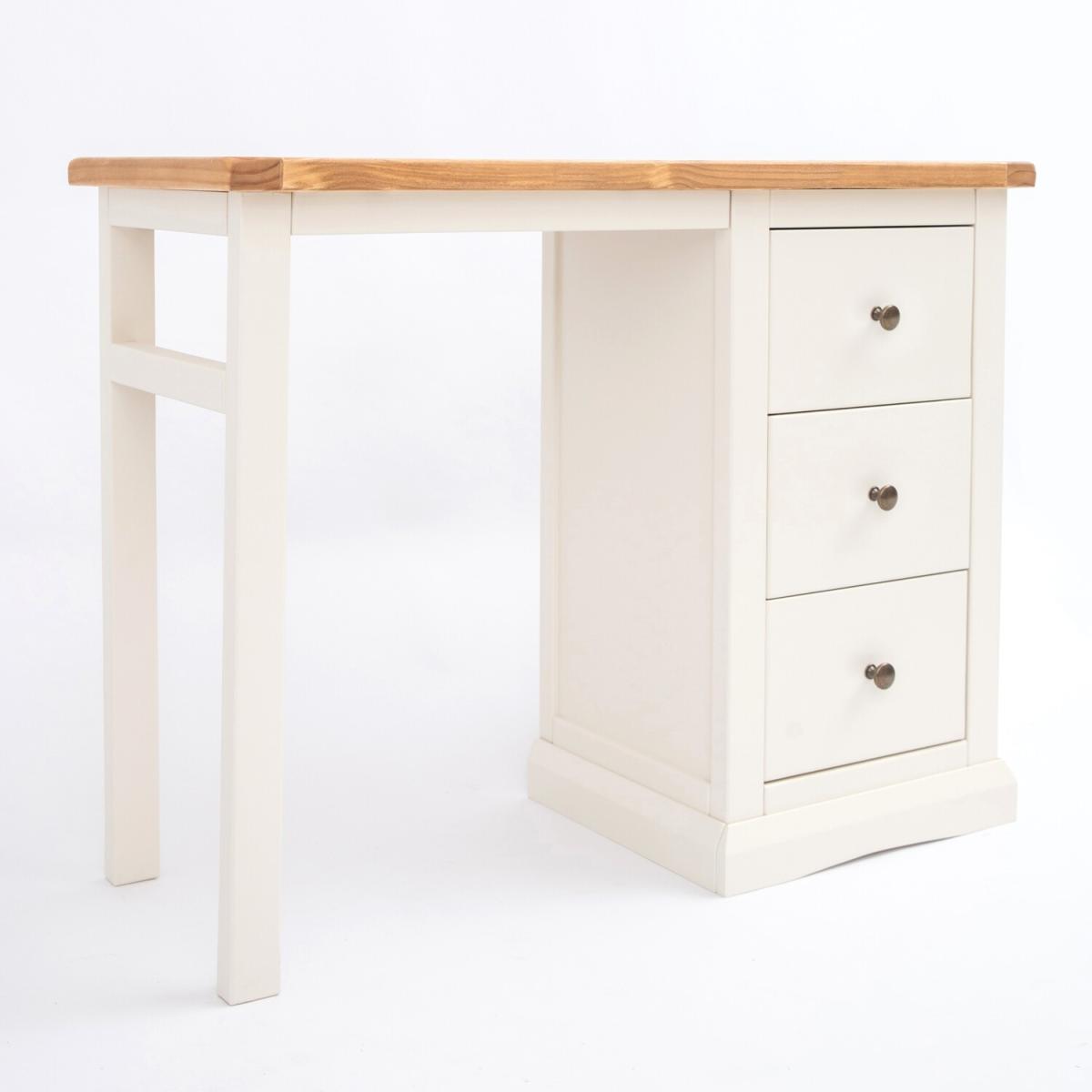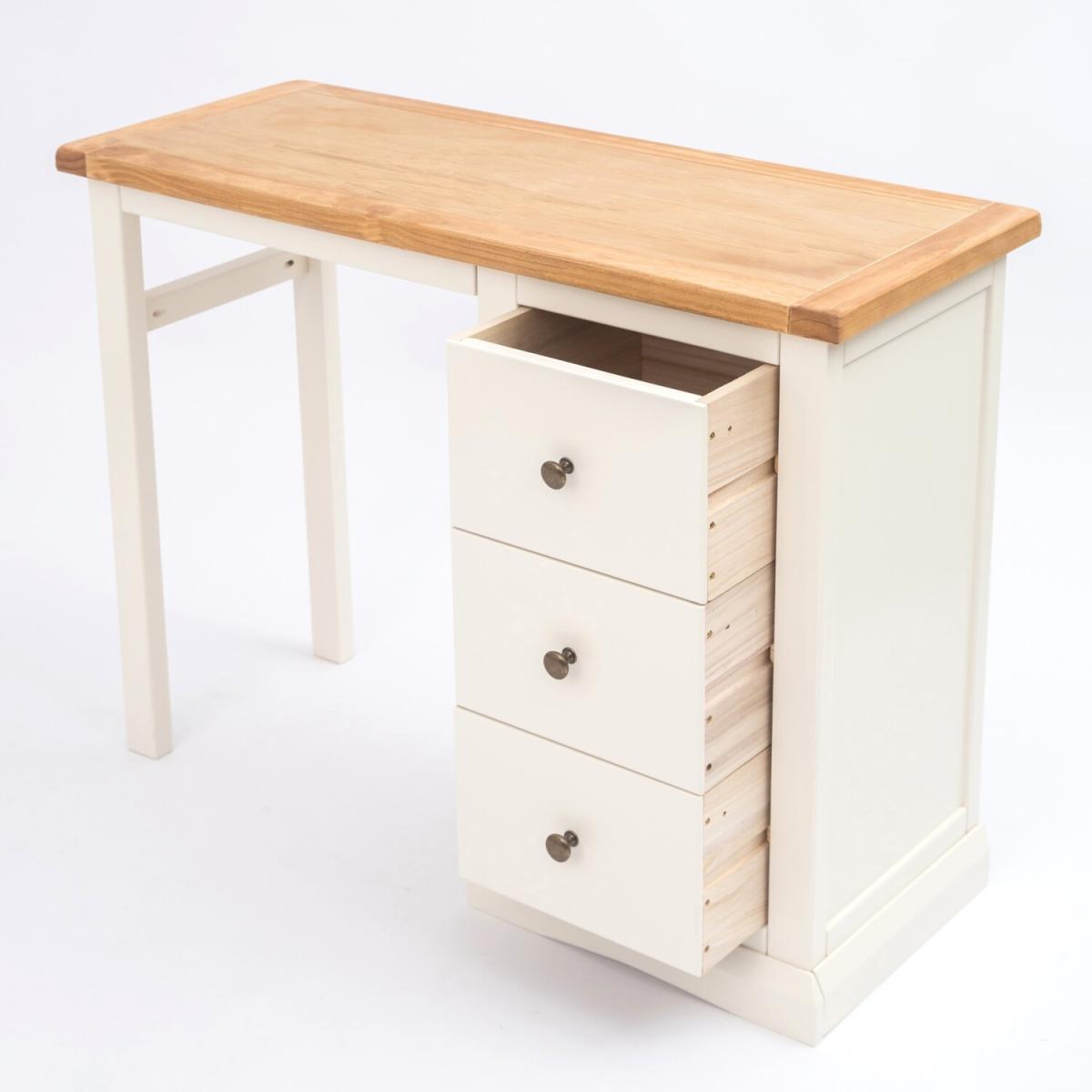 Our Castelli collection has a simple but pleasing design and is produced by our skilled craftsmen to the highest standards using responsibly sourced wood and veneers. All tops are made using a combination of solid pine wood and veneers and are carefully hand waxed giving them a great look. The body is finished with high-quality eco-friendly water base paint in an off-white colour. A versatile 3-drawer desk dressing table for your home, the perfect multifunctional piece for your bedroom. The 3 drawers offer plenty of space for your belongings whether being used as a desk or dressing table. The pedestal part can be positioned to the left or right-hand side when assembling. Why not add the mirror and stool to complete your set These attributes combined with a simple construction for easy assembly makes it a great value product to be taken home today.