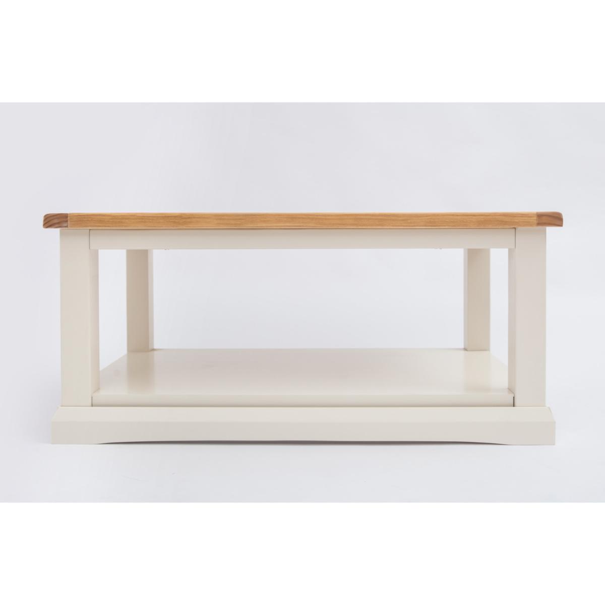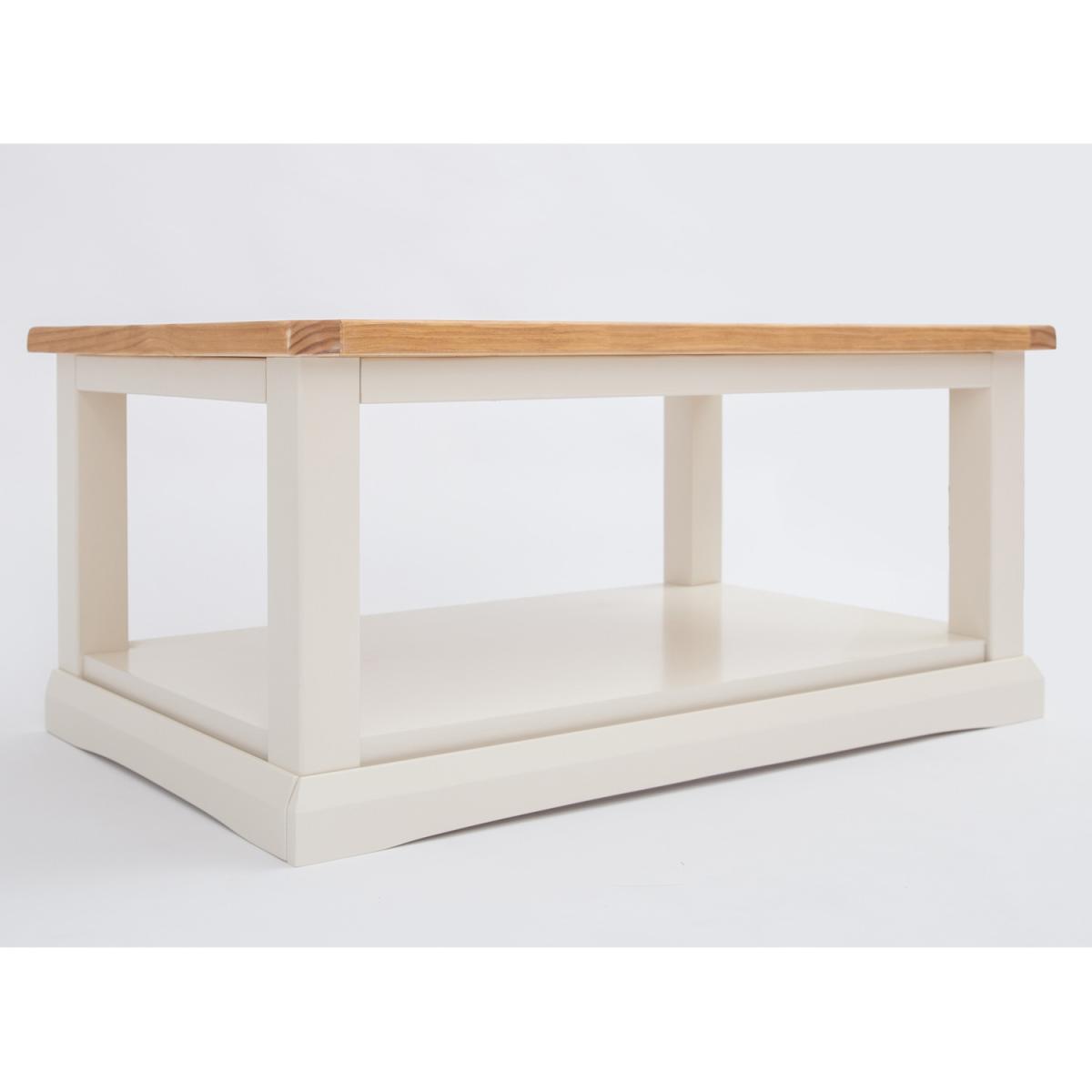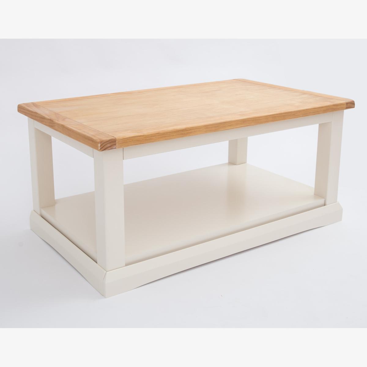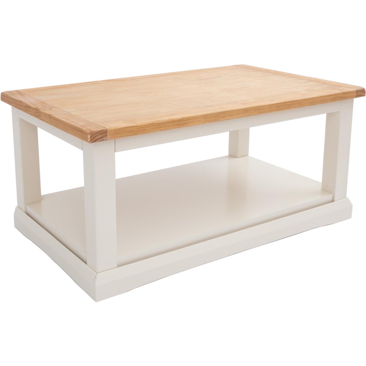 Our Castelli collection has a simple but pleasing design and is produced by our skilled craftsmen to the highest standards using responsibly sourced wood and veneers. All tops are made using a combination of solid pine wood and veneers and are carefully hand waxed giving it a great look. The body is finished with a high quality eco-friendly water base paint in an off-white colour. This coffee table is perfect as a centrepiece for your room. The top has plenty of space for TV remotes, magazines, your tablet or your favourite scented candle. It is also perfect for drinks and snacks, but don't forget to use a coaster to protect the finish. The shelf below allows space for those other items you need close to hand to be stored conveniently, perhaps tissues or your snuggle blanket for cold nights. These attributes combined with a simple construction for easy assembly makes it a great value product to be taken home today.