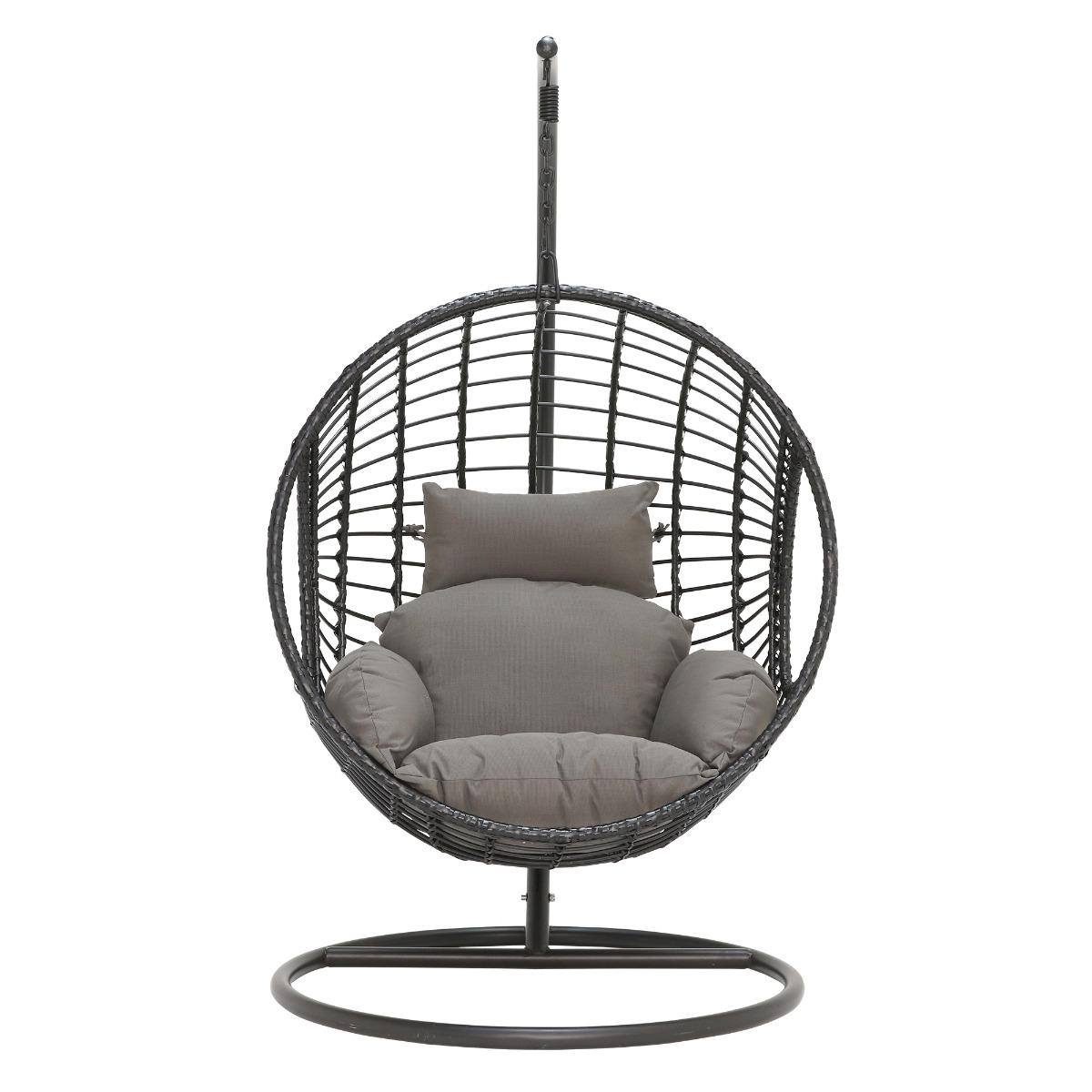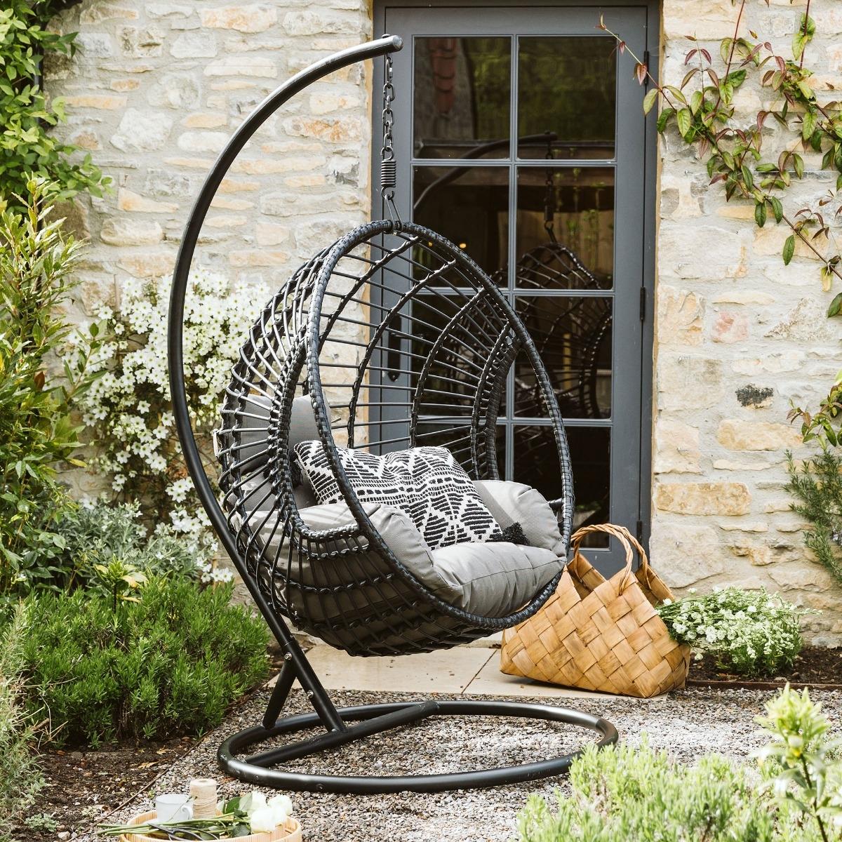 Design. Offering a more contemporary feel our incredibly popular Castello hanging chair is now available in black, and comes with an alternative floor standing base. A versatile and on trend piece the Castello garden swing seat is perfect for changing things up depending on space and the weather, it can be used inside and out and as a static or hanging chair. What’s not to love, you’ll enjoy hours of sitting in this gorgeous garden hanging egg chair admiring the view.