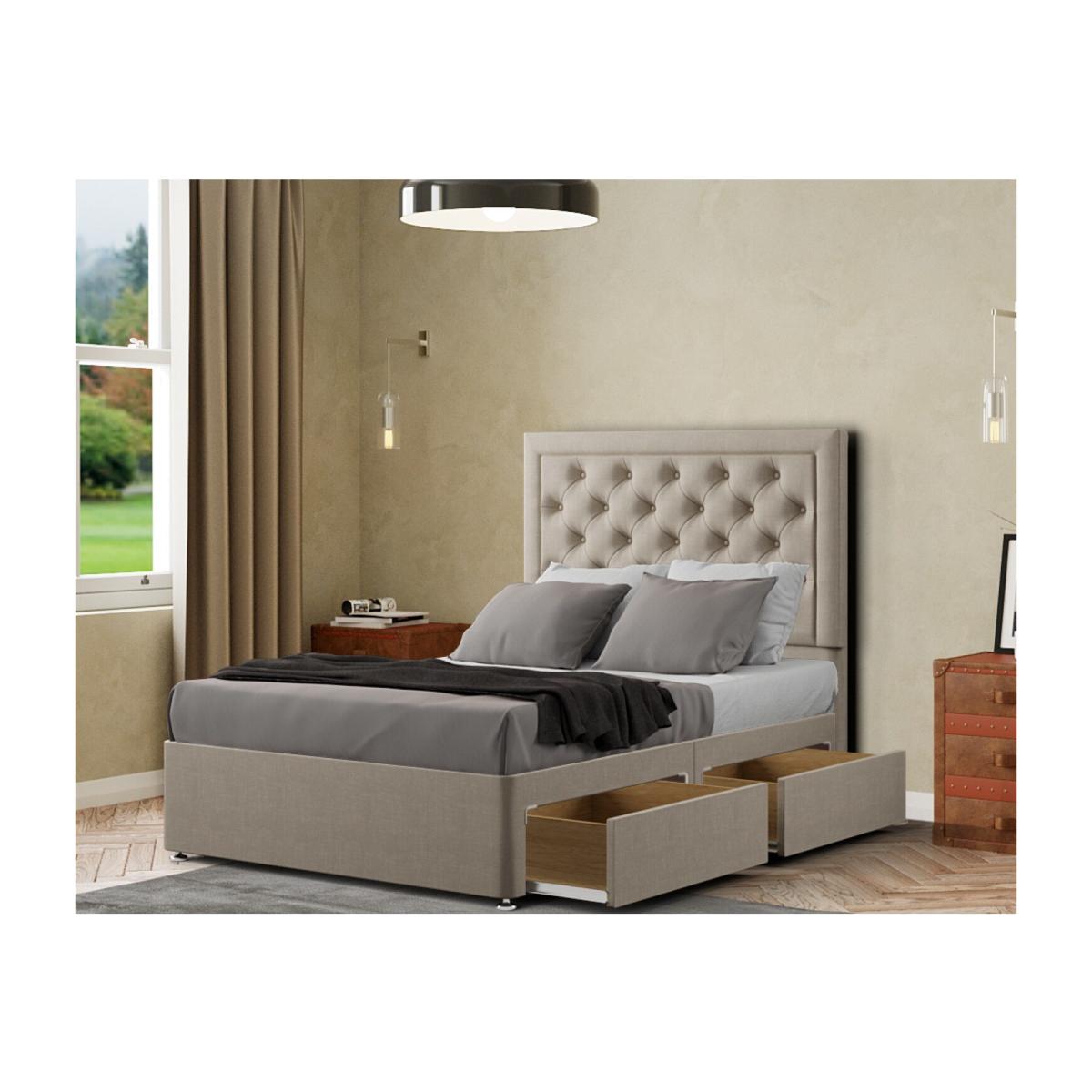 Introducing the Castle Divan Bed - Elevate Your Bedroom with British Craftsmanship. Crafted in the UK The Castle Divan Bed embodies the essence of British craftsmanship, meticulously designed and built for enduring quality. Impeccable Design Elevate your bedroom with its floor-standing 54-inch headboard adorned with matching buttons, radiating sophistication and adding a touch of luxury to your space. Customized to Your Style Express your unique taste with a range of colors and fabric choices. The Castle Divan Bed offers various options to effortlessly complement your decor. Available in All Sizes Whether you need a single, small double, double, king, or super king size, we have the perfect bed ready and waiting to suit your space. Mattress Not Included Designed to pair seamlessly with your preferred mattress, the Castle Divan Bed allows you to create a personalized sleep sanctuary. Premium Quality Crafted with top-tier materials, this divan bed ensures durability and comfort, promising years of restful nights. Elevate your bedroom with the Castle Divan Bed and experience the perfect fusion of style, functionality, and quality. Transform your space into a haven of comfort and sophistication,order yours today.