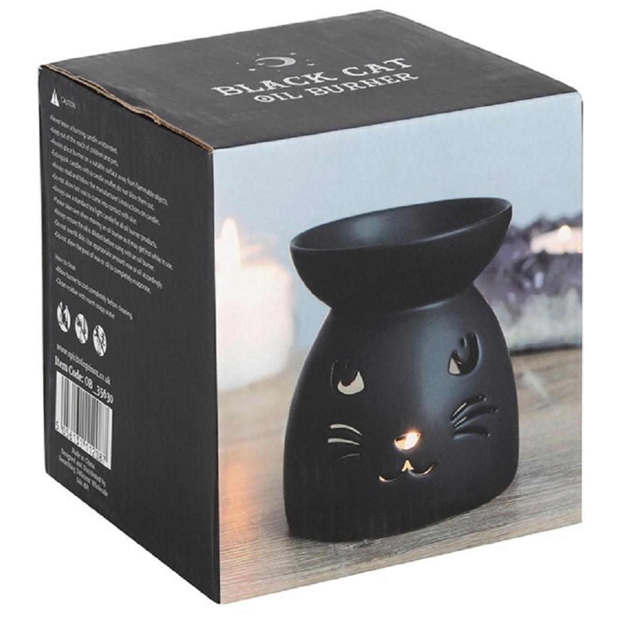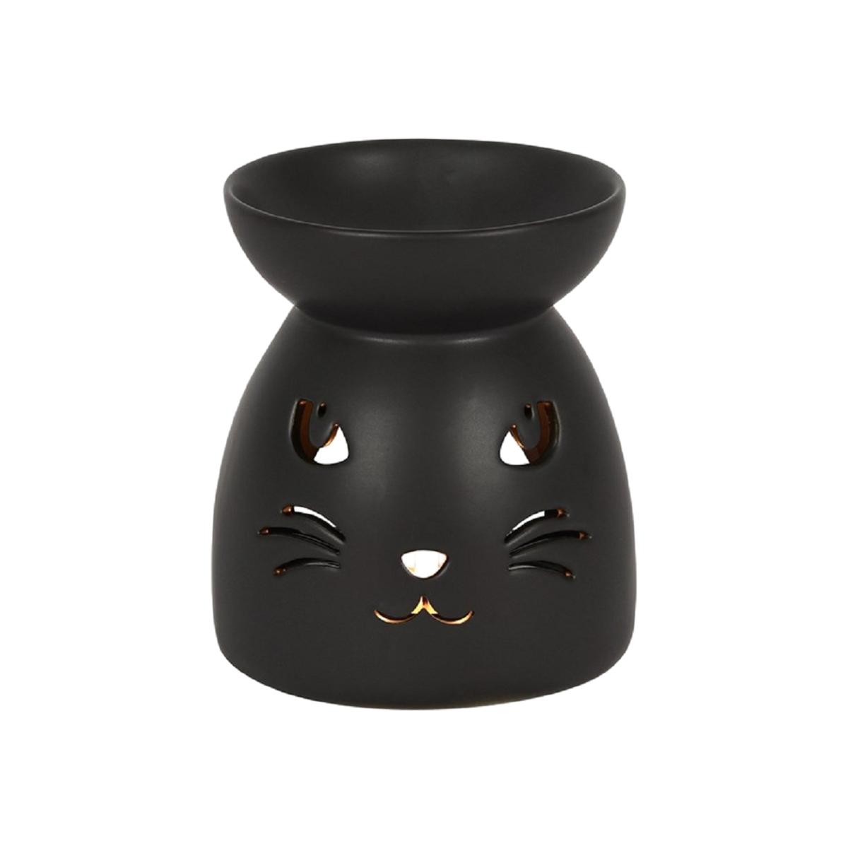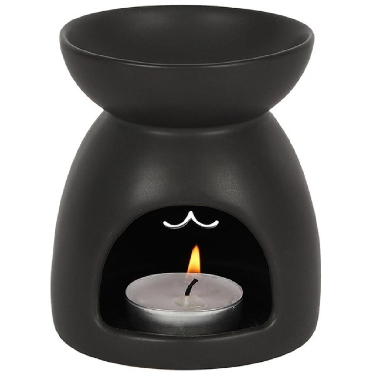 This black ceramic oil burner features a cutout cat face and a cool, matt finish. Compatible with both fragrance oil and wax and perfect for Halloween or spooky decor!