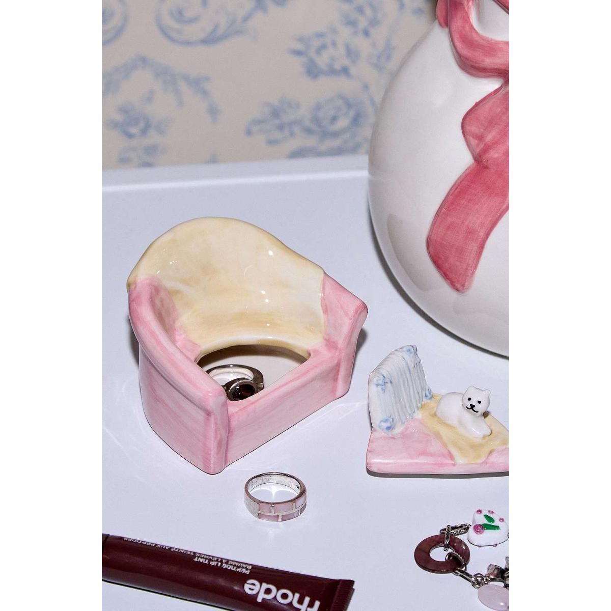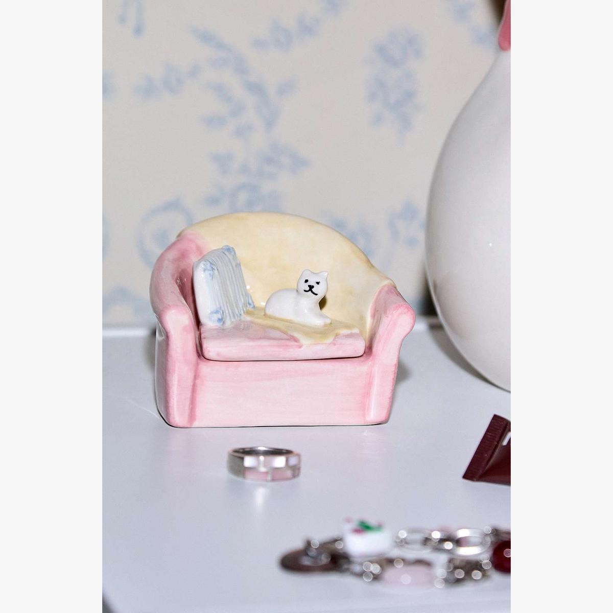 Sweet trinket box designed as a pink sofa with a cute kitty lid. Perfect for storing your small trinkets and jewellery. **Content + Care* * \- Ceramic- Wipe clean