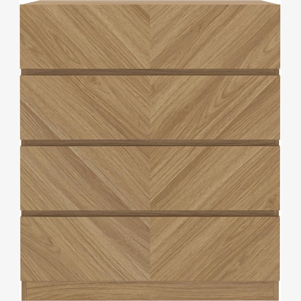 Delivering both style and practicality, this spacious full-width four drawer chest features Herringbone inspired wood-grain design drawer fronts which make a true statement in any room setting. The handle free drawer system opens smoothly on the metal runners providing plenty of storage space for all your personal items. This chest of drawers arrives ready to assemble with instructions included.