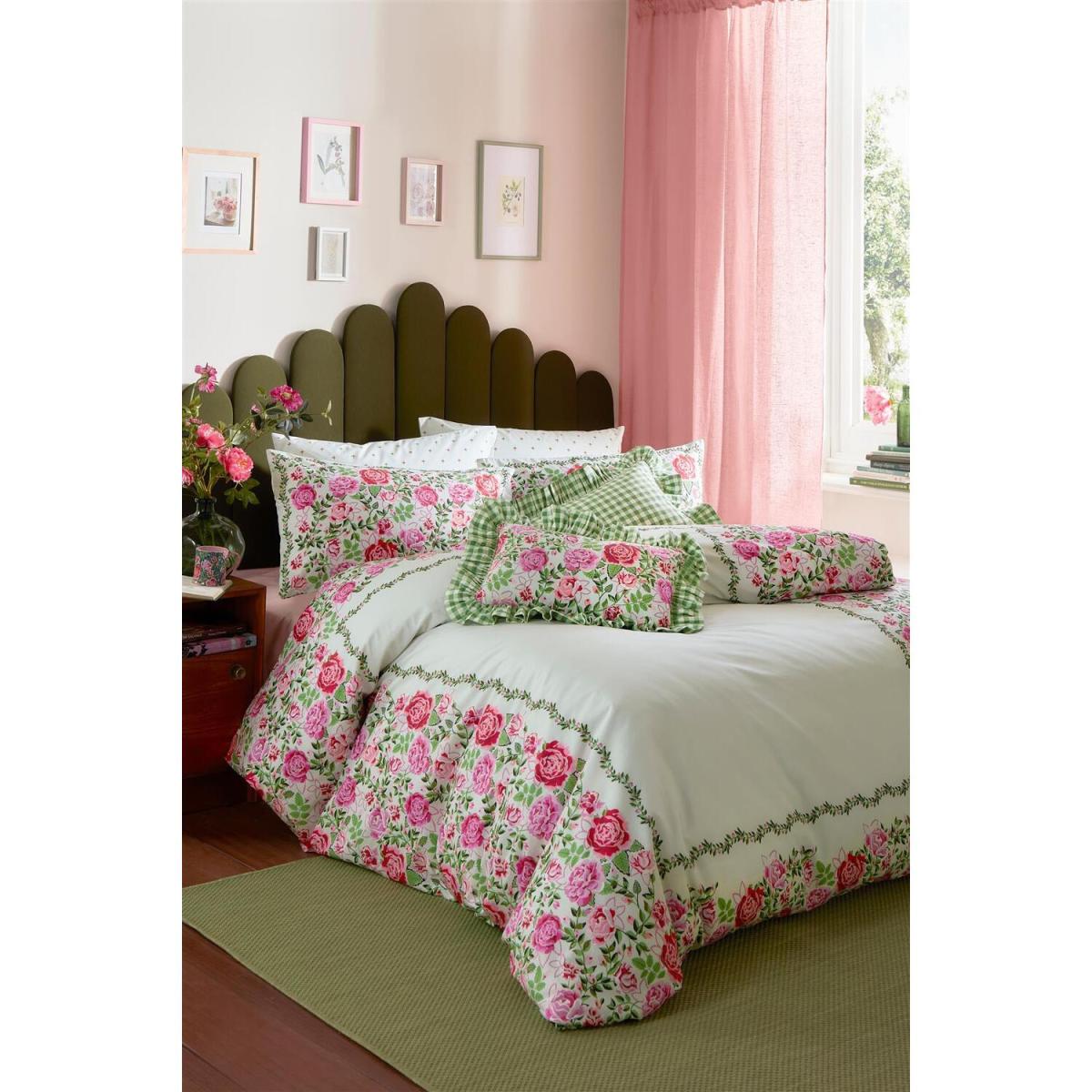 Reimagined from the Cath Kidston Archive, 'Dolly Rose' is a vibrant and joyful hand-painted bloom duvet cover set in vibrant pink and red Sitting on a beautiful, soft sage ground, a delicate, heritage rose bud trail frames this timeless design. Printed onto soft 100 cotton percale with ditsy bud reverse.