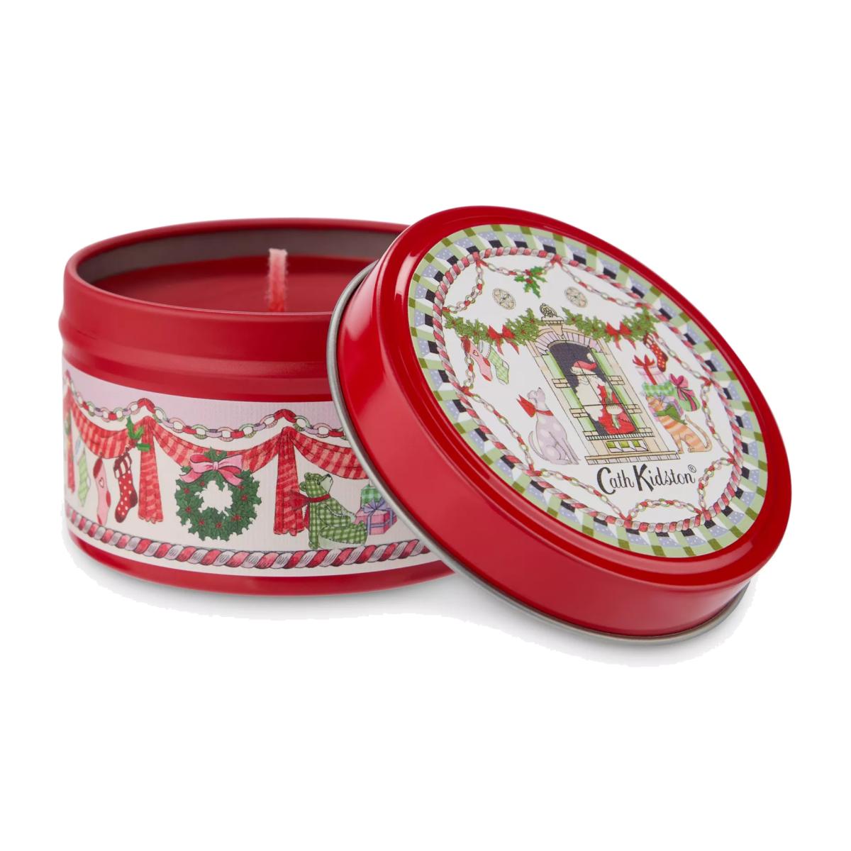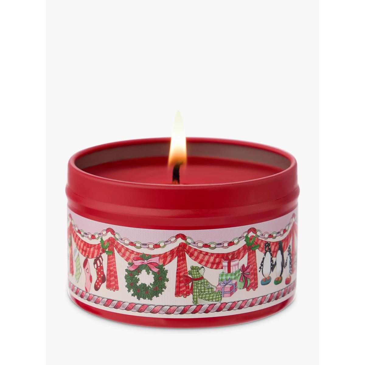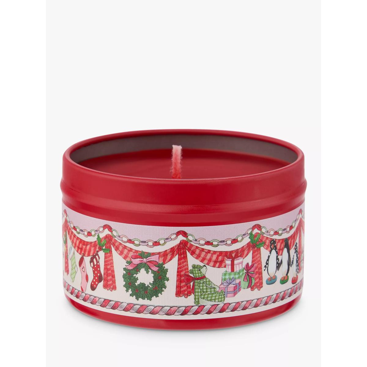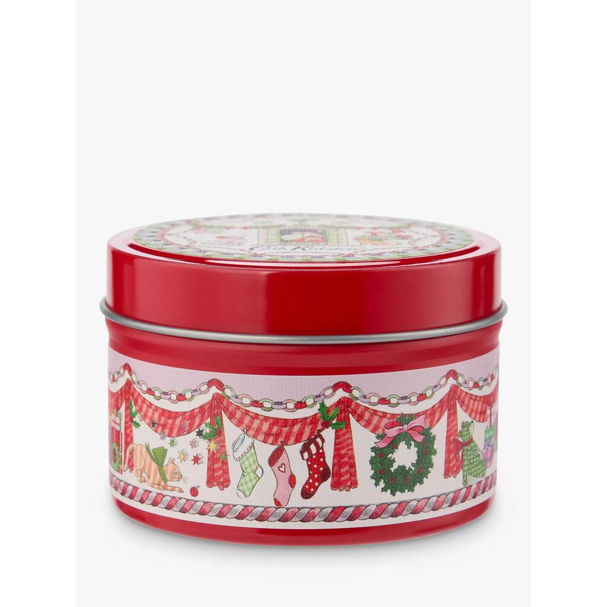 Bring cheer to your home with our festive candle in a tin, fragranced with iconic Red Berry & Cedar. Light the candle and fill the air with notes of pine needles, cedarwood, red berries and candied sugar. But first - lift the lid and ta dah! The candle wax is tinted red to match the tin. Decorated with Santa, festive animals, colourful stockings, paper chains and wreaths, it makes a perfect gift.