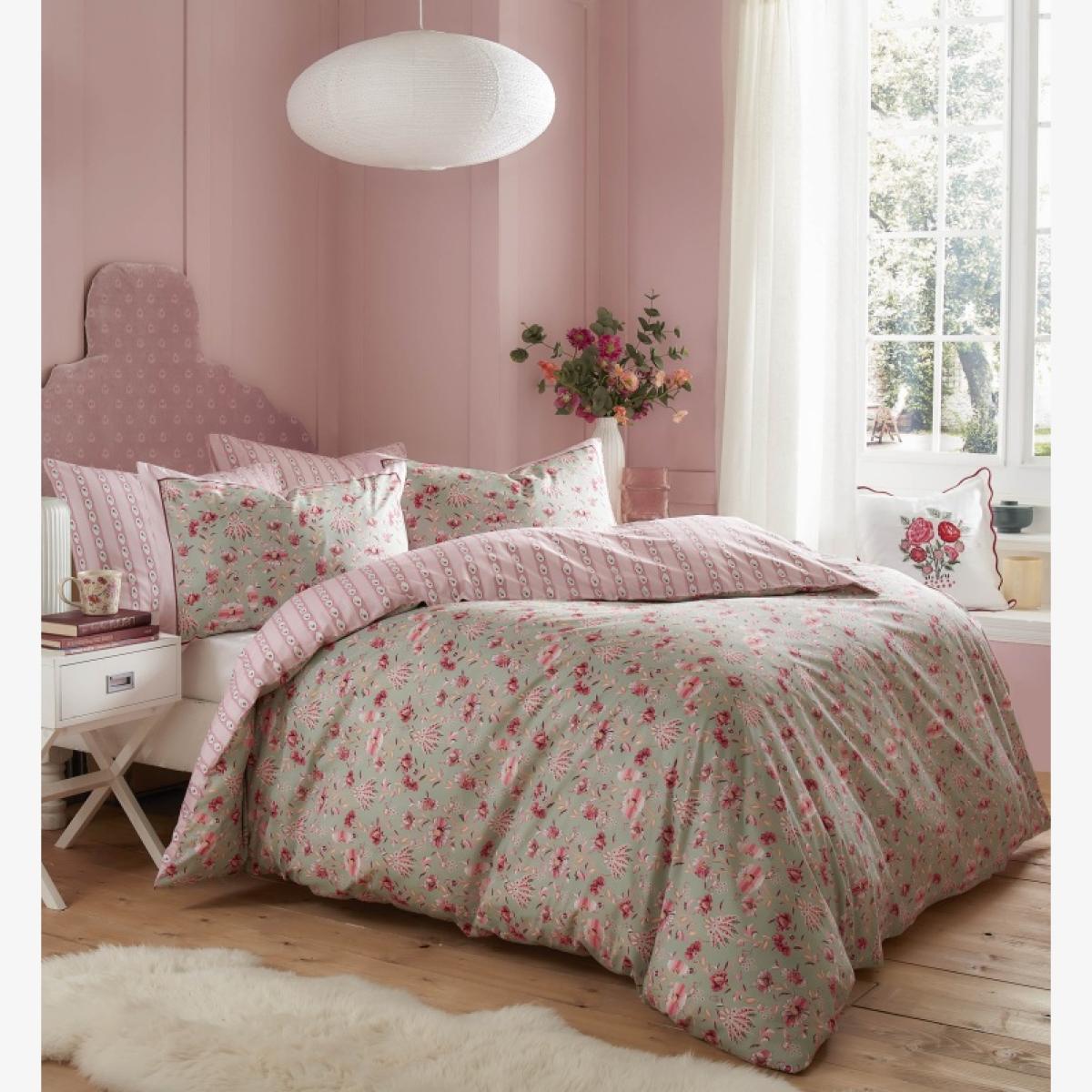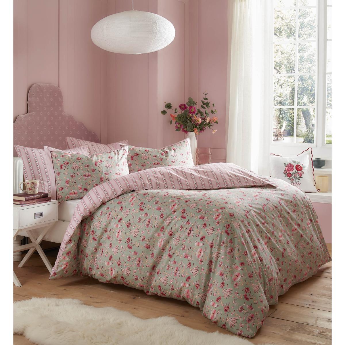 Indulge in the timeless charm of the Cath Kidston Friendship Gardens print, meticulously hand-painted to capture the essence of an embroidery weave's tactile allure. Evoking the interconnectedness of relationships, this exquisite design features warm hues of chalk pink, rich berry, and soft peach set against a sophisticated Sage backdrop. Delicate trailing florals intertwine with a hand-painted bud stripe reverse, reminiscent of vintage ribbon samples, blending heritage with contemporary flair. Crafted from soft cotton, this print promises to envelop you in the sweetest dreams, offering both comfort and style to your sleep space. Experience the artistry and warmth of Friendship Gardens for a truly enchanting slumber.. Features 100% Cotton Percale. 180 Thread Count Care Instructions Machine wash at 40° Tumble dry on low heat Warm iron Do not bleach Do not dry clean Please note All screens vary in colour reproduction and whilst every effort has been made to display the colour as accurately as possible it is for guidance only.