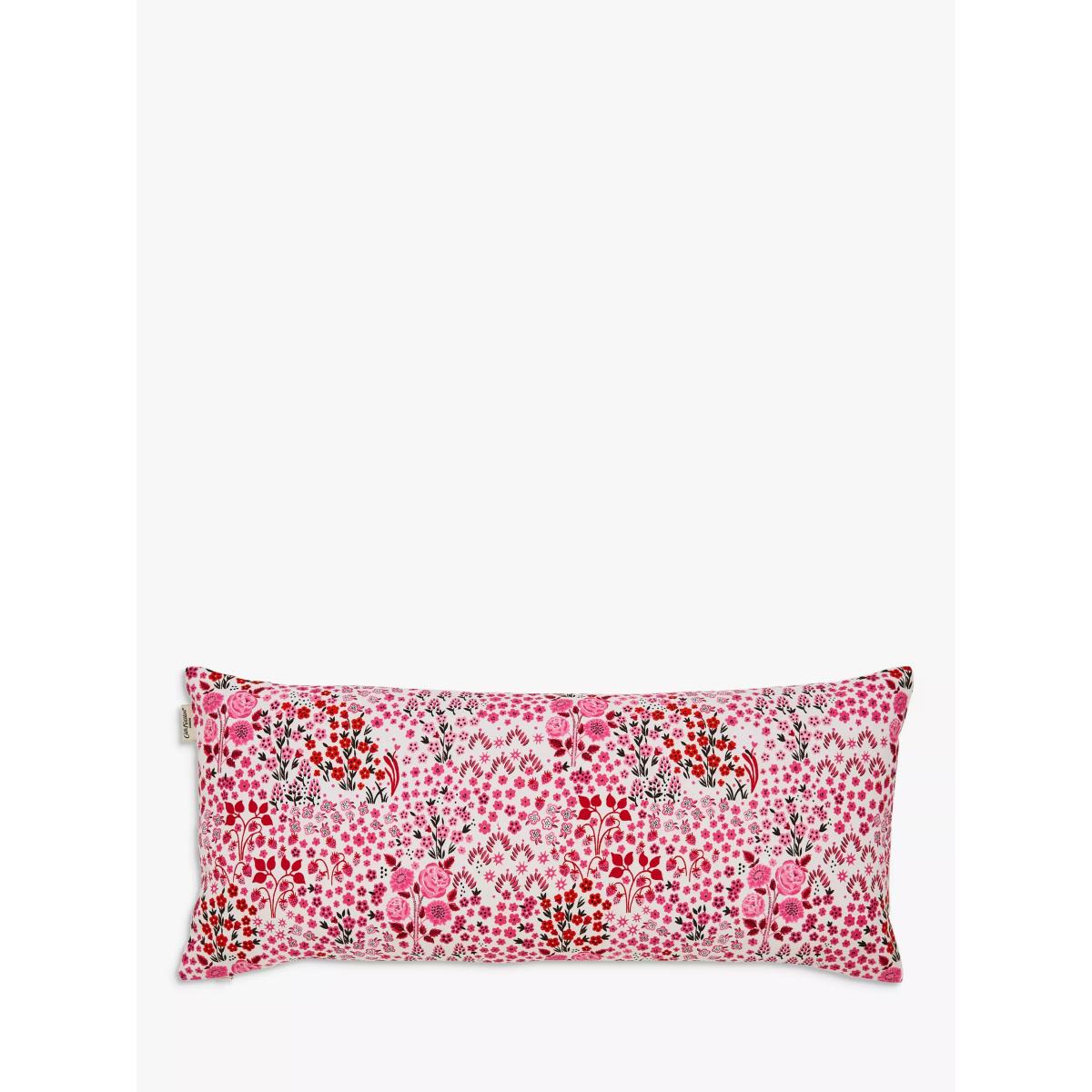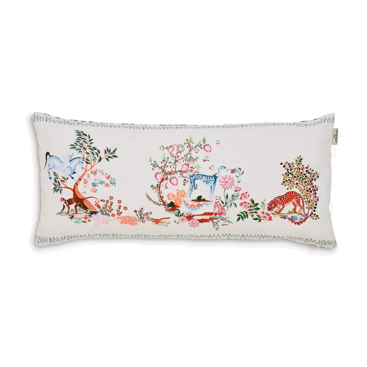 From flying pigs to monkeys with tiger-striped coats, Cath's "Painted Kingdom" cushion features magical illustrations inspired by Persian miniatures and classic wallpaper designs. This extra-long boudoir cushion shape with a bright pink ditsy reverse will add an uplifting statement to your room.