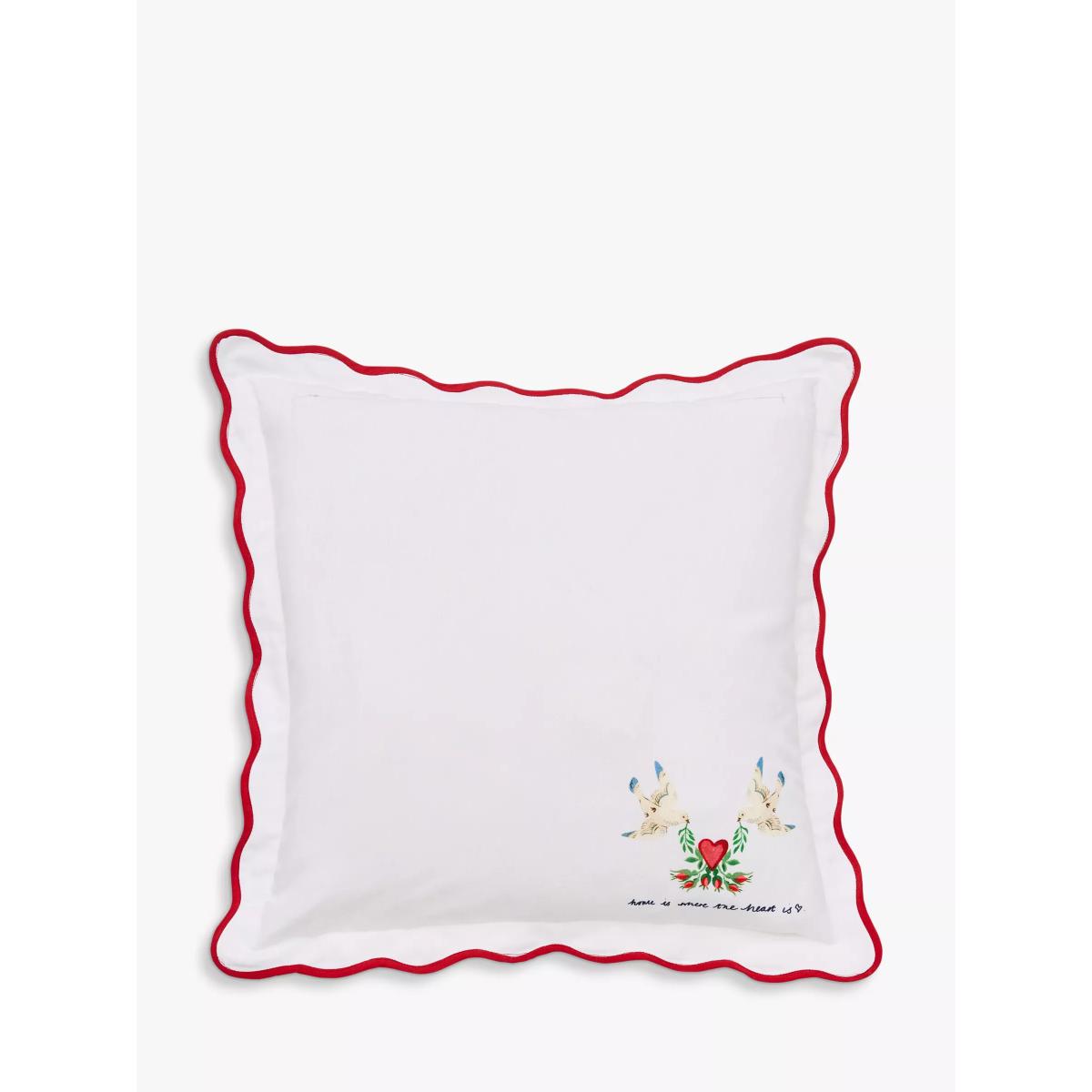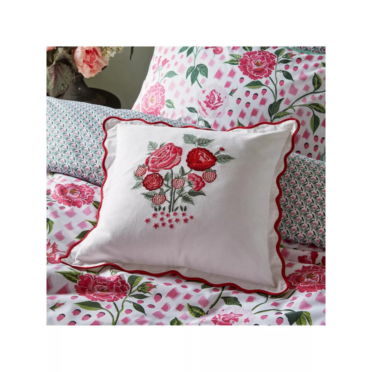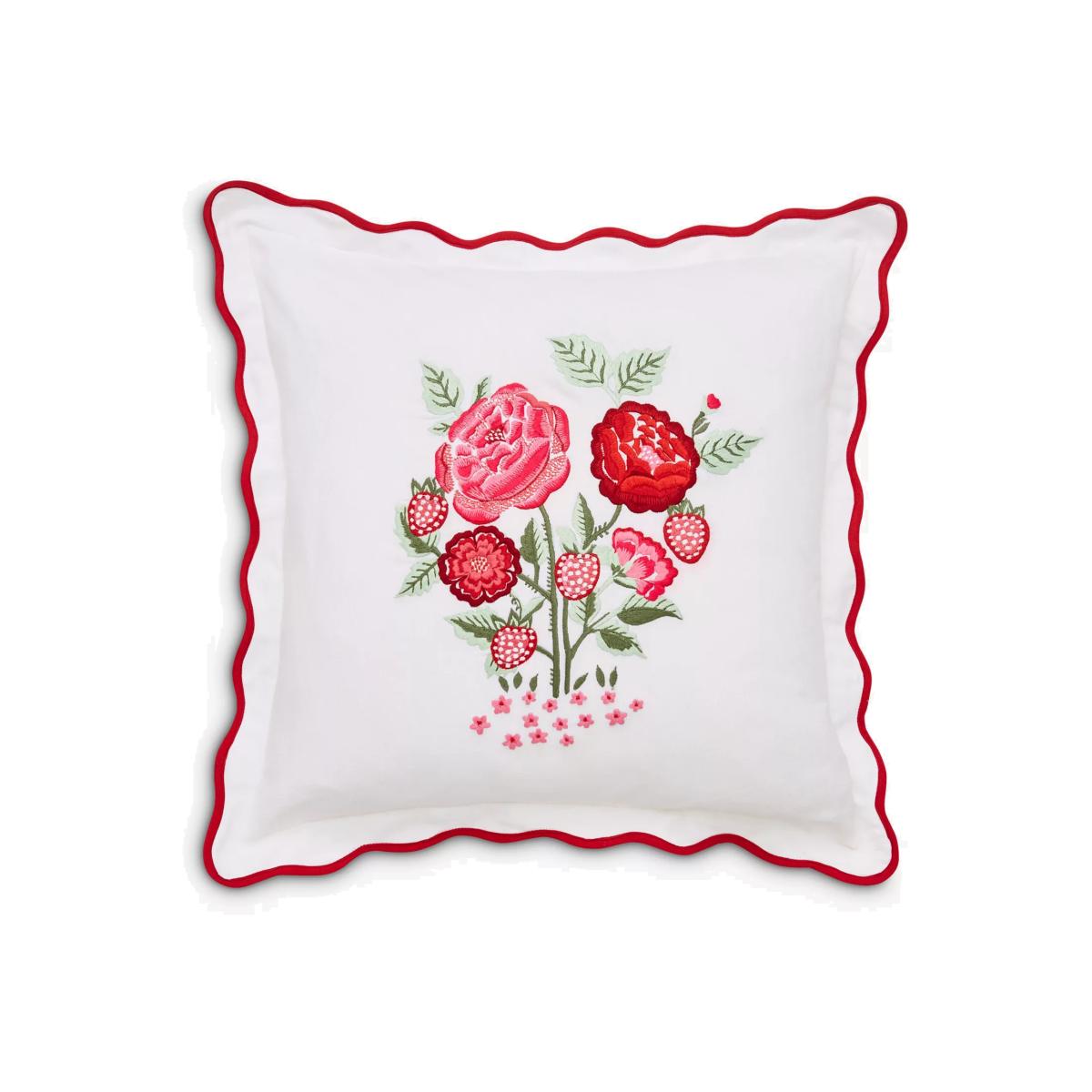 Lovingly embroidered, the strawberries and roses featured on this lovely cushion have all been inspired by archive Cath Kidston prints. Presented on cotton and beautifully finished with a bound scalloped edge featuring a pop of red colour - flip over for a hidden detail to remind you that home is where the heart is.