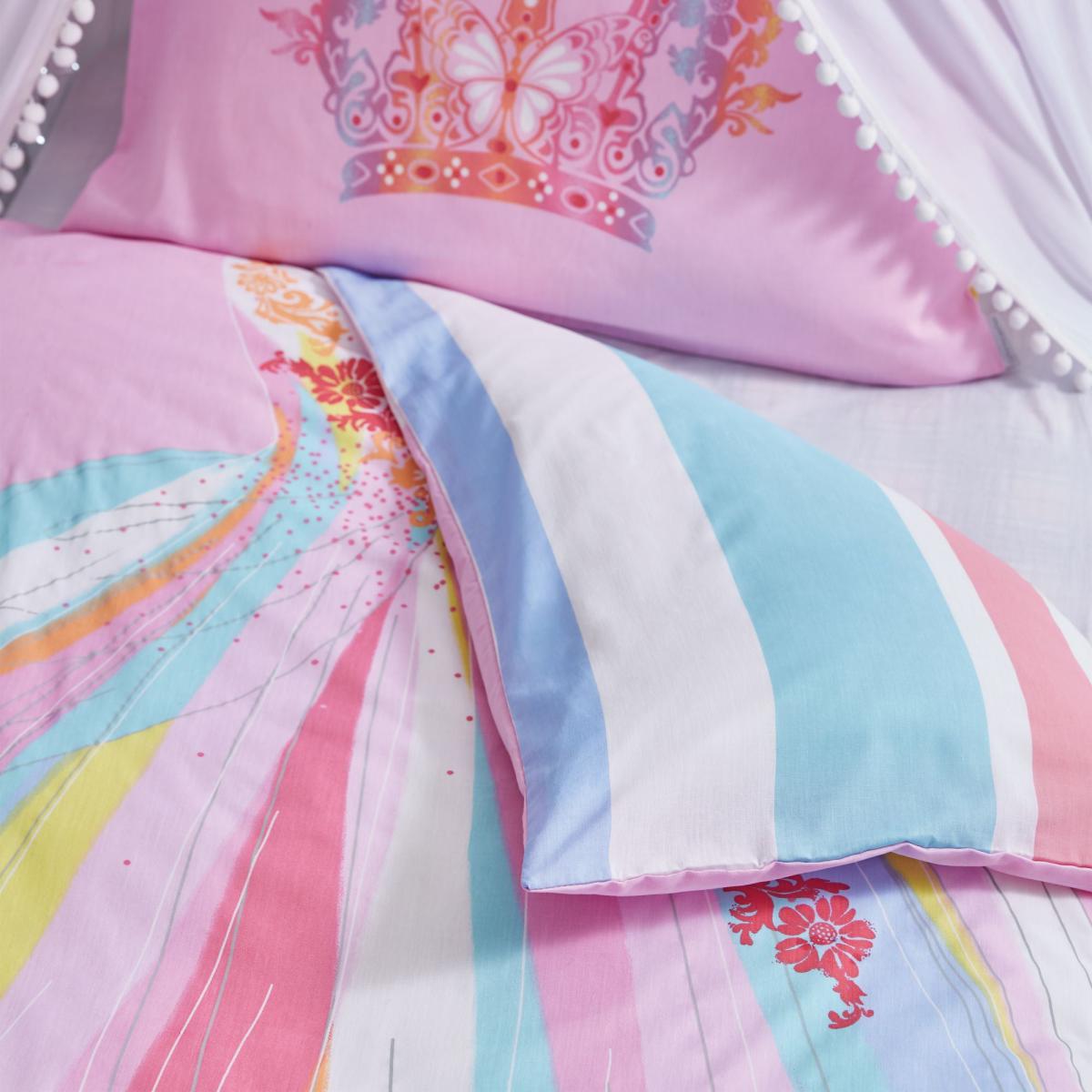 Step into an enchanted kingdom and become the lead Princess of your very own fairy tale from the moment you close your eyes. With a beautiful pastel colour palette and a stripe reverse for interchangeable styling, this duvet set will brighten up any bedroom. Designed by Catherine Lansfield, who is renowned for style and quality, these pieces have been made to quality and human-ecological safety standards, in accordance with STANDARD 100 by OEKO-TEX®. Finished with a button fastening, it is made from soft and comfortable easy care 52% Polyester 48% Cotton fabric, requires minimal ironing and can be machine washed at 40 degrees.