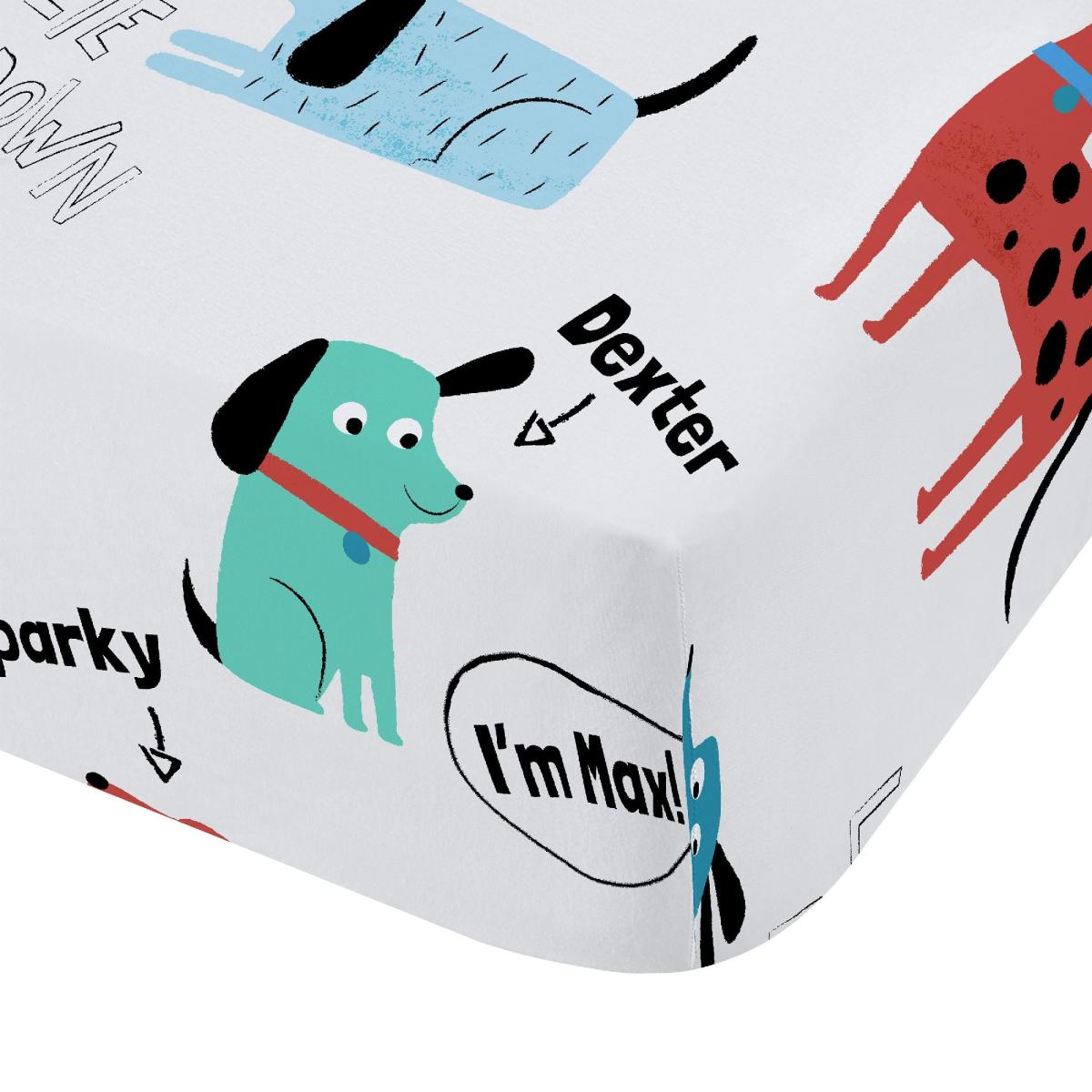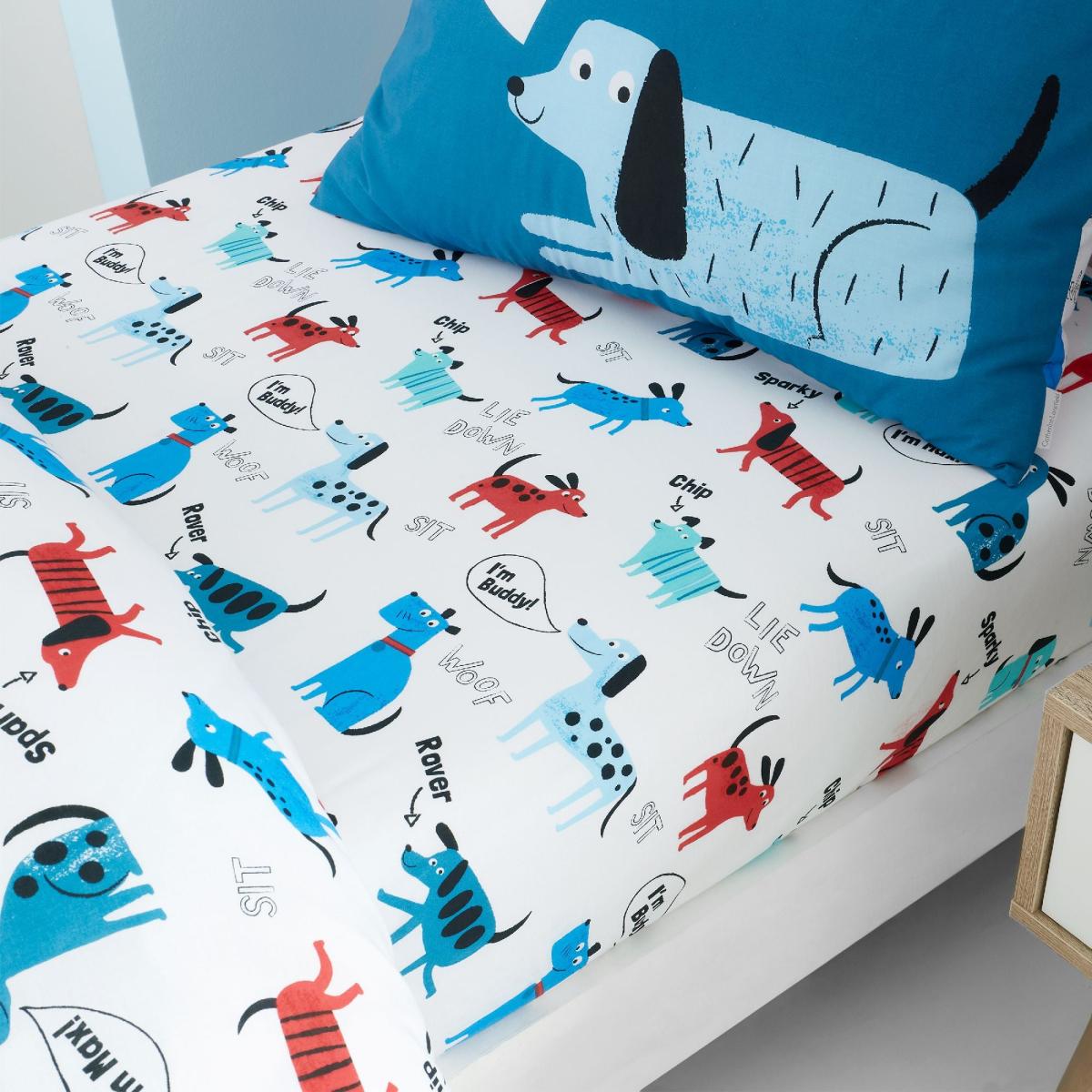 Catherine Lansfield Blue Woofing Dogs Fitted Sheet White/Blue/Red