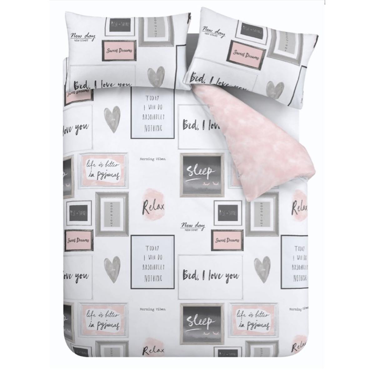 Relax in a contemporary soft blush pink & grey palette with this duvet cover and pillowcase set. Boasting a feel good print that features fun, cute on trend quotes, this set turns your bedroom into a happy zone with positive vibes! Turnover to a soft blush pink reverse - when nothing but pink will do! This set is available in a range of sizes.