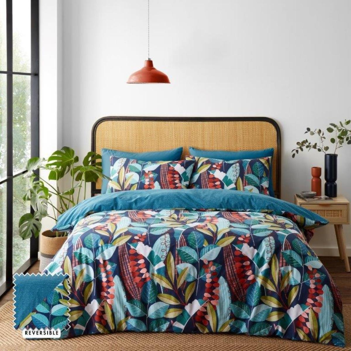 Bring bright and bold pattern to your bedroom with a colourful array of beautiful botanical leaves ,creating a fresh and lively atmosphere in any room. Fully reversible with a co-ordinating teal textured reverse, offering a versatile and stylish look. Created from easy-care and durable polycotton fabric perfect for everyday use. Catherine Lansfield is renowned for style and quality - designed and developed in Great Britain. Made to quality and human-ecological safety standards, in accordance with MADE IN GREEN by OEKO-TEX. Better Cotton- By choosing our cotton product, you're supporting Catherine Lansfield's investment in Better Cotton's mission. Better Cotton is sourced via a chain of custody model called mass balance, this means that this product may not contain Better Cotton, however Better Cotton Farmers benefit from the demand for Better Cotton in equivalent volumes to those used. Pillowcases included Pillowcase - 50x75cm 52% Polyester 48% Cotton Wash Before Use. Machine Wash at 40 Degrees. Tumble Dry Safe. All screens vary in colour reproduction and whilst every effort has been made to display the colour as accurately as possible it is for guidance only.