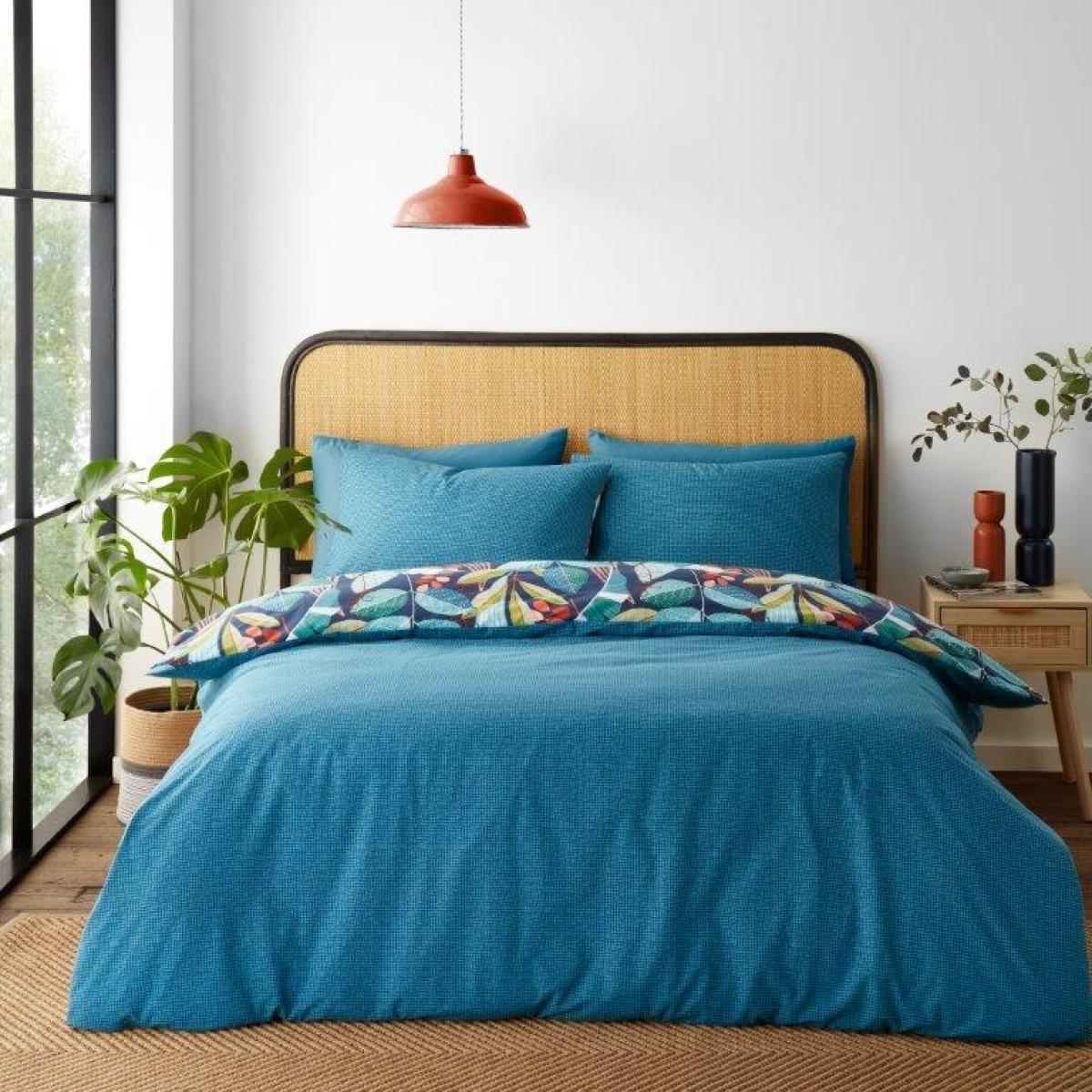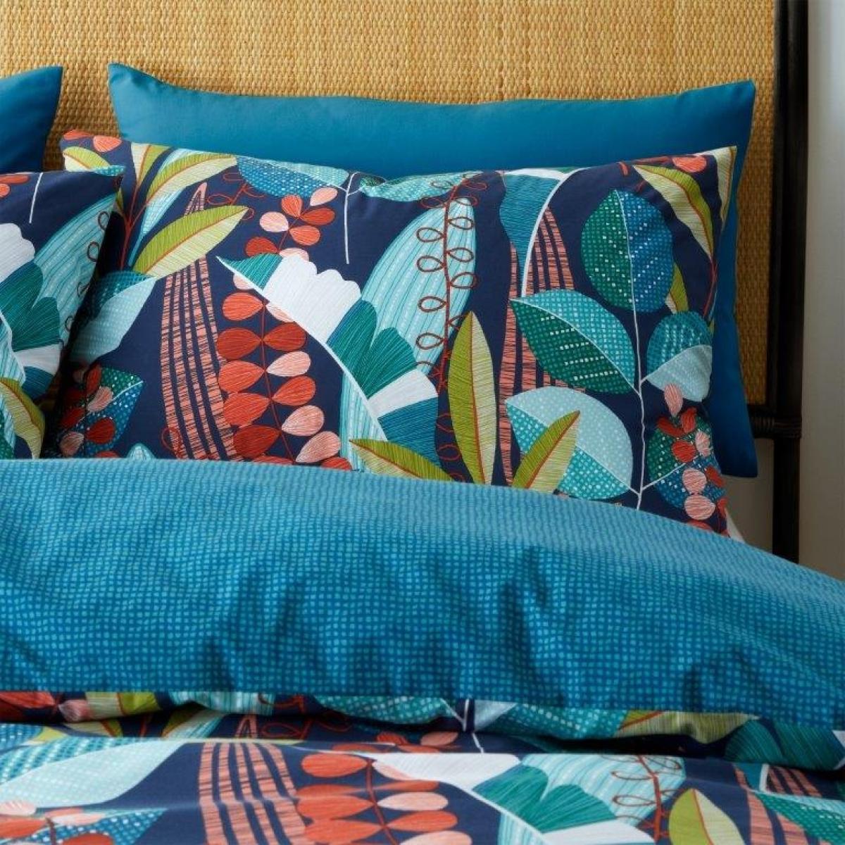 Bring bright and bold pattern to your bedroom with a colourful array of beautiful botanical leaves ,creating a fresh and lively atmosphere in any room. Fully reversible with a co-ordinating teal textured reverse, offering a versatile and stylish look. Created from easy-care and durable polycotton fabric perfect for everyday use. Catherine Lansfield is renowned for style and quality - designed and developed in Great Britain. Made to quality and human-ecological safety standards, in accordance with MADE IN GREEN by OEKO-TEX. Better Cotton- By choosing our cotton product, you're supporting Catherine Lansfield's investment in Better Cotton's mission. Better Cotton is sourced via a chain of custody model called mass balance, this means that this product may not contain Better Cotton, however Better Cotton Farmers benefit from the demand for Better Cotton in equivalent volumes to those used. Pillowcases included Pillowcase - 50x75cm 52% Polyester 48% Cotton Wash Before Use. Machine Wash at 40 Degrees. Tumble Dry Safe. All screens vary in colour reproduction and whilst every effort has been made to display the colour as accurately as possible it is for guidance only.