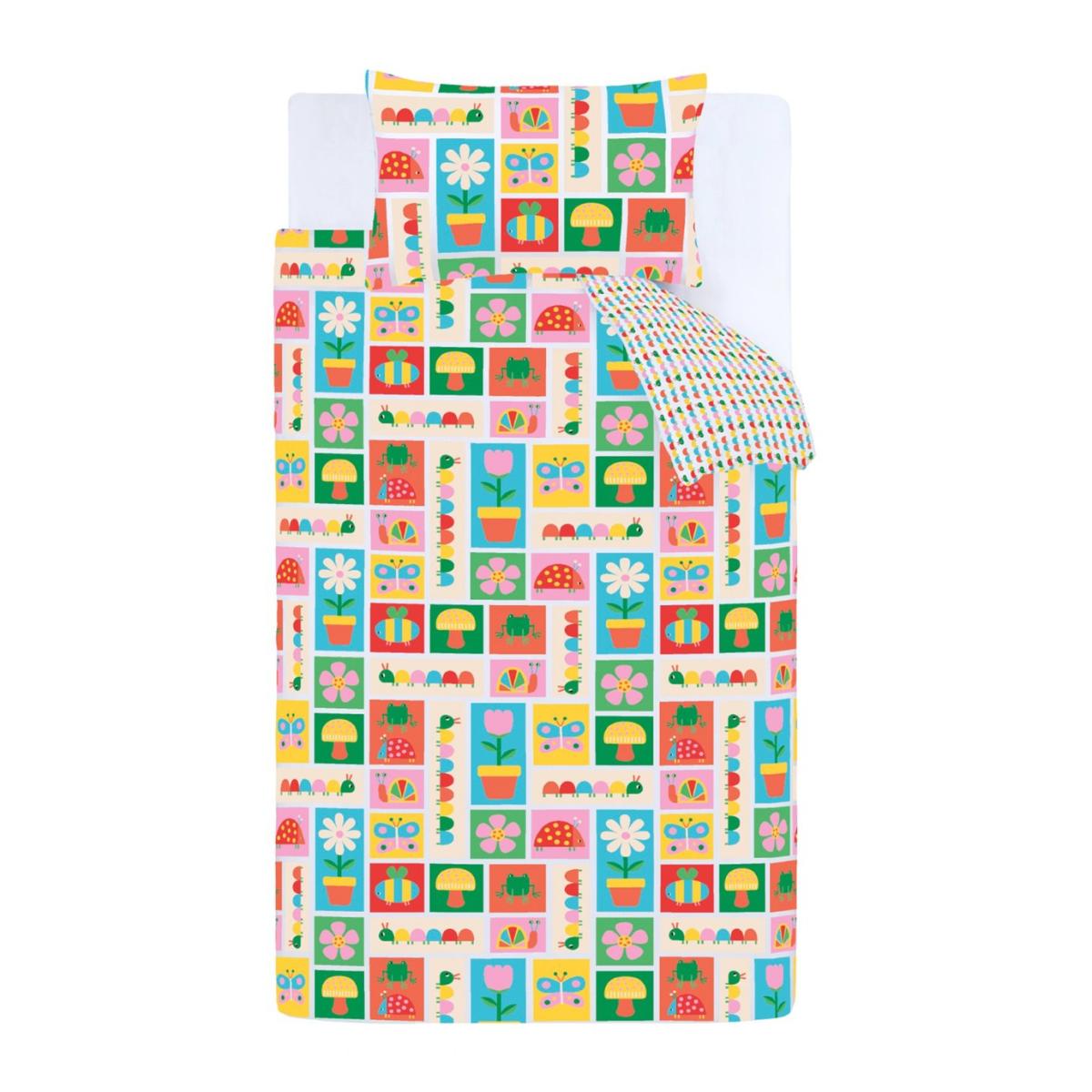 Brighten up your child's bedroom with our garden-themed bedding set, showcasing a playful collage of flowers, bugs, and mushrooms in bold, cheerful colours. The reverse features a fun wiggly caterpillar pattern, offering a fresh, playful look. Created from easy-care recycled polyester and soft cotton, blended for everyday use. This item carries the STANDARD 100 by OEKO-TEX logo, which means you can be certain that every component has been tested for harmful substances and is therefore harmless to human health. Set comprises of 1 duvet cover and 1 pillowcase. Multicoloured. Fabric finish: printed. Size L200 x W135cm. Pillow case length 75cm, Width 50cm. Standard pillowcase (s). Reversible. Buttons for fastening. Machine washable. Suitable for tumble drying. 52% polyester, 48% cotton. 138 thread count.
