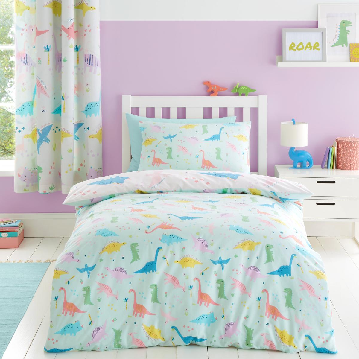 * Adorable Design* Soft polycotton composition* Button Fastening* Machine Washable* Corresponding items available Bring a touch of prehistoric charm to your child's bedroom with this reversible dinosaur-themed duvet set. Designed for little adventurers, it features friendly dinosaurs in soft pastel hues on one side, with a complementary blue reverse for a fresh look. The polycotton blend ensures a cozy and easy-care solution for daily use, while the button fastening keeps everything in place, allowing your child to sleep soundly through the night.