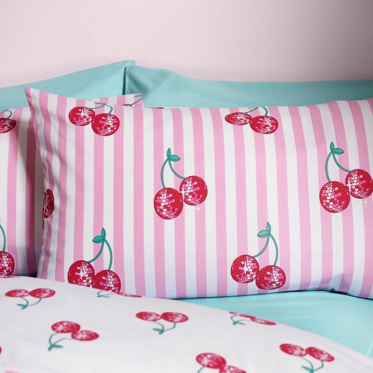 Bring playful retro charm to your bedroom with the Catherine Lansfield Cherry Print Bedding Set. Featuring bold pink and white stripes accented with unique disco ball cherries, this fully reversible design adds a fun and vibrant touch to any space. Crafted from a soft, easy-care blend of recycled polyester and cotton, it’s perfect for everyday comfort and durability. Designed and developed in Great Britain, Catherine Lansfield is renowned for style and quality. This bedding is also MADE IN GREEN by OEKO-TEX® certified, ensuring sustainable production and tested safety for your home. Features: 52% Polyester 48% Cotton Fully Reversible: For two stylish looks in one. Button Fastening: To keep your duvet securely in place. Contents: Duvet Cover & Pillowcase/s (single x 1, other sizes x 2) Care Instructions: Wash before use Wash at 40°C Tumble dry safe Please note, all screens vary in colour reproduction and whilst every effort has been made to display the colour as accurately as possible it is for guidance only.