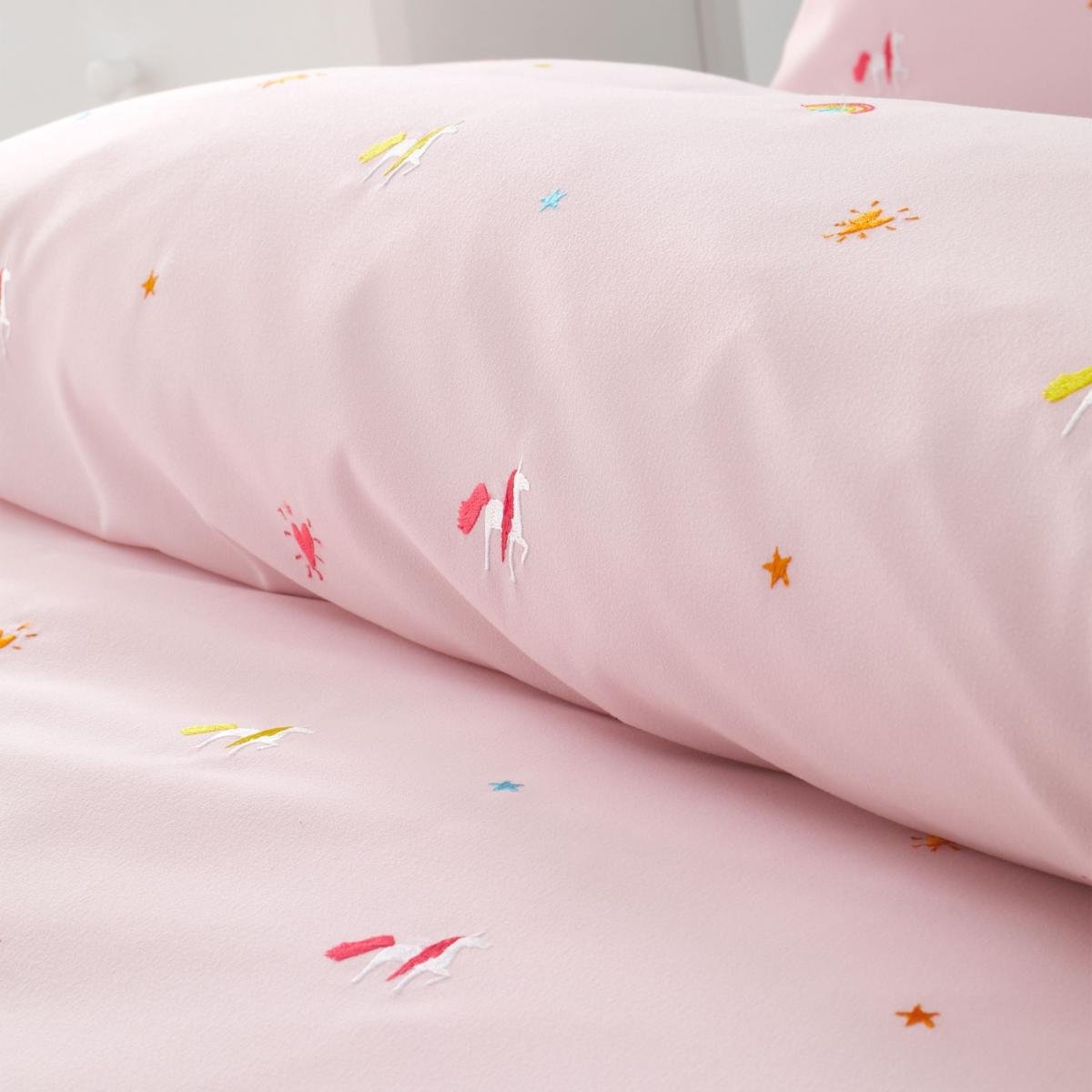 Drift into a world of magic and dreams with the Catherine Lansfield Embroidered Unicorn Duvet Set. Featuring delicate embroidered rainbows and playful unicorns prancing across a soft pastel pink base, this enchanting bedding set brings a touch of sparkle to bedtime. Crafted from smooth and cosy microfibre, it feels gentle against the skin, ensuring a restful and comfortable sleep. Perfect for little dreamers who love a touch of fairy-tale charm! Microfibre: Super soft and lightweight for lighter sleeping. Embroidered Detailing:For an added luxurious touch. Button Fastening: To keep your duvet securely in place. Envelope Closure: Providing a secure and snug fit for your pillow. 100% Polyester Includes Single Duvet Includes Single Pillowcase Double Duvet Includes Pair of Pillowcases Care Instructions Wash Before Use. Machine Wash at 40 Degrees. Tumble Dry Safe. Please note All screens vary in colour reproduction and whilst every effort has been made to display the colour as accurately as possible it is for guidance only.
