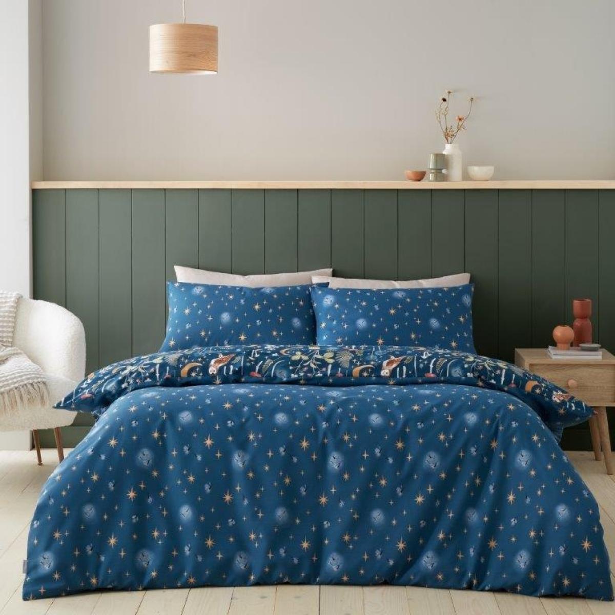 Create wonder and enchantment in your bedroom with this folklore style bedlinen. Featuring illustrations of the fox, the owl and rabbits, this bedlinen will add an element of charm and whimsy to your room. This fully reversible set features a star and feather pattern in a lighter tone providing an effortless backdrop. Created from easy-care recycled polyester and soft responsibly sourced cotton, blended together for everyday use. Features 52% Polyester 48% Cotton Easy to care polycotton Single Duvet Includes Single Pillowcase Double and King Size Duvet Includes Pair of Pillowcases Floral and wildlife design Fully reversible Button fastening Care Instructions Machine washable Iron on a cool setting, Tumble dry on a medium heat setting Please note All screens vary in colour reproduction and whilst every effort has been made to display the colour as accurately as possible it is for guidance only.