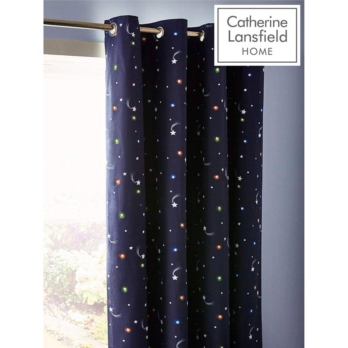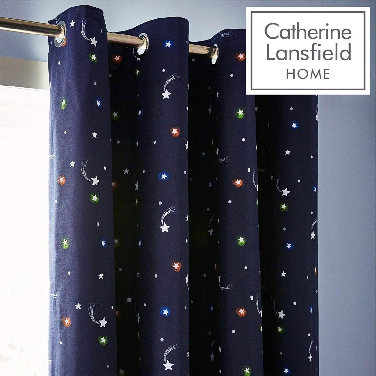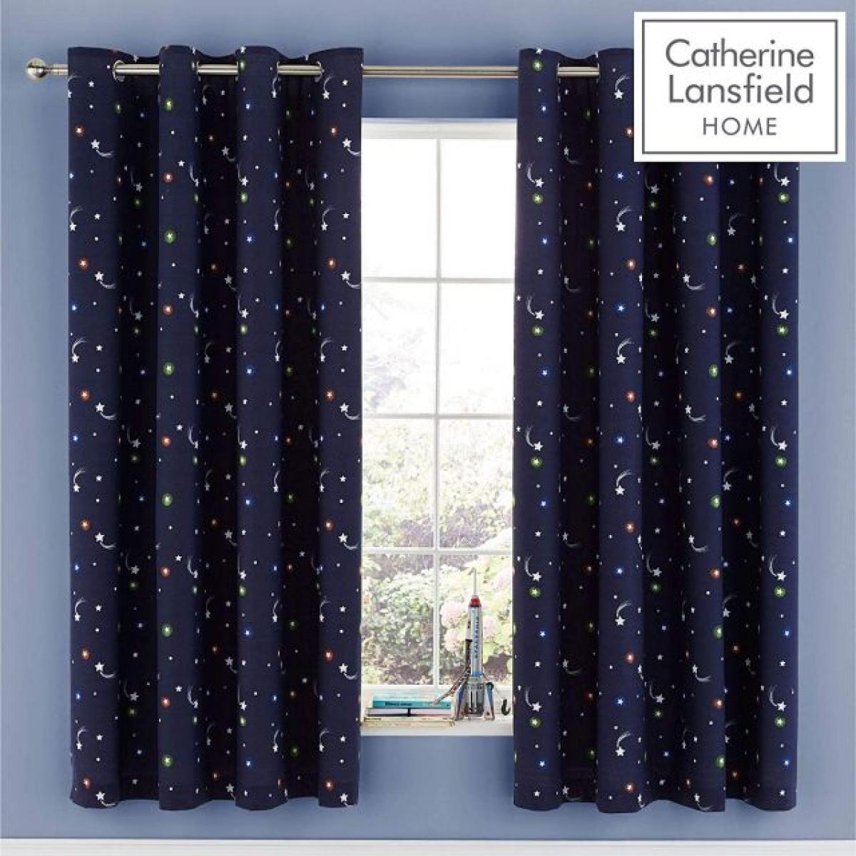 Kids with their head in the clouds are sure to fall asleep to dreams of exploring the Milky Way and beyond with the Happy Space eyelet curtains hanging in their sleep space. Designed by Catherine Lansfield, they're perfect for astronauts-in-waiting with a deep space backdrop featuring plenty of stars, meteors and galaxies swirling all around. They're topped with an eyelet header that makes them easy to hang from a pole without the need for additional hooks or rings. Also available - Fitted Sheet and Quilt Set Measuring 168 x 183 cm (66 x 72 inches), these curtains fit a rail width up to 229 cm (7ft 6). Material Content: 52% Polyester 48% Cotton Washing Instructions: Dry Clean Only Fully Lined This pack contains on pair of eyelet 66x72inch (168x183cm) curtains.