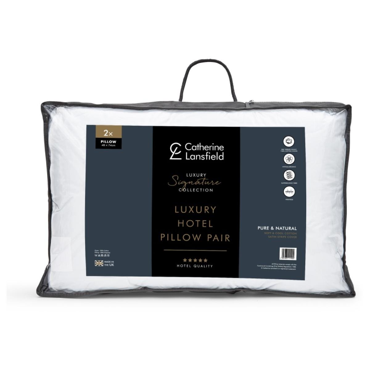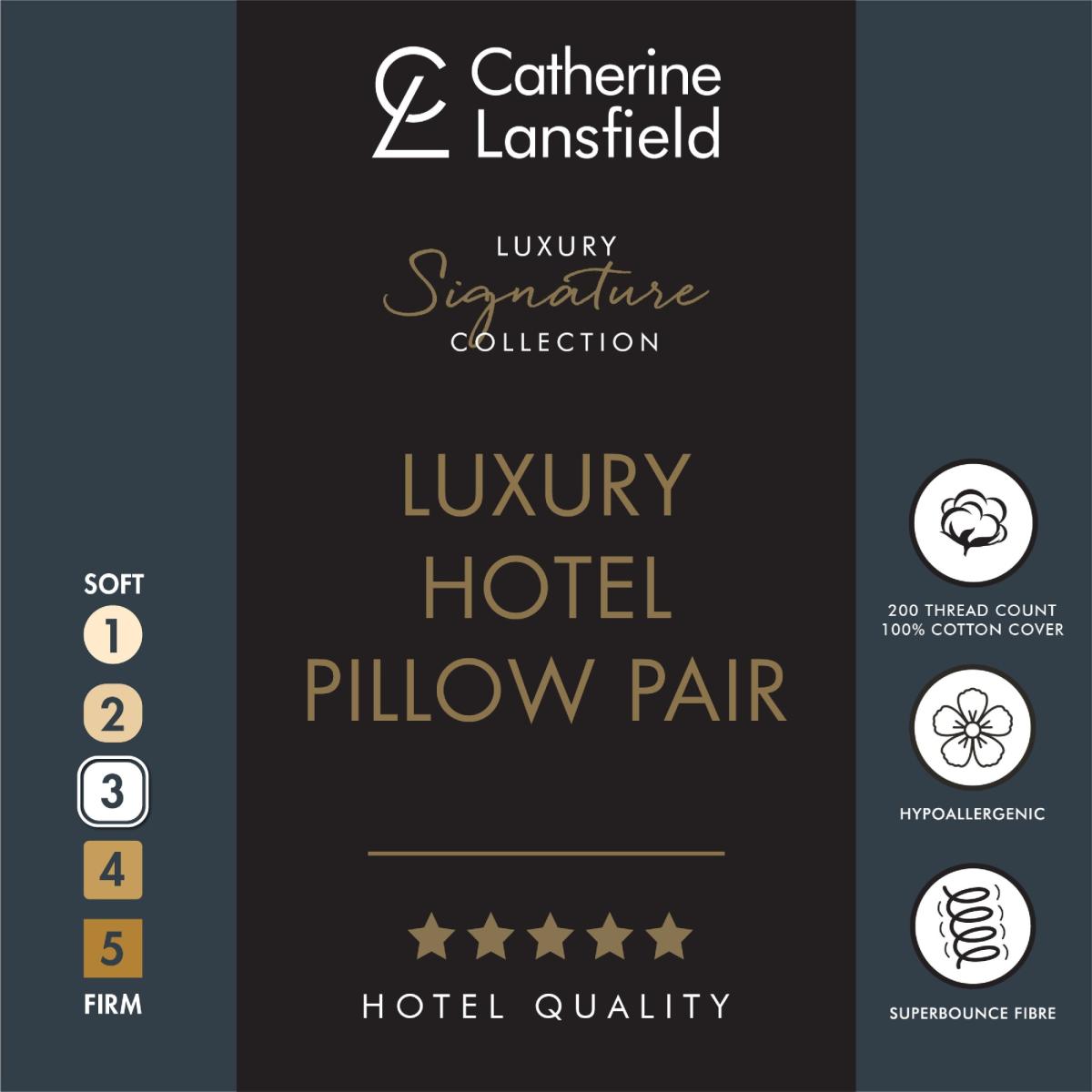 Indulge in the ultimate sleeping experience with this Luxury Signature Hotel pillow pair from Catherine Lansfield. Created with a 200 thread count cotton cover, this pillow is soft, smooth, and gentle on your skin, ensuring that you wake up feeling refreshed. The super bounce fibres provide maximum comfort and support for your head and neck. The medium firmness of this pillow is perfect for those who prefer a balanced level of support and softness, no matter what your sleeping position. Pure 100% Cotton Cover:The natural fibres of cotton create a fabric that is smooth and comfortable to touch.  Anti- Allergy: Breathable: Allowing air to move and moisture to evaporate. Medium firmness:For those who prefer a balanced level of support and softness.