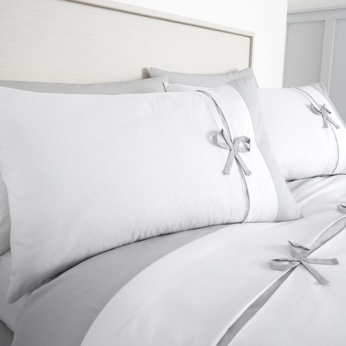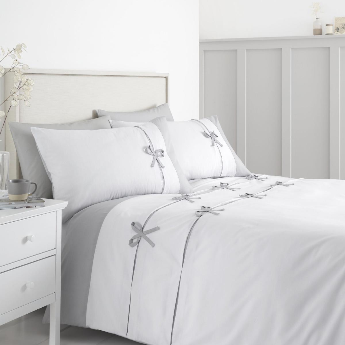 Catherine Lansfield Milo Bow White and Grey Duvet Cover and Pillowcase Set Light Grey
