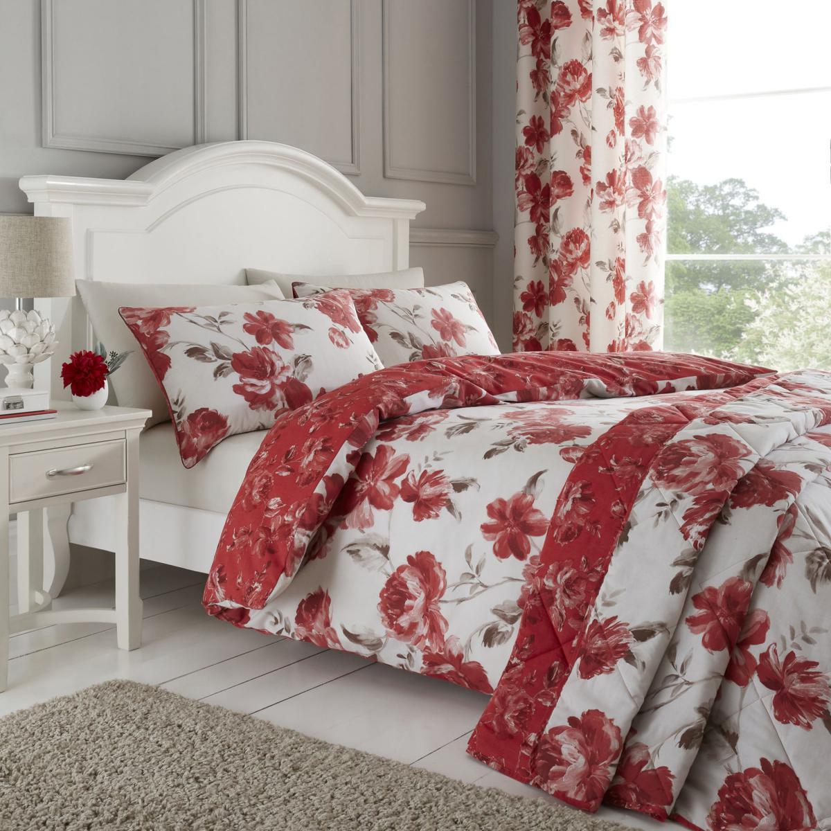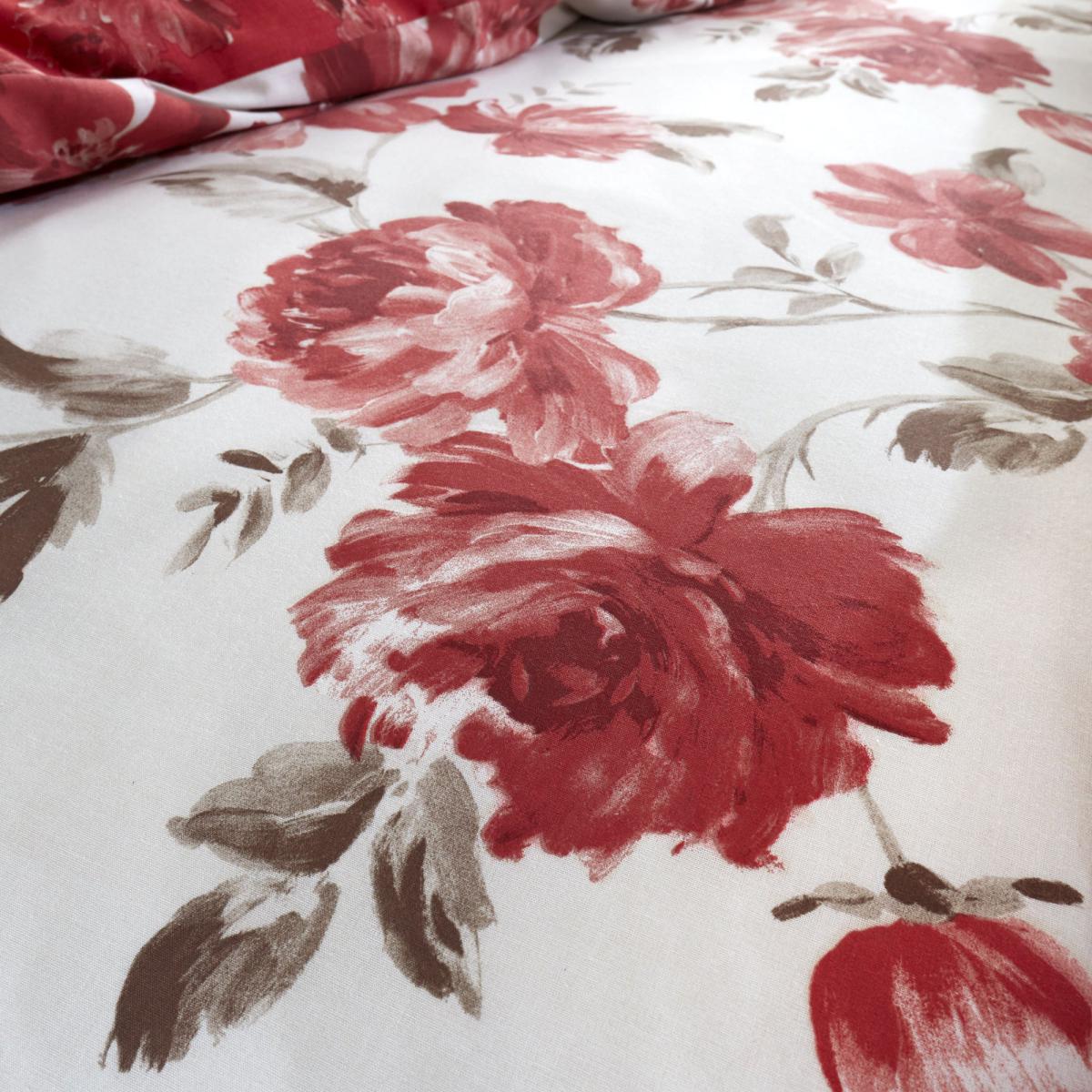 Featuring deep red roses, this bedding set creates the perfect contrast against the soft natural background, resulting in a truly striking design. With a deep red reverse covered in smaller roses, this bedding set allows for alternative styling. Made from soft and comfortable easy care 52% polyester 48% cotton fabric, this duvet cover and pillowcase set is durable, machine washable and requires minimal ironing. Catherine Lansfield is renowned for style and quality - designed and developed in Great Britain.