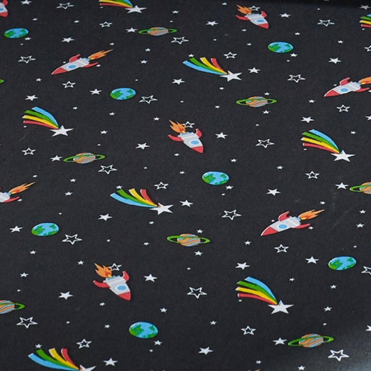 * Fun rocket design * Coordinating items available * Elasticated edging for snug and comfortable fit Blast off to bedtime with the Catherine Lansfield Rainbow Rockets Fitted Bed Sheet, a bold and brilliant choice for budding astronauts. Designed in Great Britain and crafted from a soft polycotton blend, it's made for comfort and everyday durability. The vibrant print of rockets, rainbows, planets and stars pops against a deep black atmosphere, bringing cosmic charm to any child's room. Fully elasticated for a secure fit and suitable for smaller depth mattresses, it stays put through every twist and turn. Easy to care for and machine washable, it's as practical as it is playful. Available in a range of sizes to suit every space explorer's sleep station.