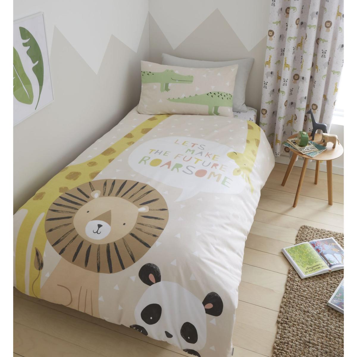 In a hand drawn Scandi style, this fun design featuring charming animals have positive messages for the happy future, mini animal and geo reverse also offers versatile styling. Created from easy-care recycled polyester and soft cotton, blended for everyday use. This item carries the STANDARD 100 by OEKO-TEX logo, which means you can be certain that every component has been tested for harmful substances and is therefore harmless to human health. Set comprises of 1 duvet cover and 1 pillowcase. Natural. Fabric finish: printed. Size L200 x W135cm. Pillow case length 75cm, Width 50cm. Standard pillowcase (s). Reversible. Buttons for fastening. Machine washable. Suitable for tumble drying. 52% polyester, 48% cotton. 138 thread count.