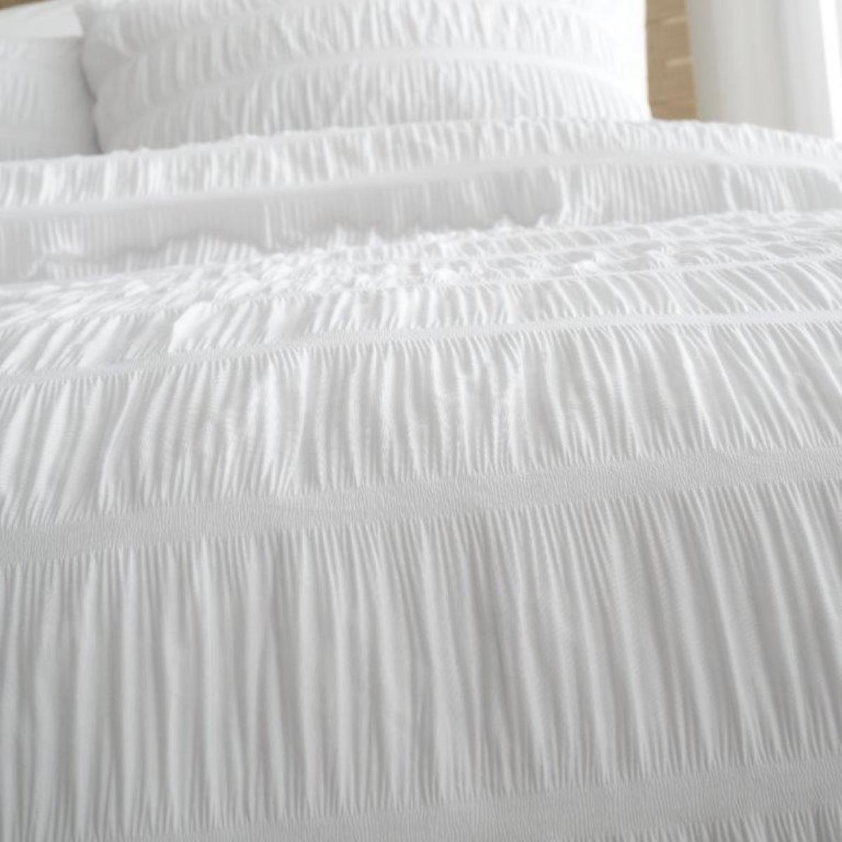 Catherine Lansfield Bedding Seersucker Duvet Cover Set with Pillowcases White. Refresh your room with a classic texture, this banded seersucker stripe bedlinen combines contemporary living with classic styling. Ruched Detailing, Button Fastening, On-Trend Style. 55% Cotton 45% Polyester Wash Before Use. Machine Wash at 40 Degrees, Tumble Dry Safe. Ethically sourced overseas and made to quality and human-ecological safety standards, in accordance with MADE IN GREEN by OEKO-TEX. Better Cotton- By choosing our cotton product, you're supporting Catherine Lansfield's investment in Better Cotton's mission. Better Cotton is sourced via a chain of custody model called mass balance, this means that this product may not contain Better Cotton, however Better Cotton Farmers benefit from the demand for Better Cotton in equivalent volumes to those used. Set includes: Duvet cover and 2 x Standard pillowcases (1 x pillowcase in single set) All screens vary in colour reproduction and whilst every effort has been made to display the colour as accurately as possible it is for guidance only.