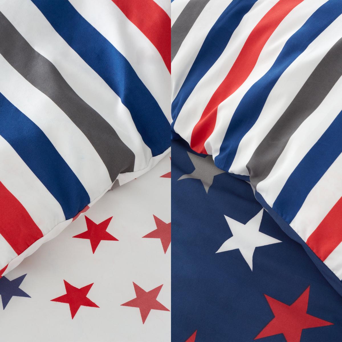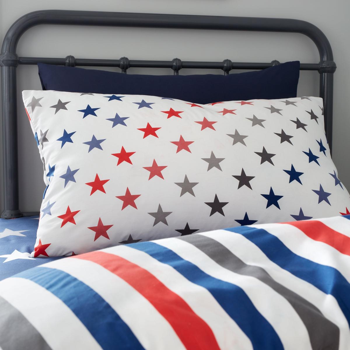 * Durable Polyester composition * Striking star design * Machine Washable * Corresponding items available Give your little one's bedroom a patriotic and playful update with the Stripes and Stars Duvet Cover Set. This two-pack set features four complementary looks in one, ensuring stylish variety and easy bed changes. Inspired by American flag motifs, these designs showcase bold red, white, and blue tones, creating a vibrant and cheerful sleep space. Made from soft microfibre, this set is lightweight, comfortable, and effortless to maintain, offering a snug and stylish night’s sleep.