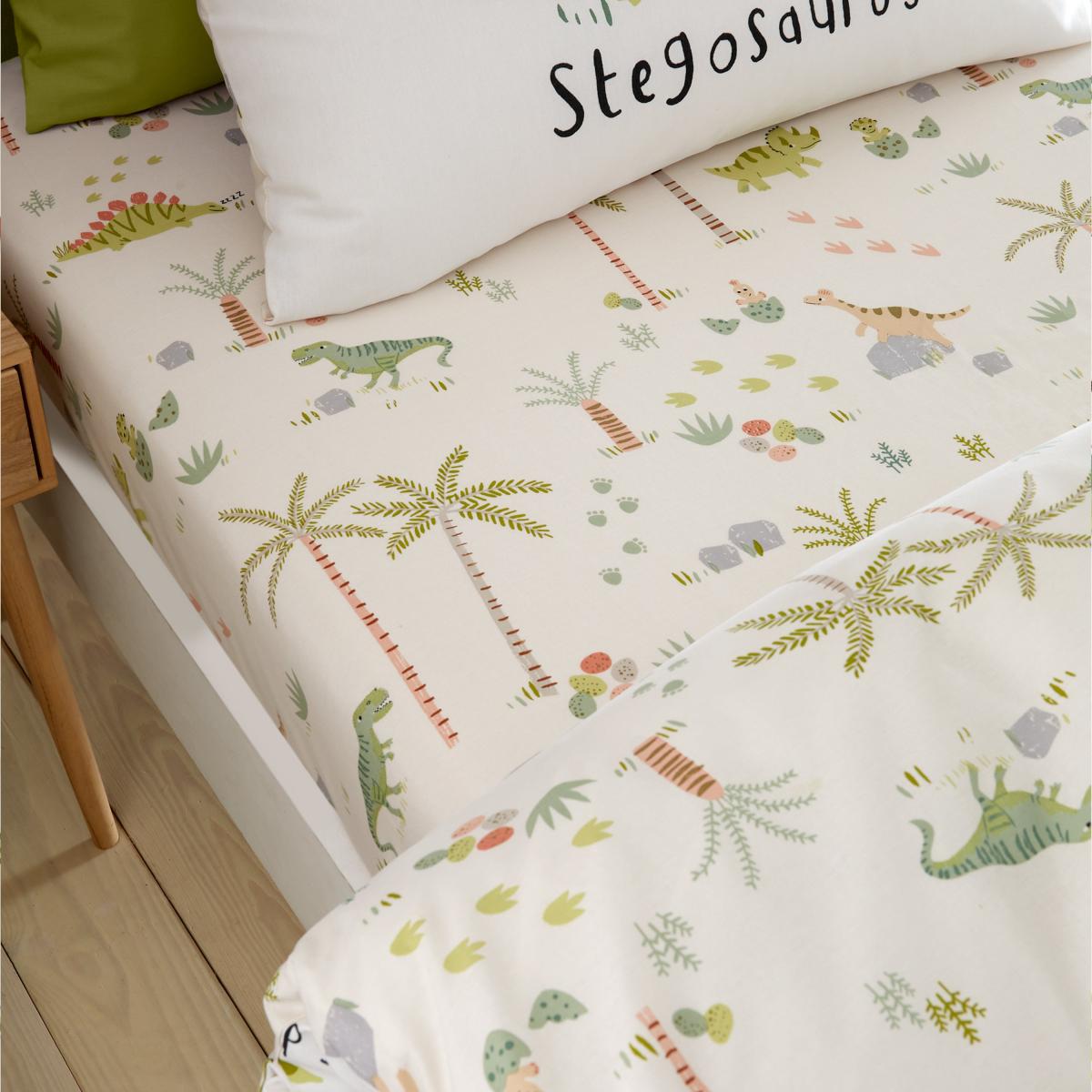 * Easy to care for, breathable Polycotton composition * Adorable dinosaur design * Machine Washable * Corresponding items available Send your little explorer off to dreamland with the Catherine Lansfield Sleepy Dino Fitted Sheet. Featuring adorable dinosaurs roaming through lush greenery, this playful design brings a sense of adventure to bedtime. Made from an easy-care polycotton blend, it provides a soft, breathable, and durable sleeping surface. Fully elasticated for a secure fit, this fitted sheet is also machine washable for easy upkeep. This collection is verified by OEKO-TEX® and independently tested for harmful substances as well as manufactured using sustainable processes under socially responsible working conditions. MADE IN GREEN by OEKO-TEX® is a unique product label to trace the countries and production facilities - search the product label for more information.