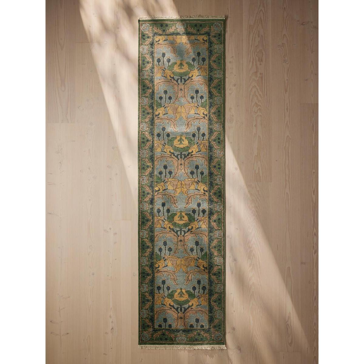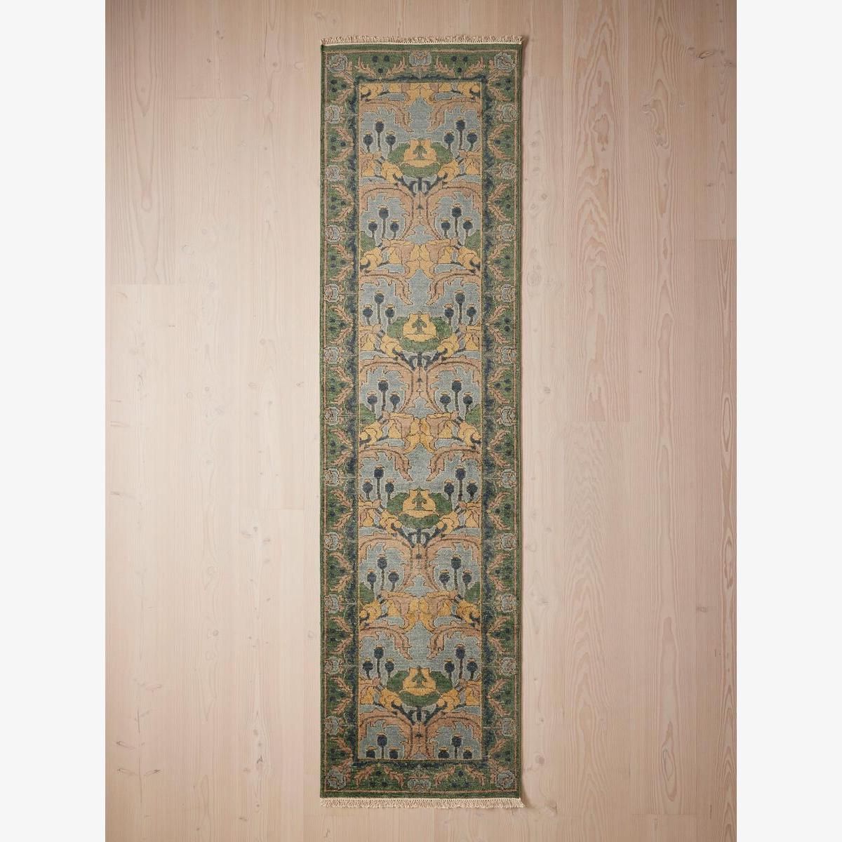 The decorative flowers and fine-art elements in this runner nod to the Arts and Crafts movement and the vintage pieces found in Babington House. Hand-knotted in India by skilled artisans, the Catherine runner features a cotton ground and soft, wool pile to ensure comfort underfoot. Tonal blue and green tones breathe colour and life into all living areas, bedrooms, and offices. Hand-knotted runner Navy and green tones Wool pile with cotton ground Sheared pile for soft finish Washed for natural softness and lustre Crafted in India using a Gabbeh dyeing technique Available in five sizes and two runners Comes in two colours Inspired by the textiles found in Babington House