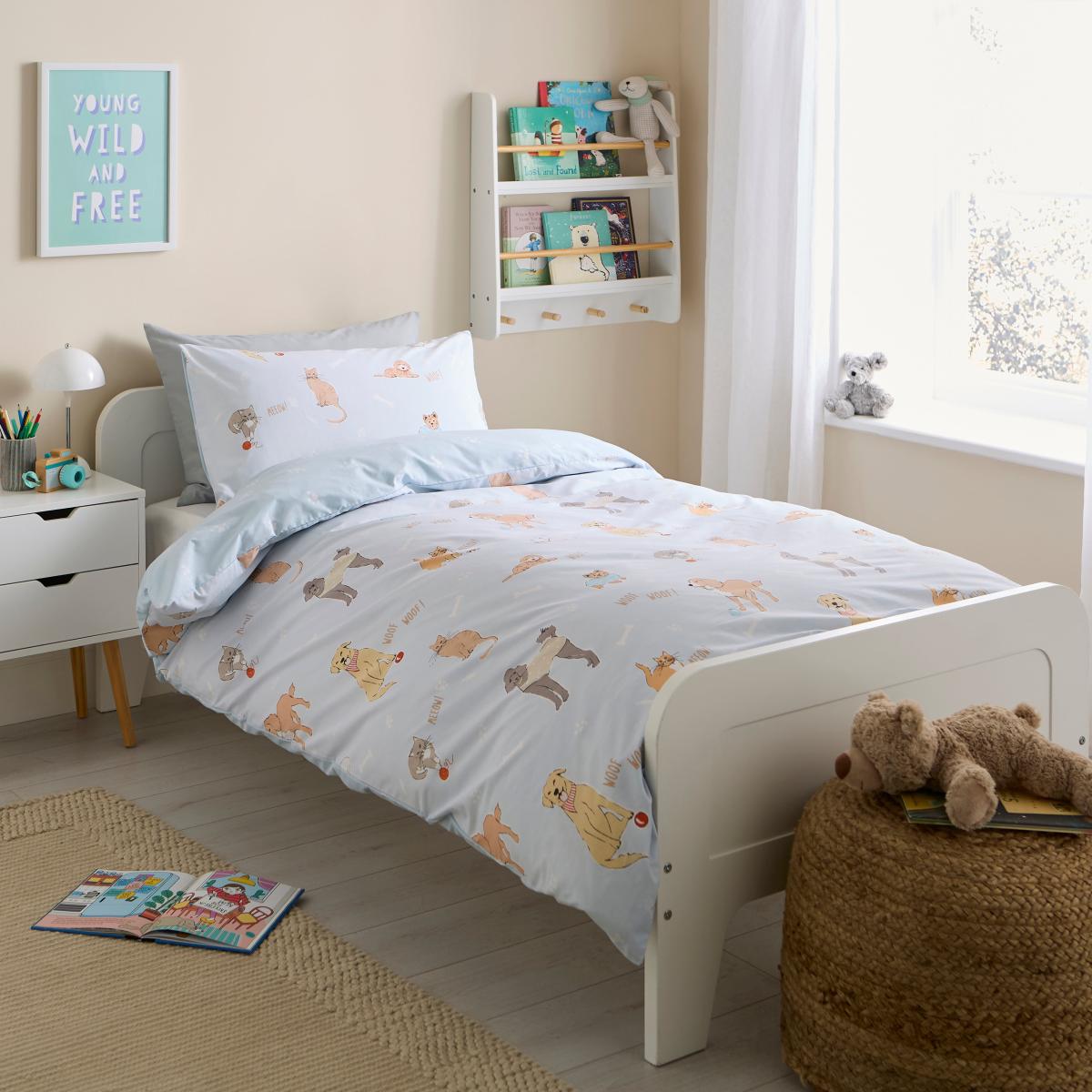 I love this set because it adds a playful, friendly vibe to a child's room while remaining easy to style around. Its soft colours and charming dog and cat illustrations make it versatile for both modern and traditional nurseries or bedrooms. It works particularly well with neutral or pastel walls, and can be paired with a variety of bedding accessories or soft furnishings, like textured throws or colourful cushions, to create a cosy space. Practical styling tips include mixing it with more muted or patterned duvet covers for visual interest, and keeping furniture and accessories simple to let the bedding be the star of the room. It’s a fun yet adaptable choice that can grow with your little one.