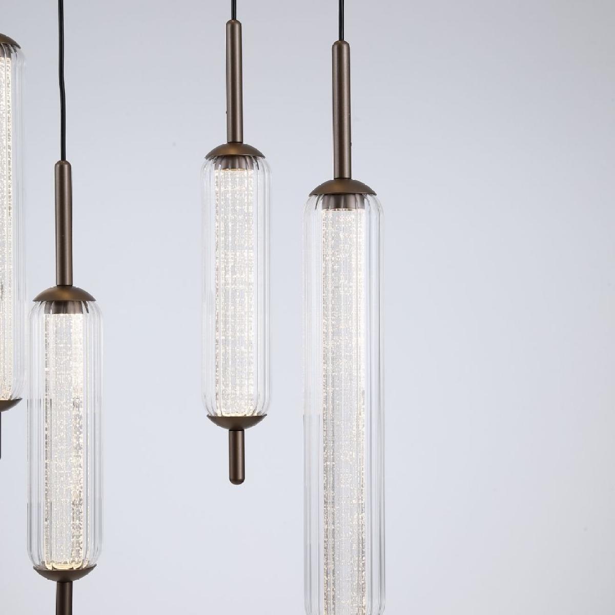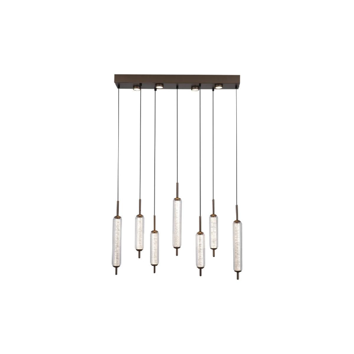Introducing the Cattail LED Pendant – a stunning multi-drop light inspired by the natural elegance of wetland cattails, reimagined in a contemporary design. This impressive fixture makes a bold statement, perfectly suited to rooms with high ceilings, grand stairwells, or as a dramatic focal point above dining tables or kitchen islands, where its sculptural form is sure to spark conversation. The design features seven tube glass cylinder shades suspended from a latte-toned ceiling plate, perfectly mimicking the natural clustering and graceful sway of cattail reeds. The integrated LED system delivers comprehensive warm white lighting that transforms your space's ambience, while four additional GU10 LED spots (bulbs sold separately) positioned in the ceiling plate maximise overall illumination and coverage. Product dimensions: H150-35xW17xL8. 5 cm Integrated LED - Warm white light (3000 Kelvins) 1125 Lumens Dimmable Requires 4x GU10 (Sold separately) for the fixture plate