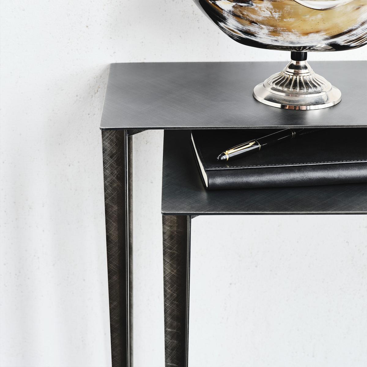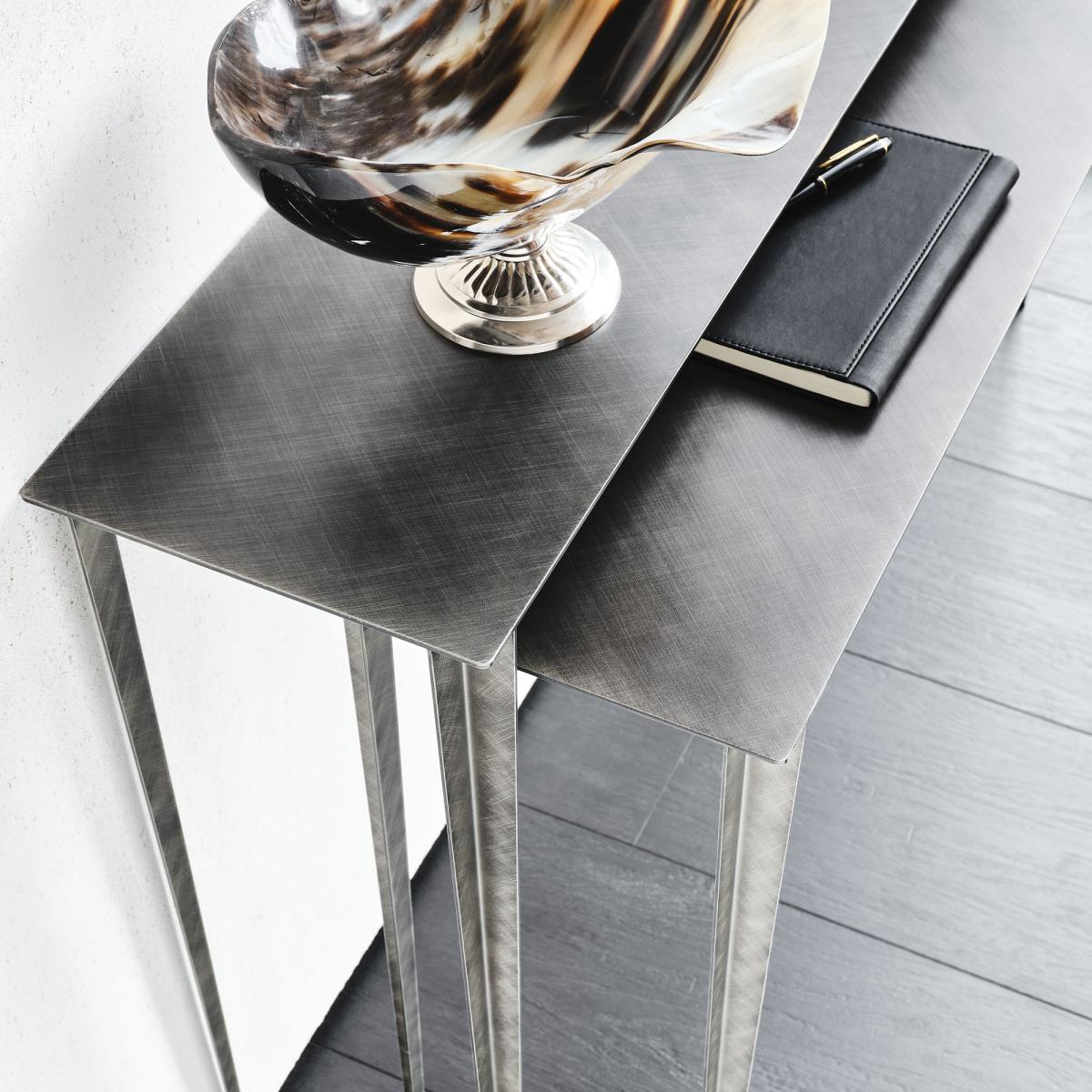 Etoile is a set of two console tables for multi-purpose use and styling by Cattelan Italia. With beautiful sleek structures, each table gives an air of grace and lightness with a brushed grey finish, showing an etched pattern for modern luxe. Tapered legs with brass finishings complete Etoile, making it the perfect addition if seeking an ultra-modern design.