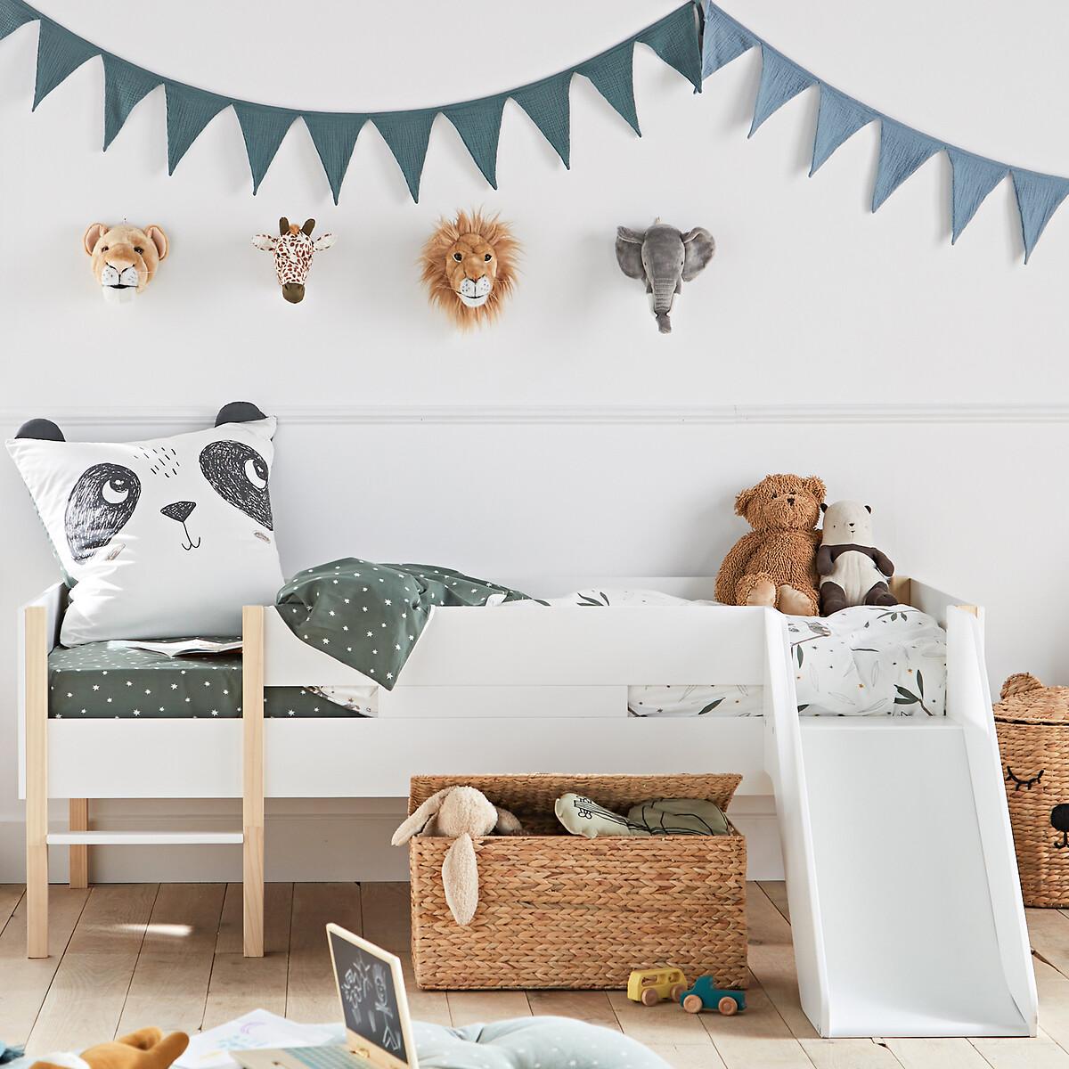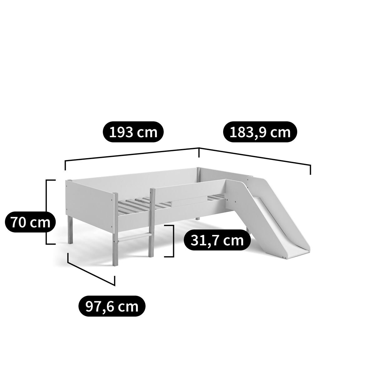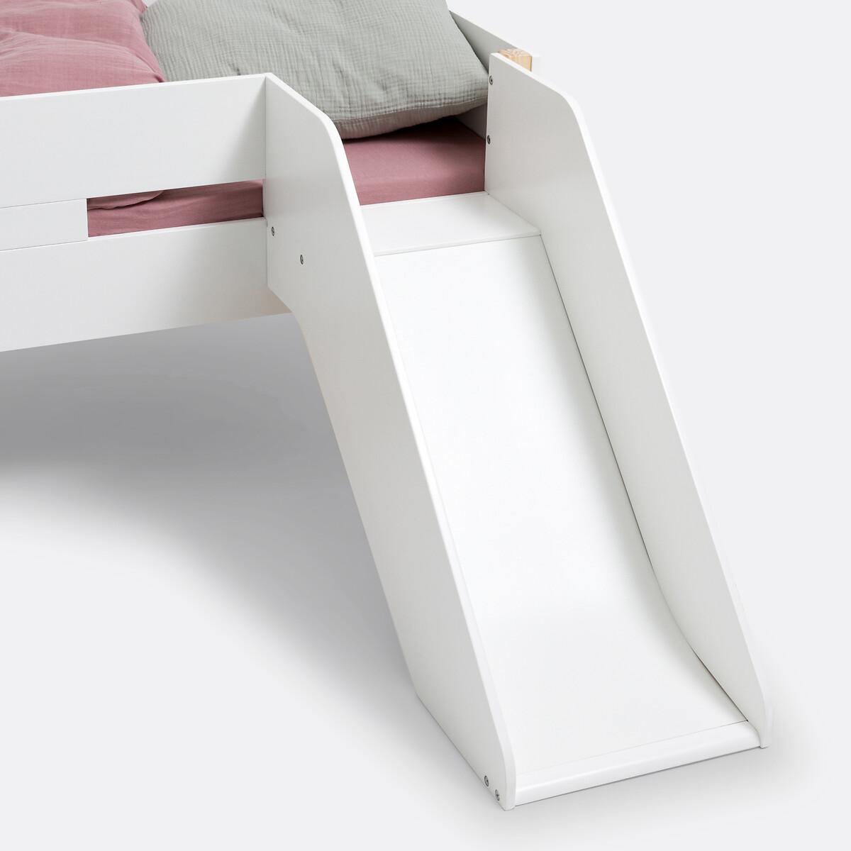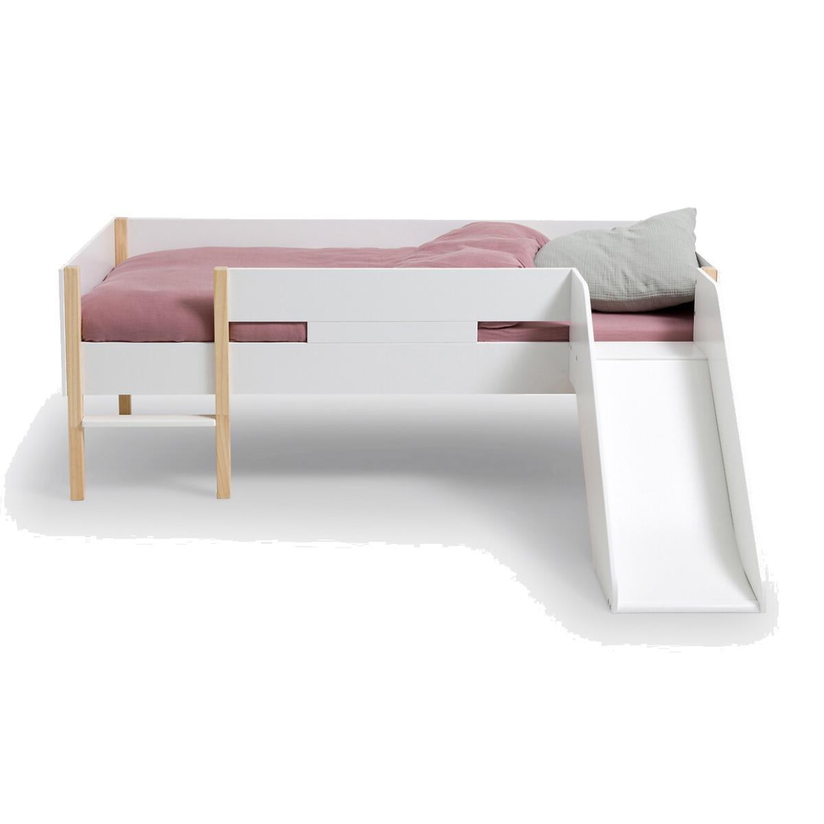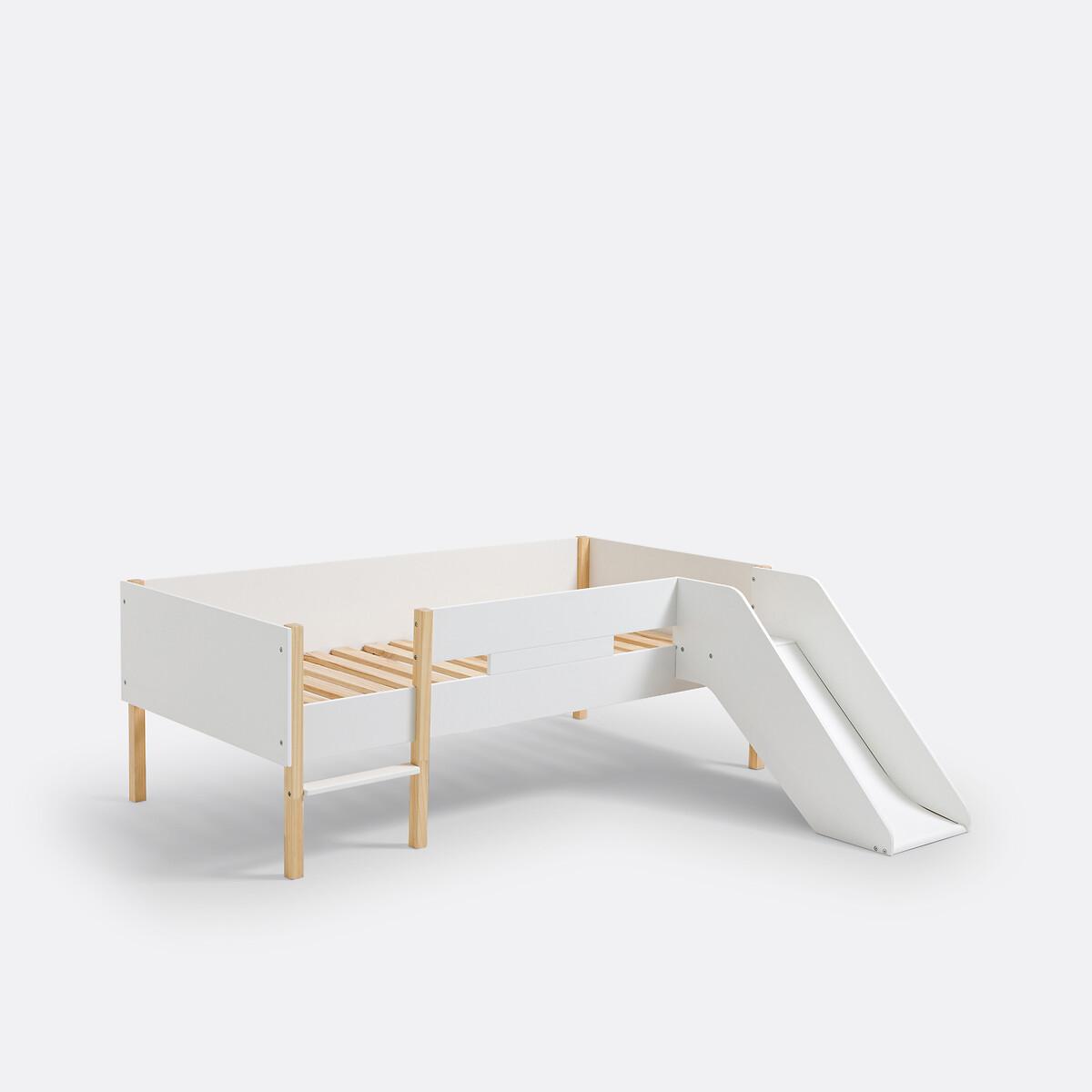 The Caume slide bed has many good points: a structure and base in solid pine, FSC® certified pine, a slightly raised space under the bed ideal for storing toys... And, above all, a slide to get up on the right foot!Product Details • FSC®-certified solid pine and MDF structure • Water-based acrylic paint finish • FSC®-certified solid pine slatted base • Sleeping area: 90 x 190cm. Quality Info • This product complies with current safety requirements. • This bunk bed is not suitable for children under 6 years of age. ATTENTION, slide: • designed for home use • Minimum age: From 6 Years • Maximum weight : 50kg. Dimensions • Length: 193cm • Height: 70cm • Depth Including Slide: 183.9cm • Depth Without Slide: 97.6cm • Under bed: H31.7cmDelivery:. This product is sold ready to assemble. Note! Please check that all access points are large enough to accommodate your delivery (doors, stairs, lifts). • WOOD FROM SUSTAINABLY MANAGED FORESTS. FSC® certified wood comes from forests that are environmentally, socially and economically well managed. Dimensions and weight of parcel2 parcels • L192.1 x H5.6 x D60.8cm. 22kg • L117.1 x H12.2 x D61.4cm. 29.5kg