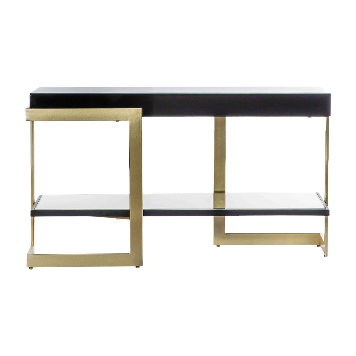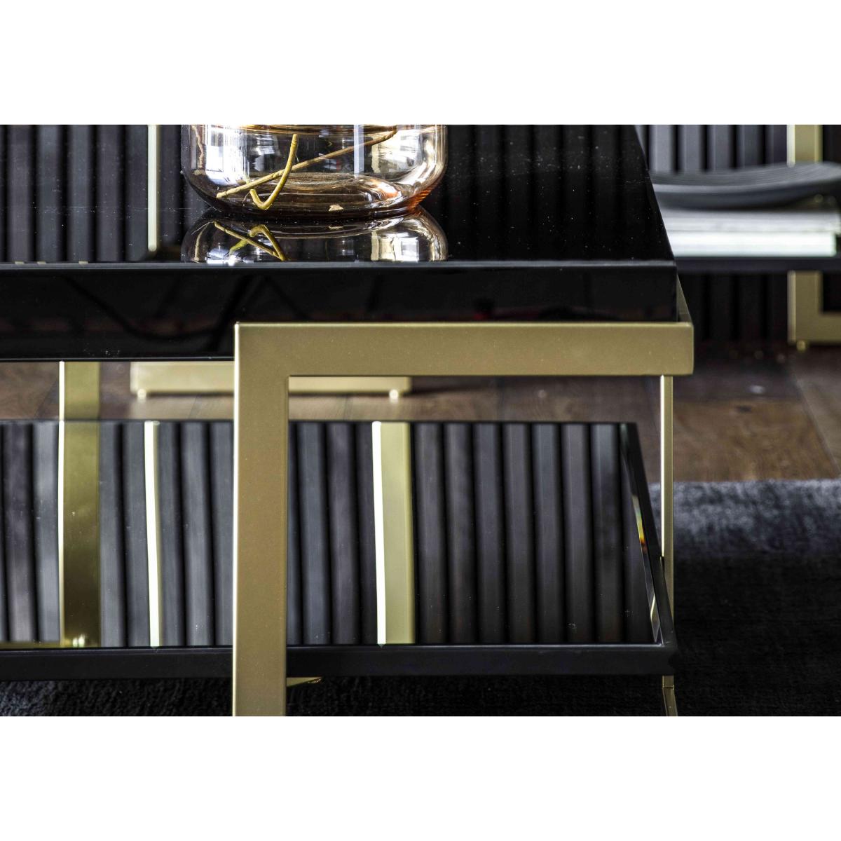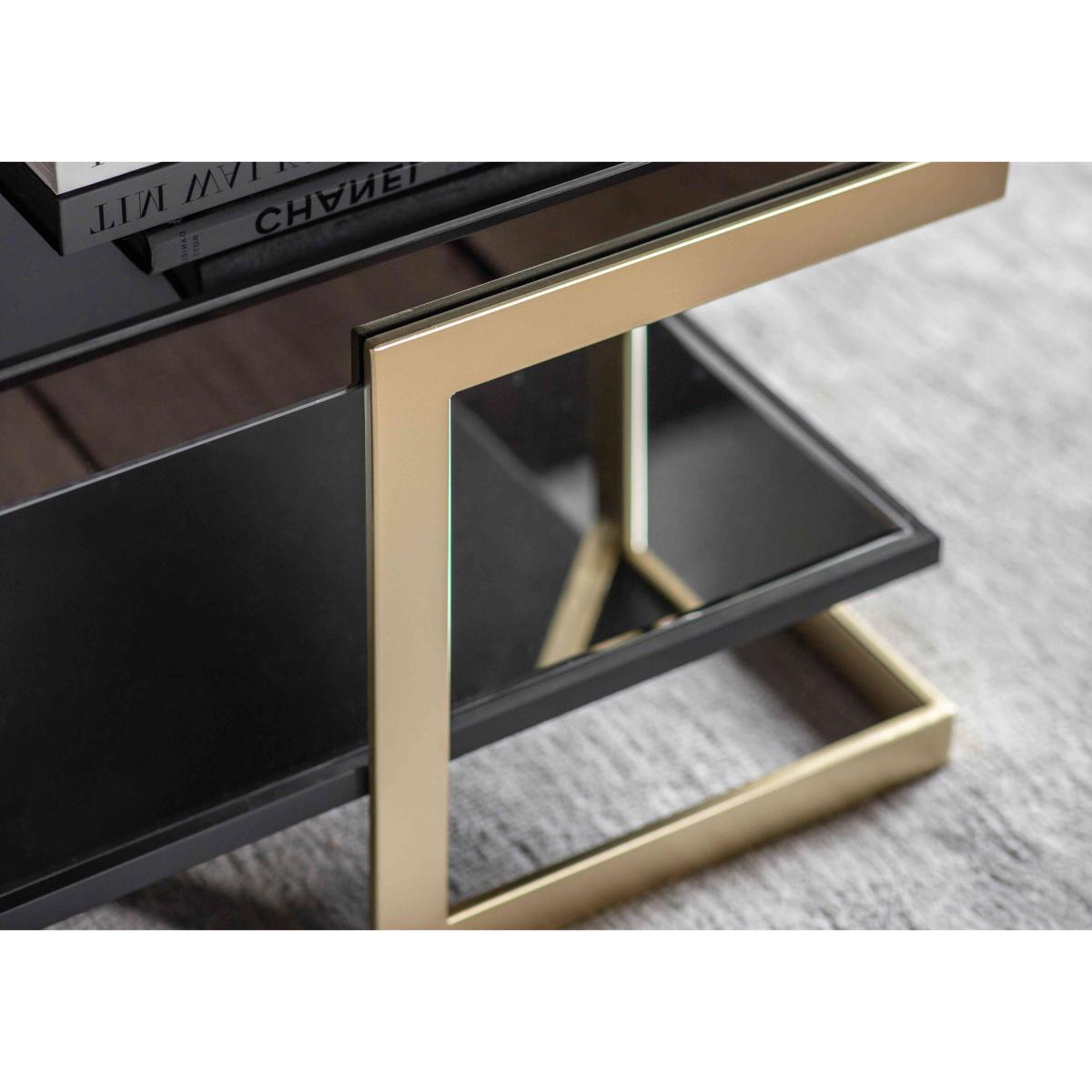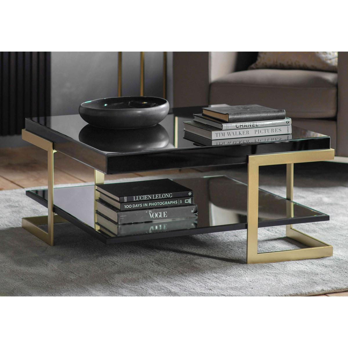 Make your living room the envy of your guests with this high-end coffee table. It looks just as good with a coffee as it does with a cocktail. Why you'll love it Sophisticated design with sleek modern styling. Bold metal base in a soft gold finish. Black glass tops add a touch of retro-glam. Also available as a matching side table. What you need to know Made from glass, iron and MDF. We recommend always using coasters. For indoor use only. Dimensions Width: 90 cm (36 inches) Height: 45 cm (18 inches) Depth: 90 cm (36 inches) Weight: 44.1 kg