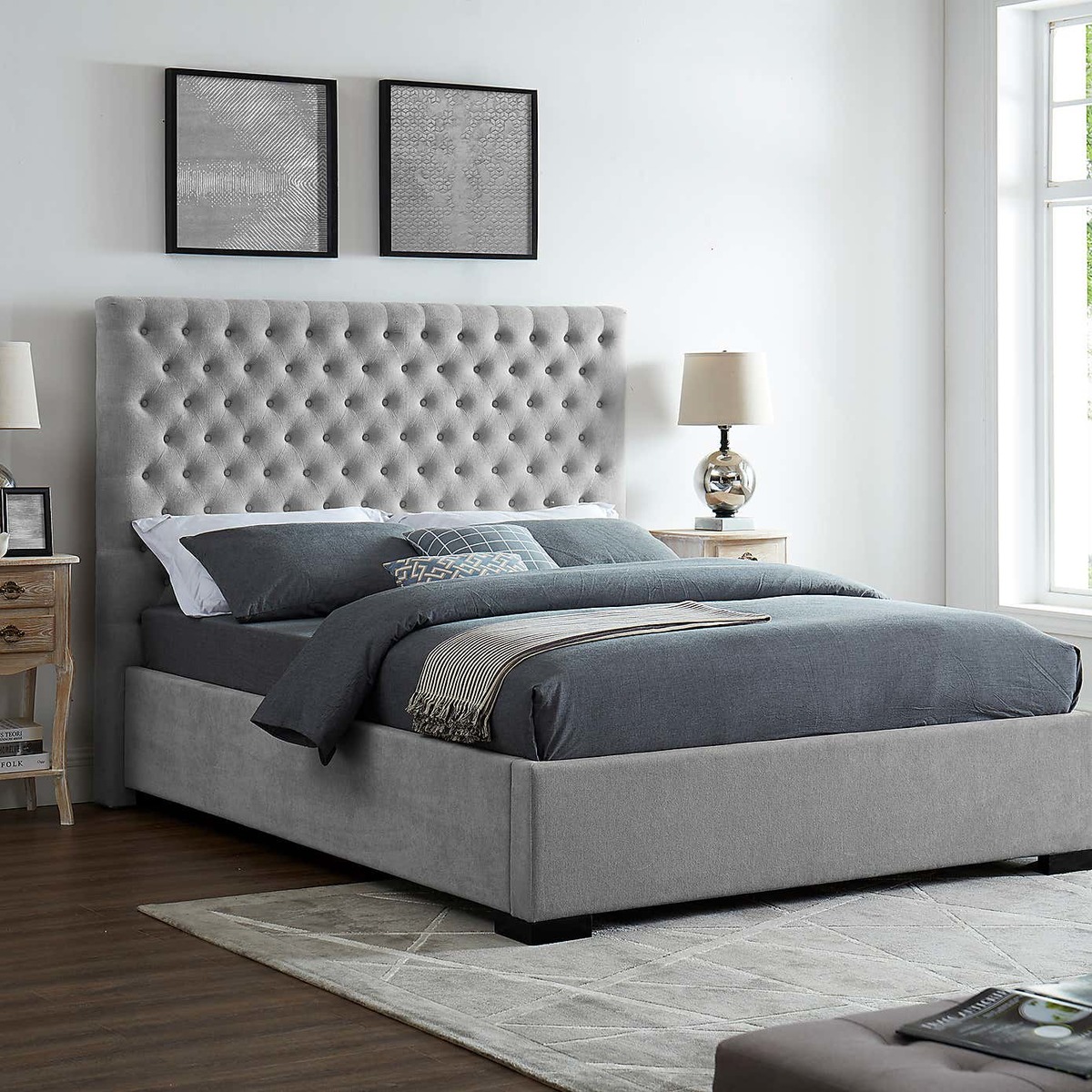 With its grandiose buttoned headboard and clean, modern styling, the Cavendish bed frame is perfect for adding a contemporary yet sophisticated feel to your bedroom. Upholstered in a high quality grey chenille fabric with a luxurious foam filled headboard, this lavish bedframe would make a stunning addition to both modern and traditional interiors.