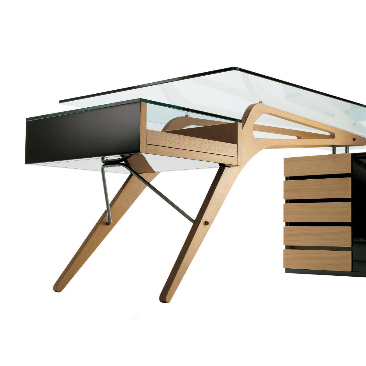 Writing desk. Plate glass top. Natural or wengé-stained oak frame. Natural or wengé-stained oak drawers and compartment with glossy lacquered parts in black.