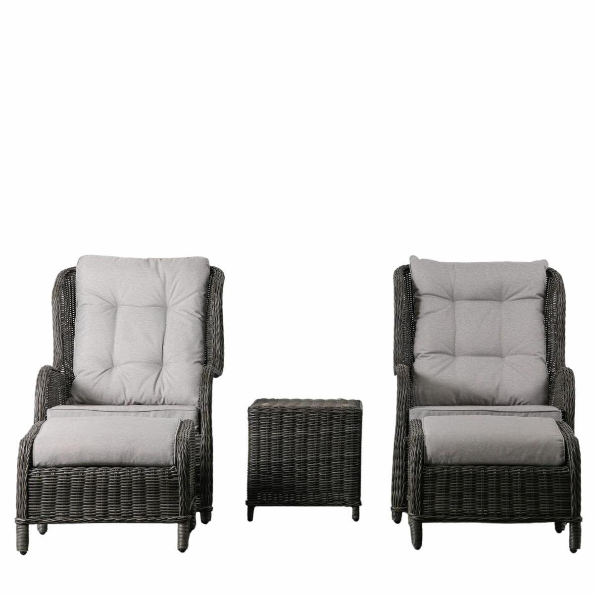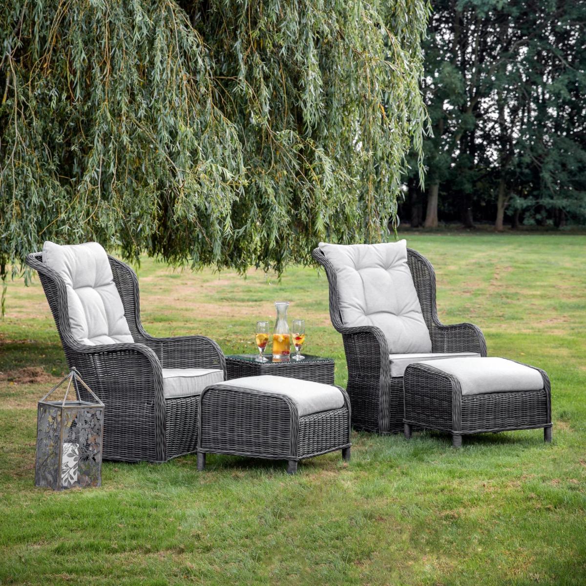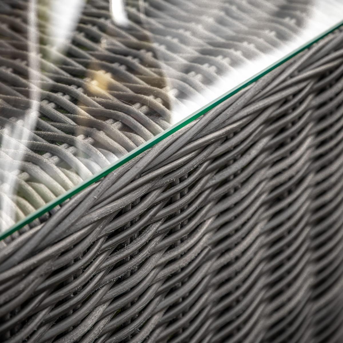 This High Back Lounge Set features two high back chairs, two ottoman footstools and a side table, to give a perfect set for two people to relax in comfort. They are crafted from all weather 5mm PE rattan with a hand woven mixed half round/full round weave in a washed grey finish. For comfort, the chairs and ottomans have luxurious showerproof cushions in a soft grey colour to complement the colour of the rattan. The frames are powder coated aluminium and the table top is tempered glass. The set is also available in a natural finish. The collection offers a great range of pieces, so you can select the ones to suit your requirements. Material: Aluminium. Colour: Grey.