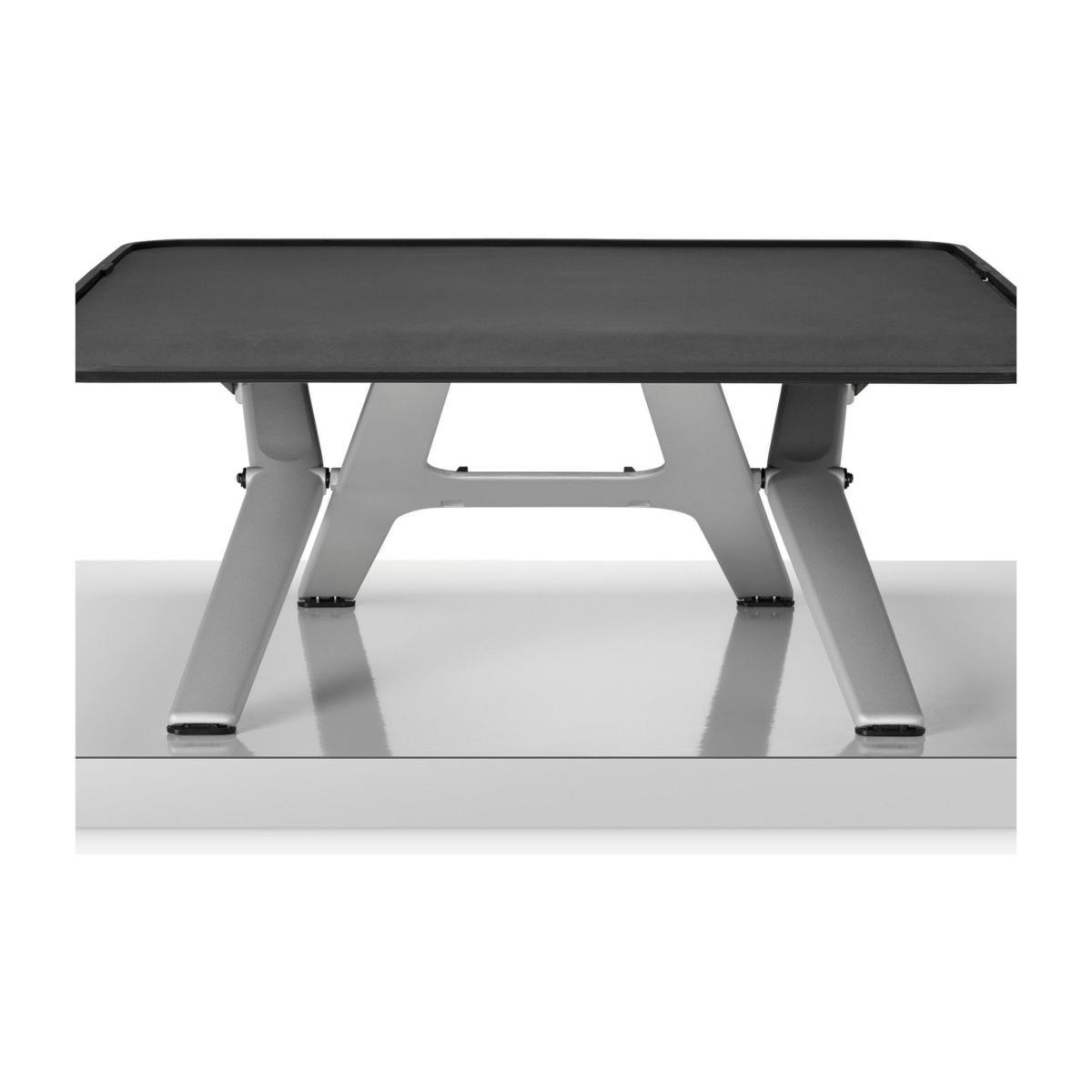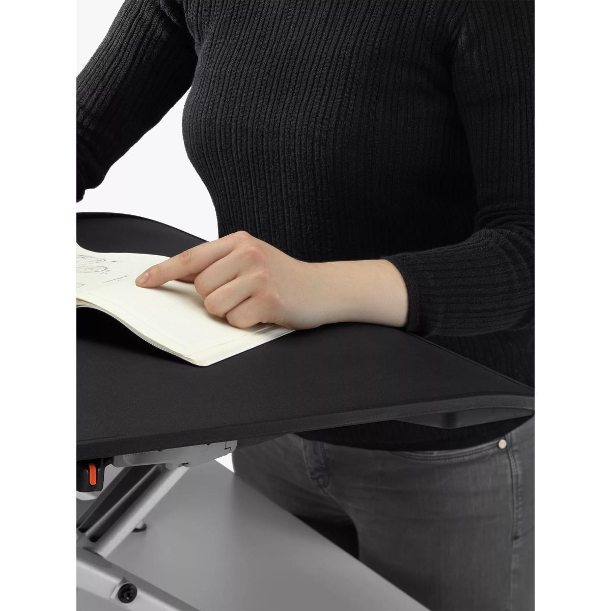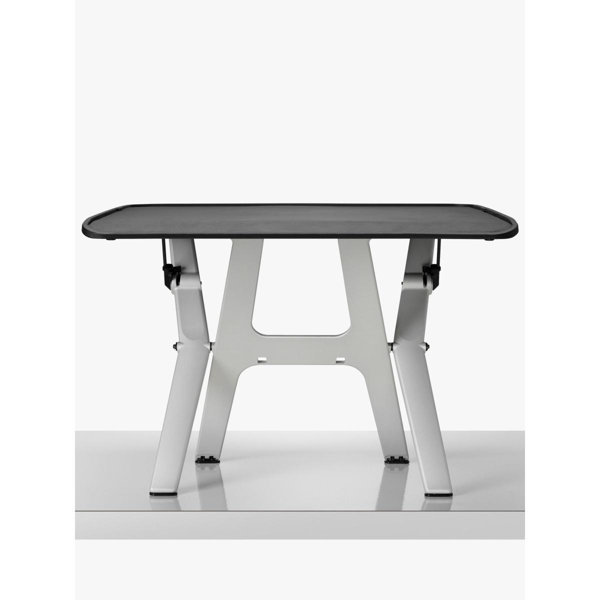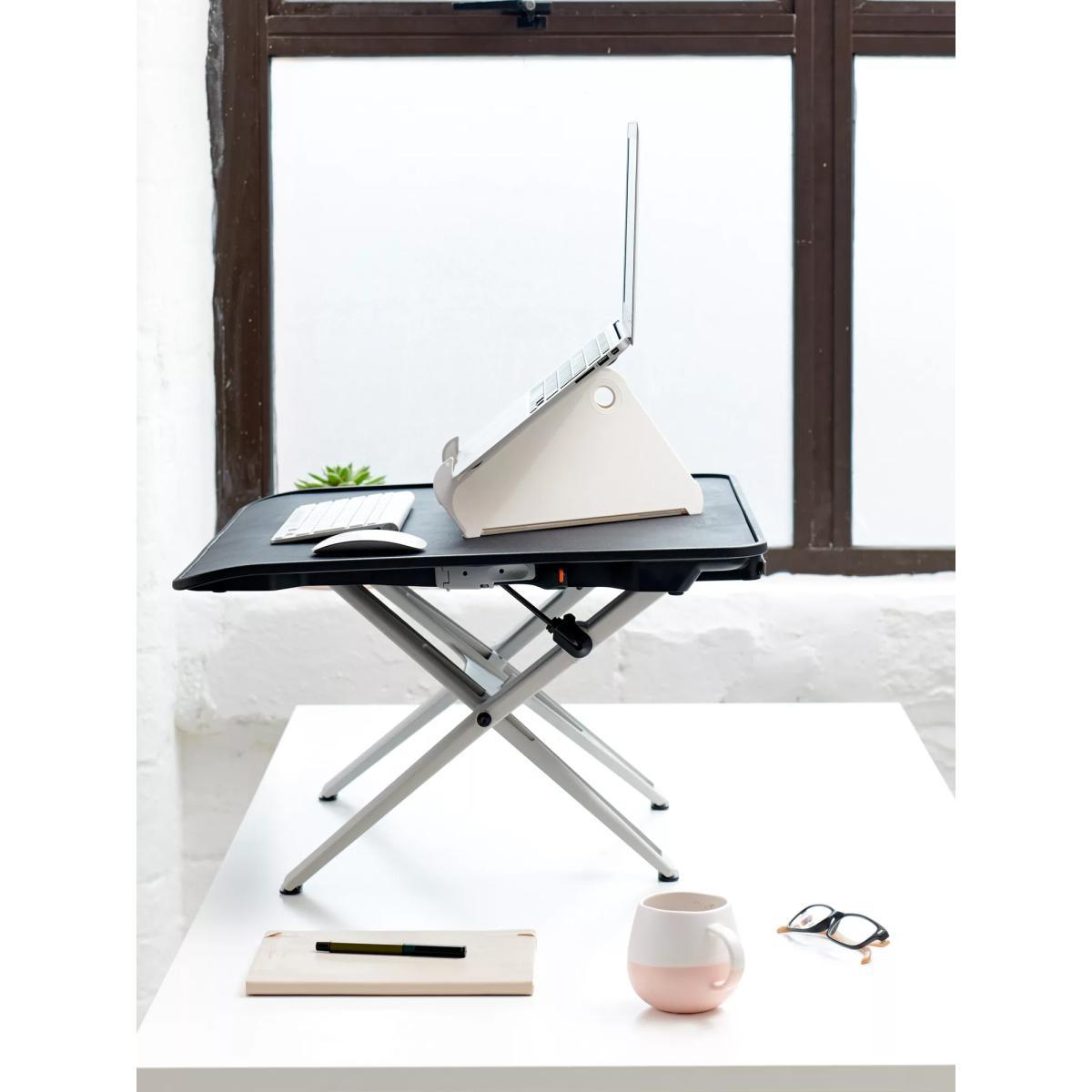 Made in the UK Part of Design Icons Transform your ordinary fixed-height desk into a more productive and healthy work station with this sit-to-stand riser. Moving throughout the working day is key to physical comfort. With nine height positions, it's easy to adjust with a safe lock-latch operating mechanism. Just use it in conjunction with a dynamic monitor arm or laptop support. Totally portable, sit-to-stand working becomes possible on any surface, anywhere Easy to carry, easy to store Perfect for home working as it can be repositioned or removed whenever required A large, stable working surface made from soft-touch, durable fabric Integrated cable management clips Usable work area: W63.3 x D49.2cm. Height range: 2.6-43.6cm